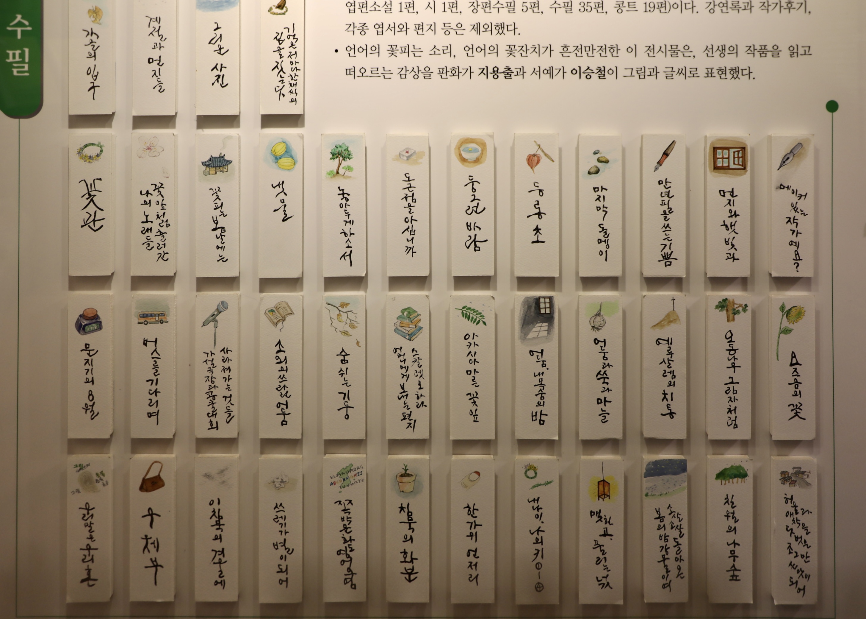 추려낸 말과 글로 이뤄진 동영상과 여러 작품에서 추겨낸 글이 새겨진 각종 패널을 만날 수 있다.