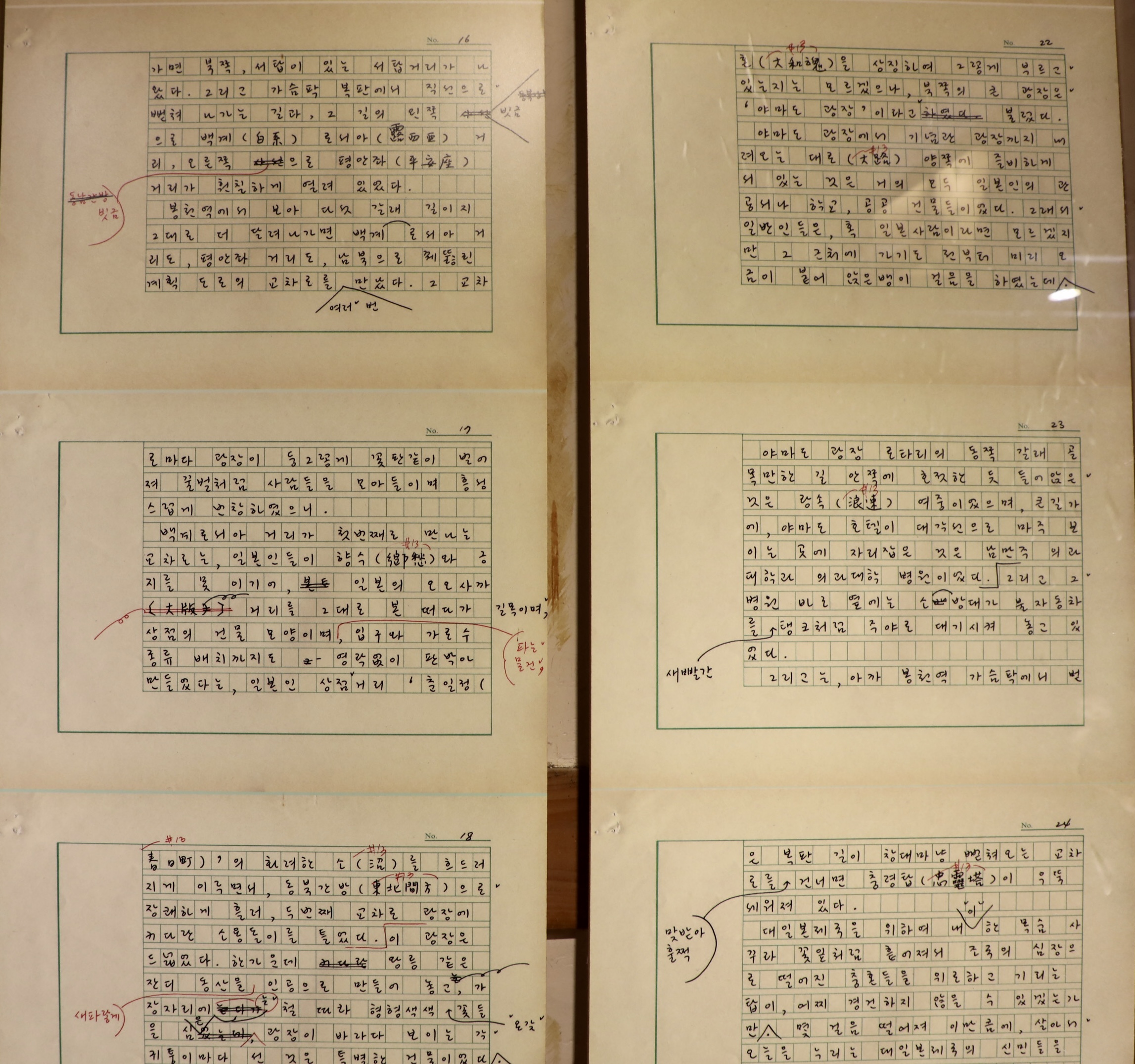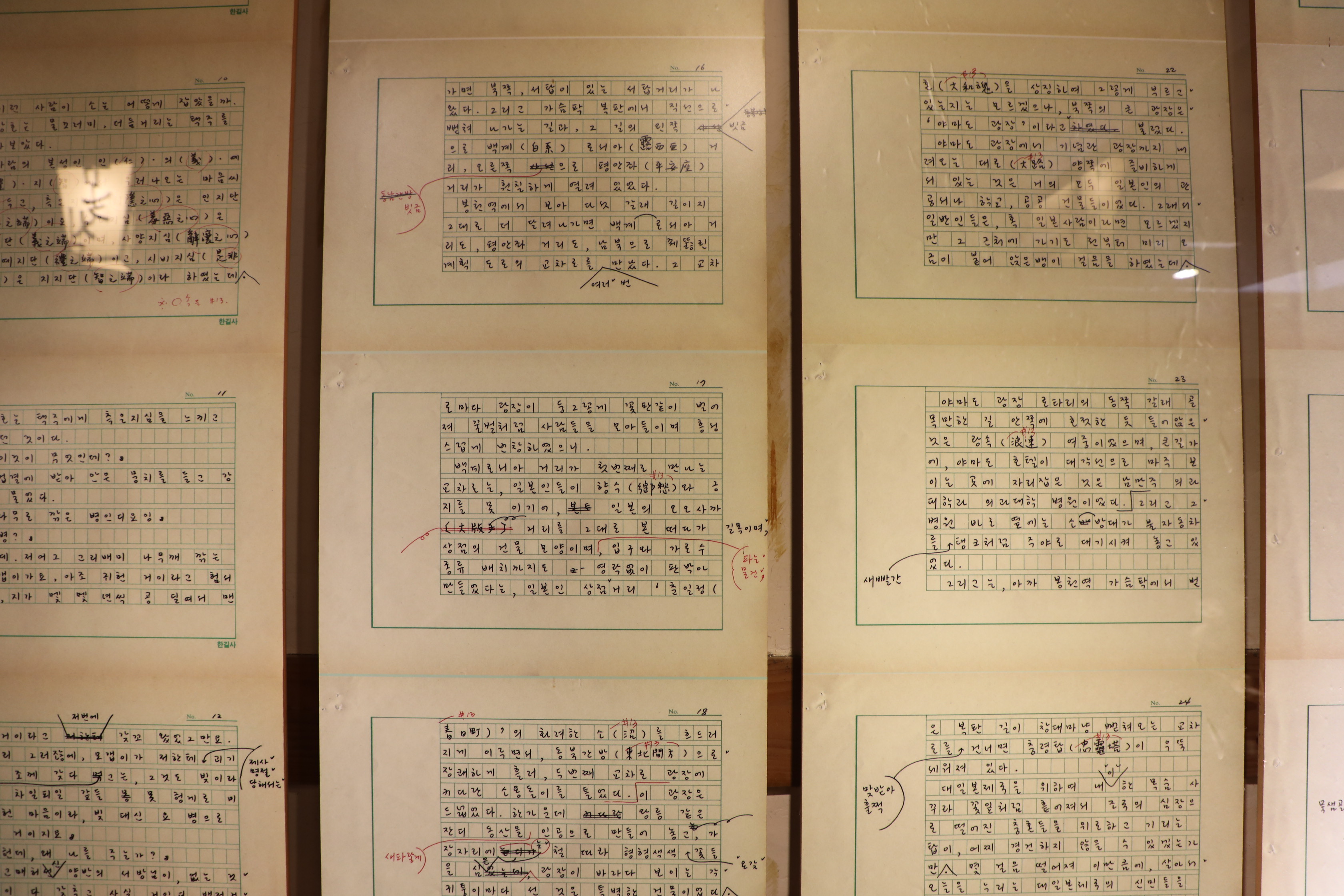 원고지에 작품을 쓰고 퇴고를 거듭한 끝에 작품을 넘긴다.