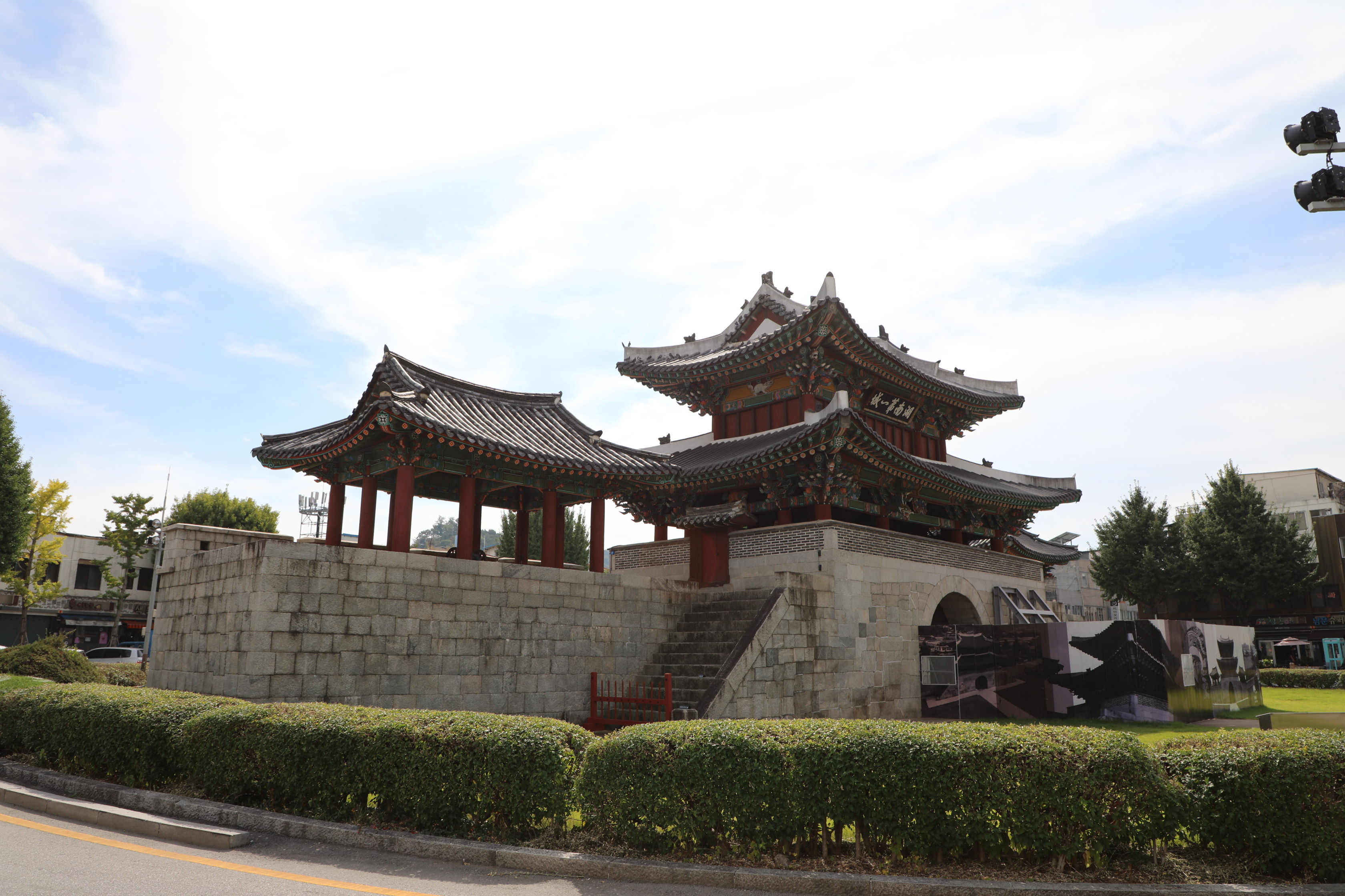 풍남문 누각 양 옆으로 같은 크기의 누각이 하나씩 더 있다.