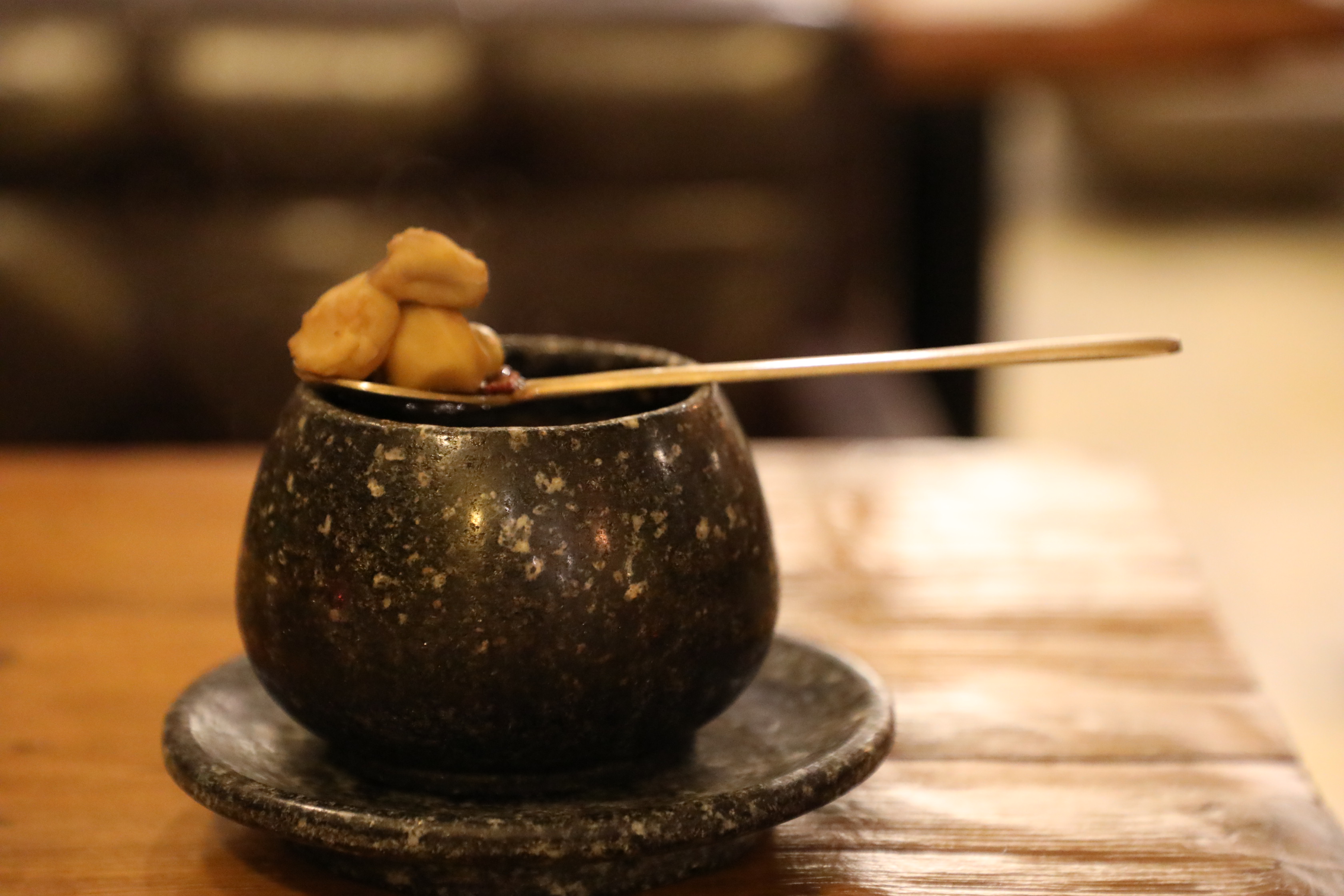 숟가락을 들어 쌍화탕에 넣었더니 많은 밤이 들려 나온다.
