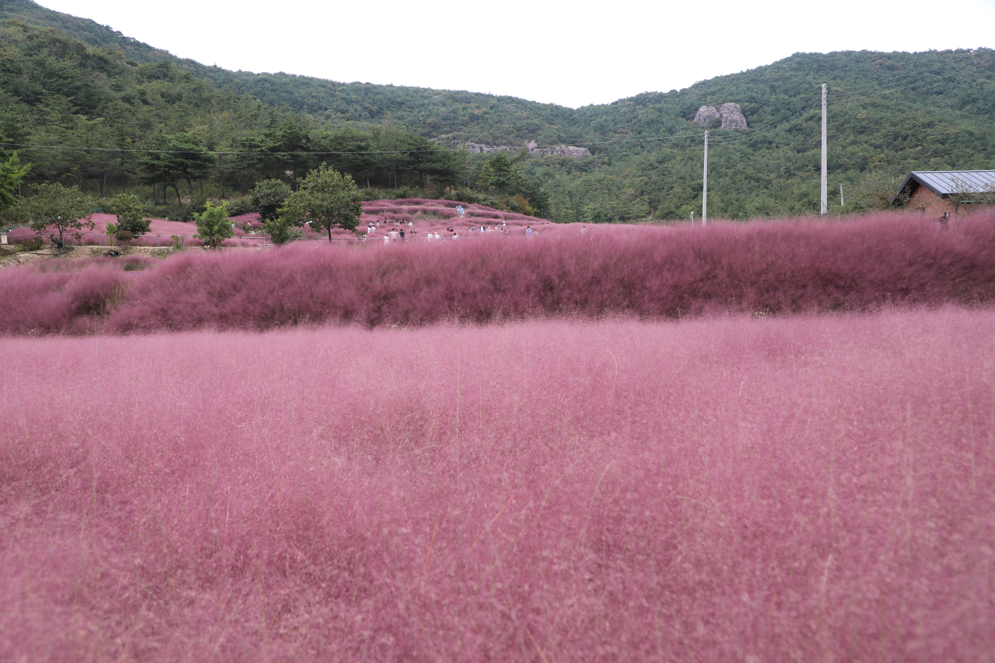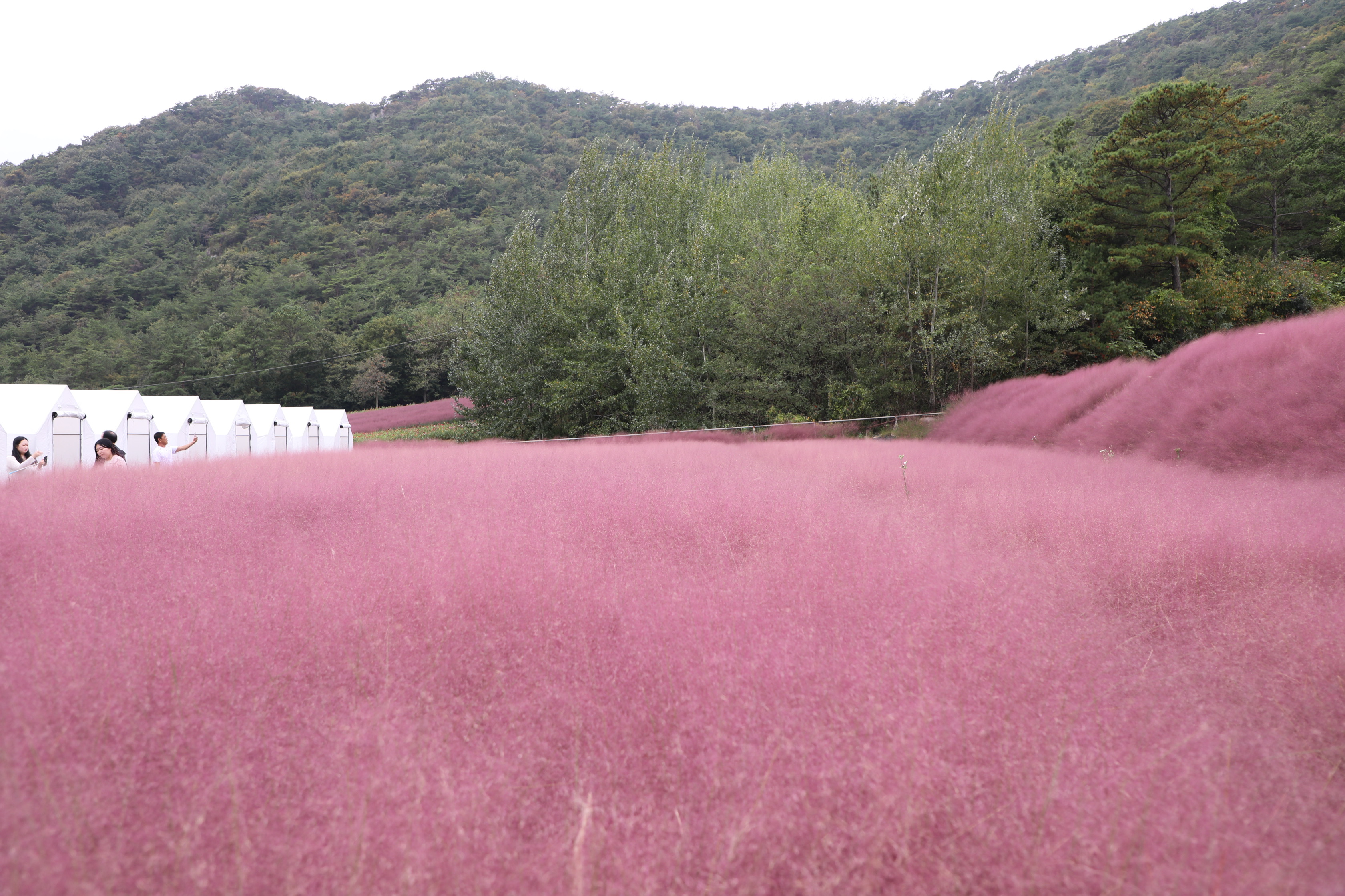 밭 둑에도 핑크 뮬리를 심어 붉은 파도가 치는 느낌이다.