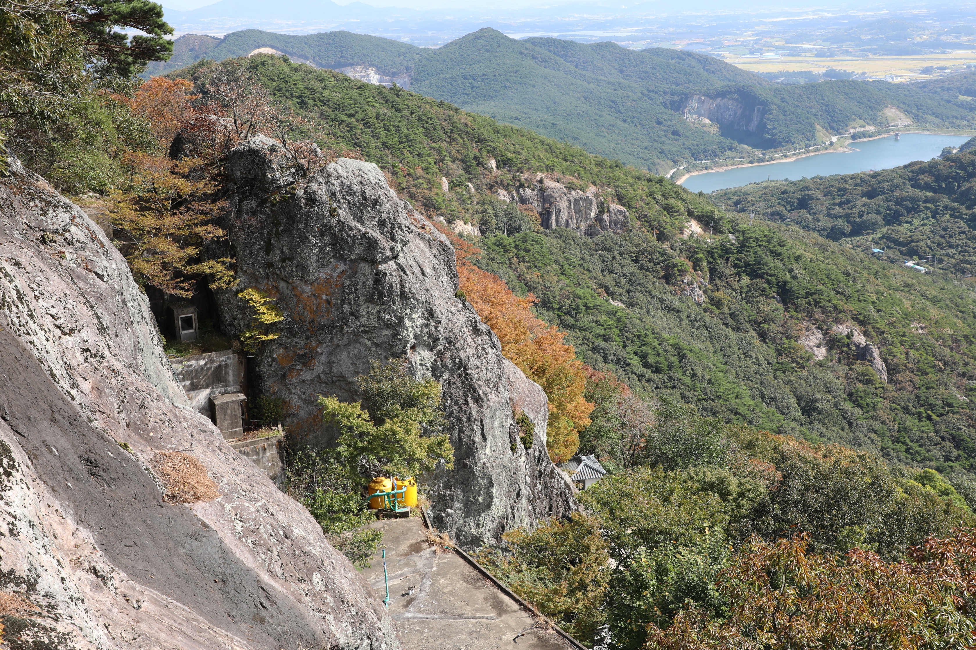 소요사 절이 바위 우측으로 지붕이 살짝 보이고 가운데는 아래쪽엔 시멘트로 된 천장도 보인다.