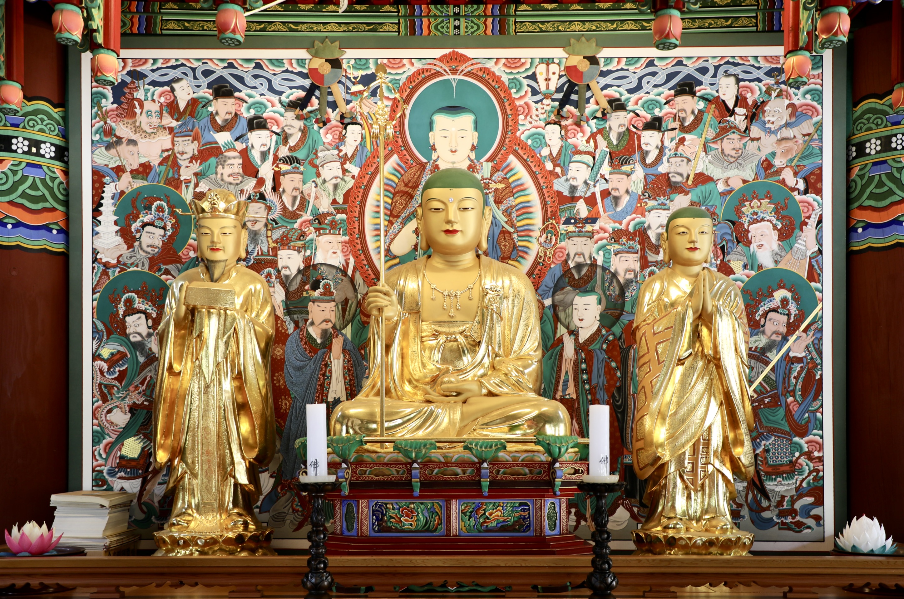 불단 위쪽으로 운룡(雲龍)과 여의주 모양의 구슬을 장식한 닫집을 만들어 놓아 불상에 엄숙한 분위기를 자아낸다.