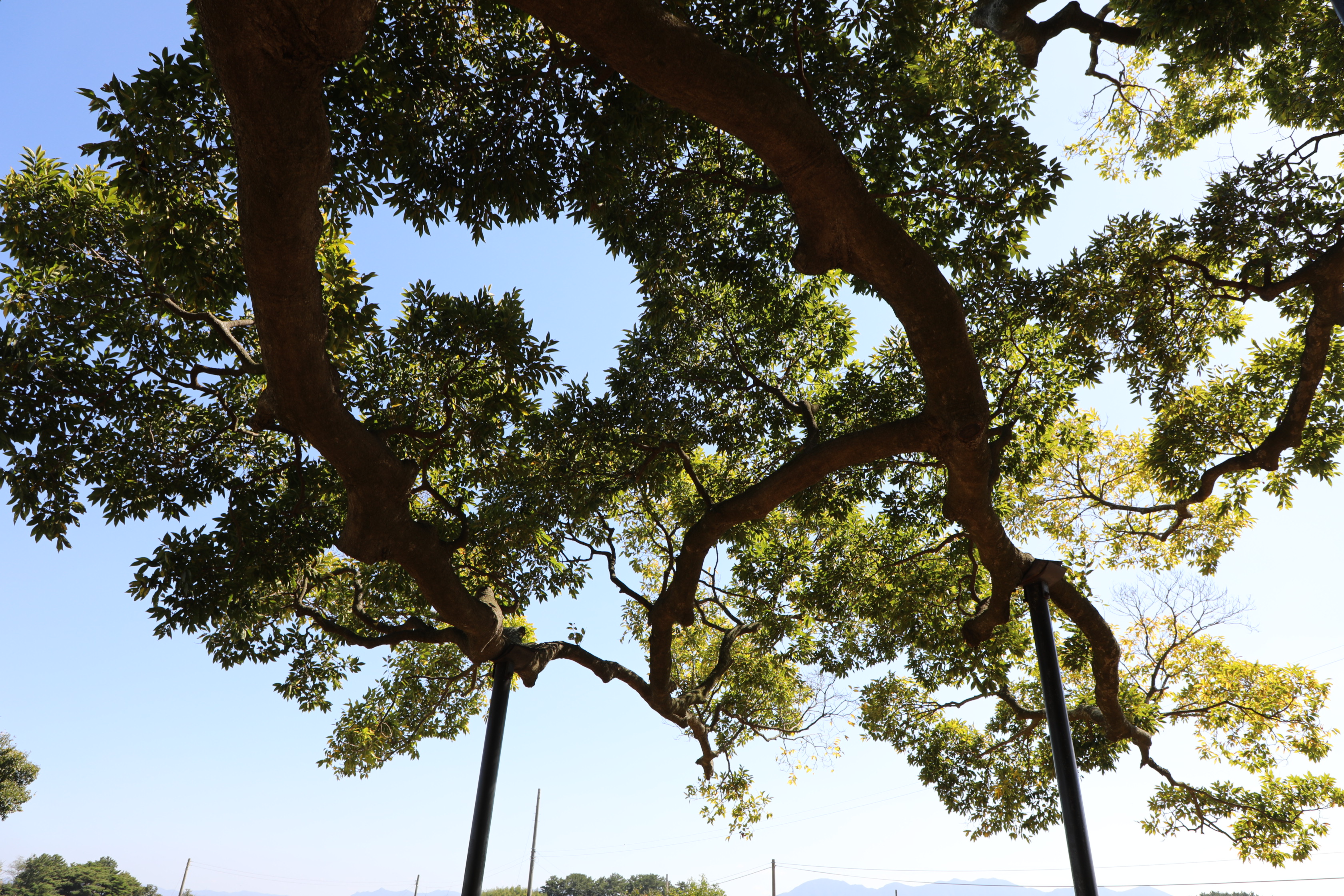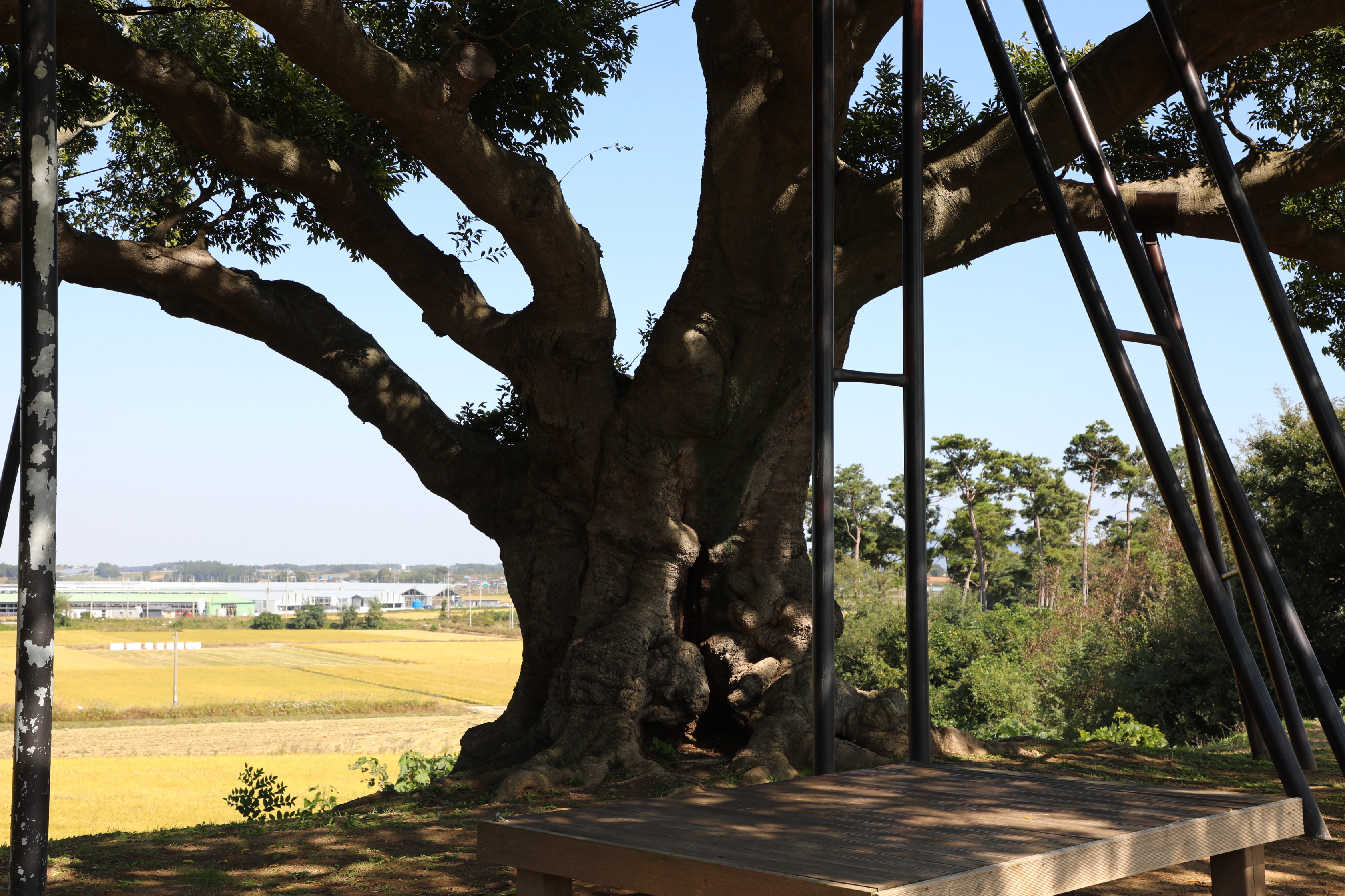 수동리 팽나무도 비바람에 훼손되지 않도록 가지를 보강하는 쇠기둥으로 보강했다.