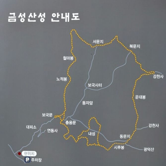 연동사에서 금성산성 오토캠핑장을 지나 제법 오래 걸을 다음에야 금성산성 주차장에 도착했다.