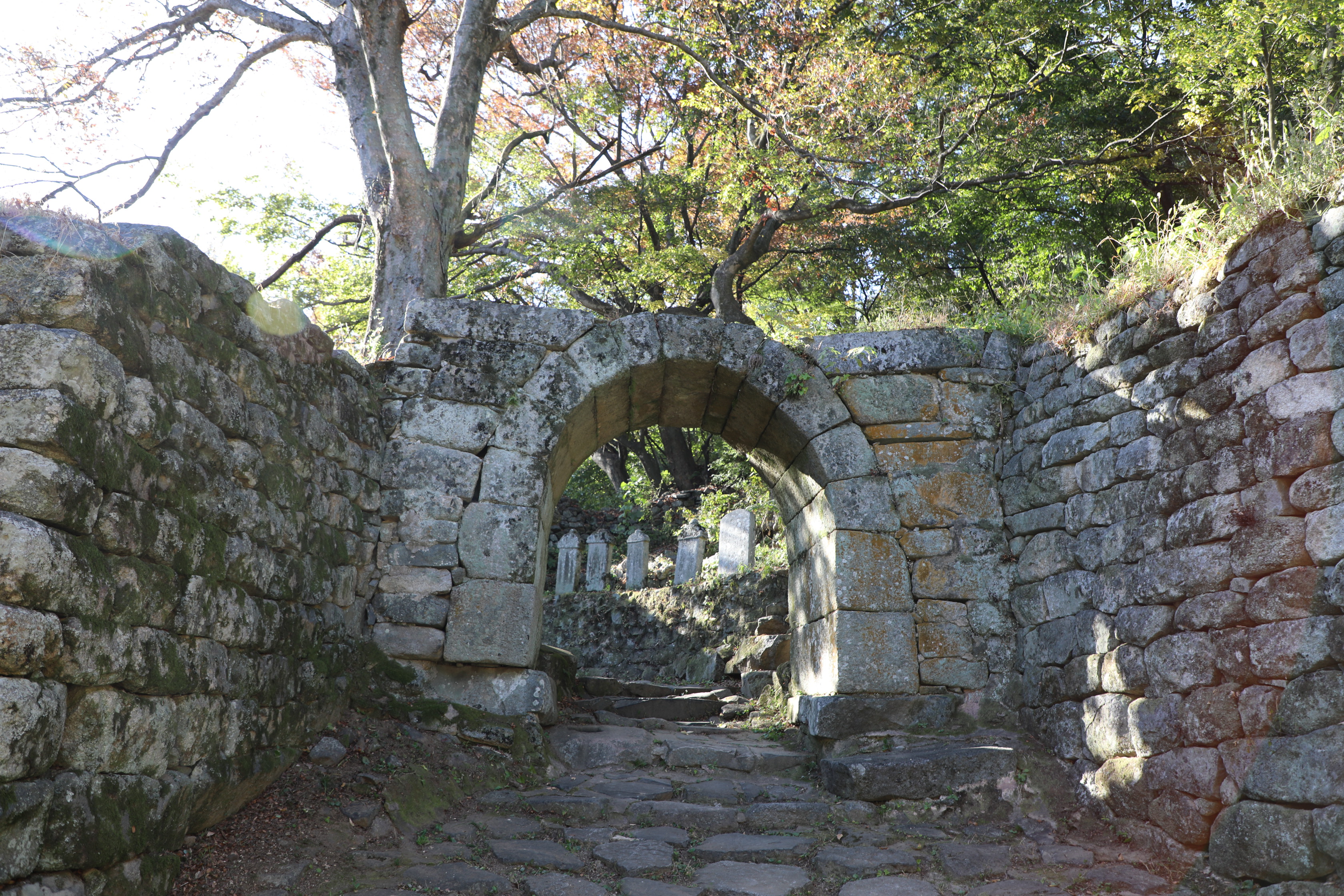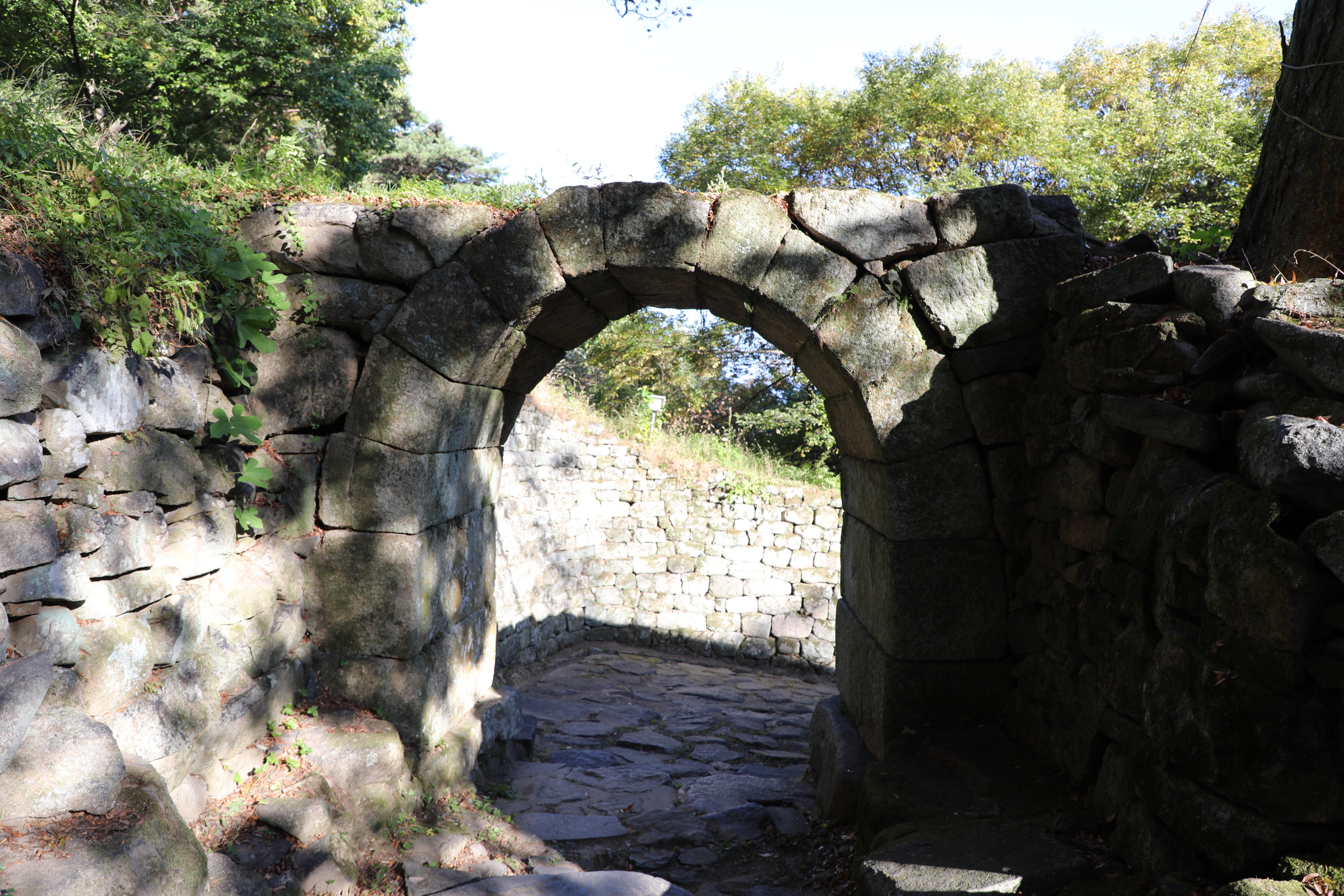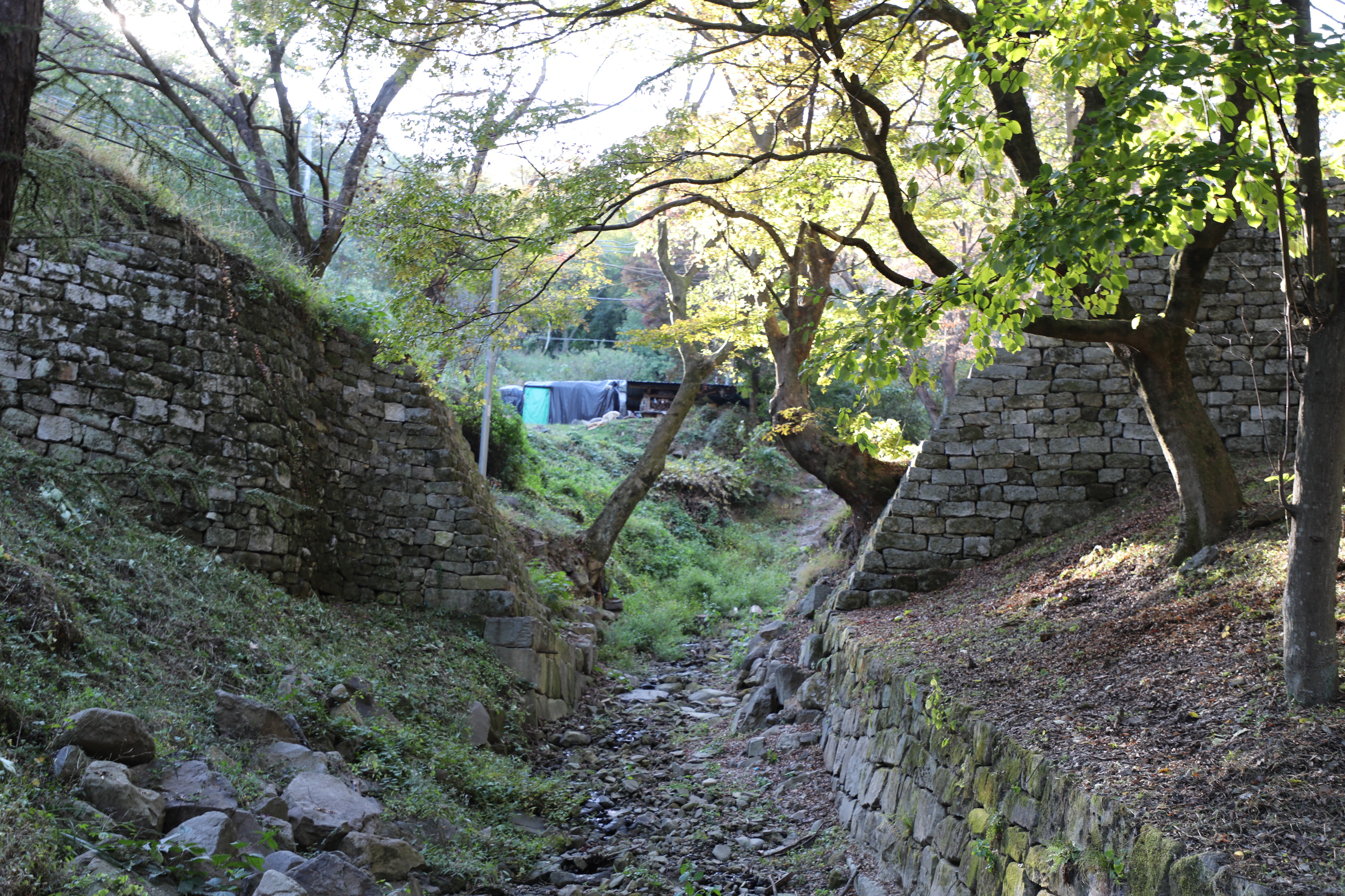 산성의 계곡을 지나는 성벽은 물의 흐름을 방해하지 않게 물길을 내준다.
