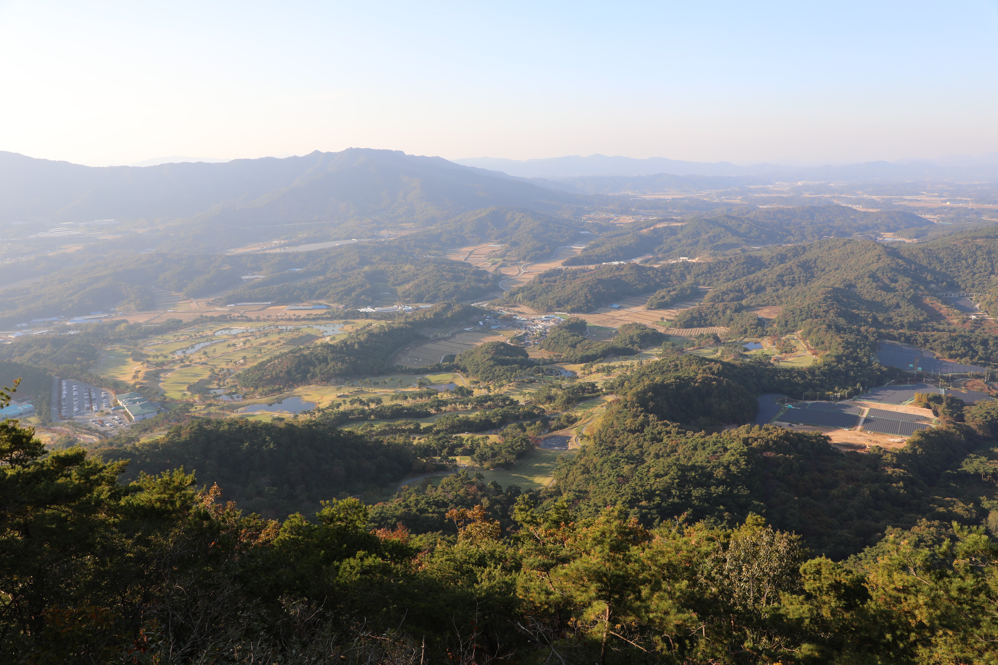 산 아래 골프장이 보이고 오른쪽엔 태양열 집열판이 검에 보인다.