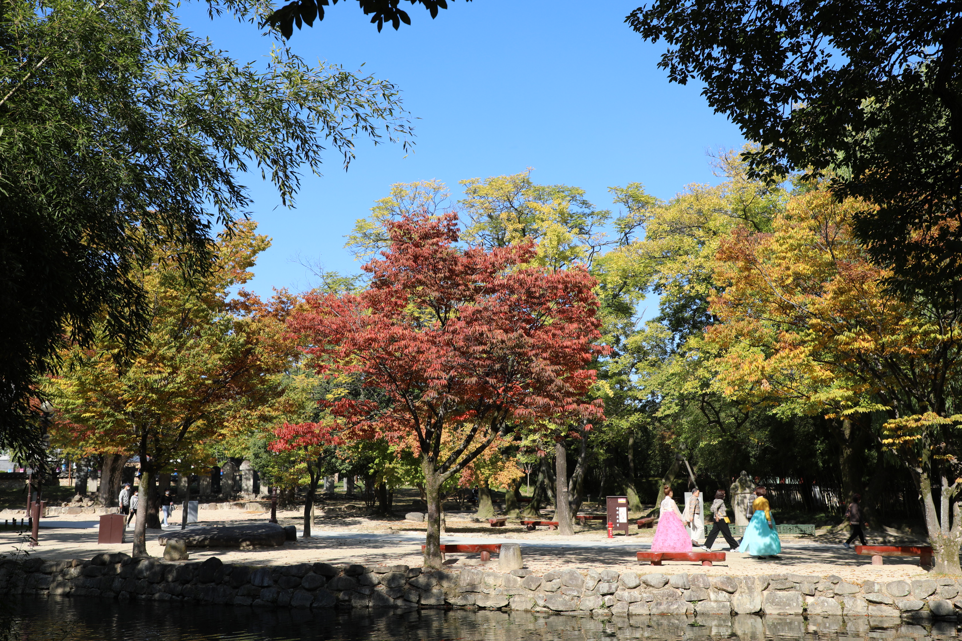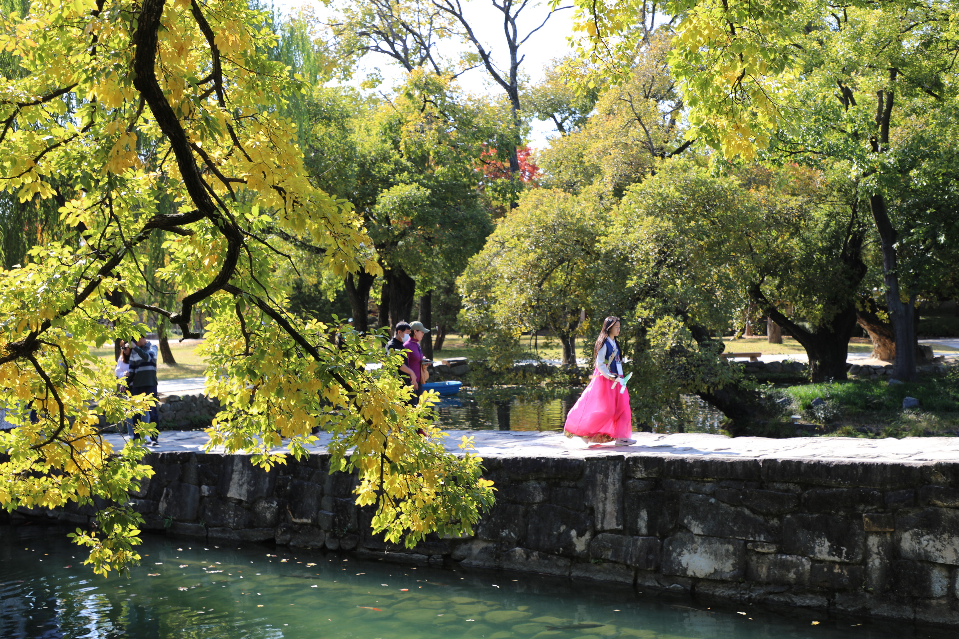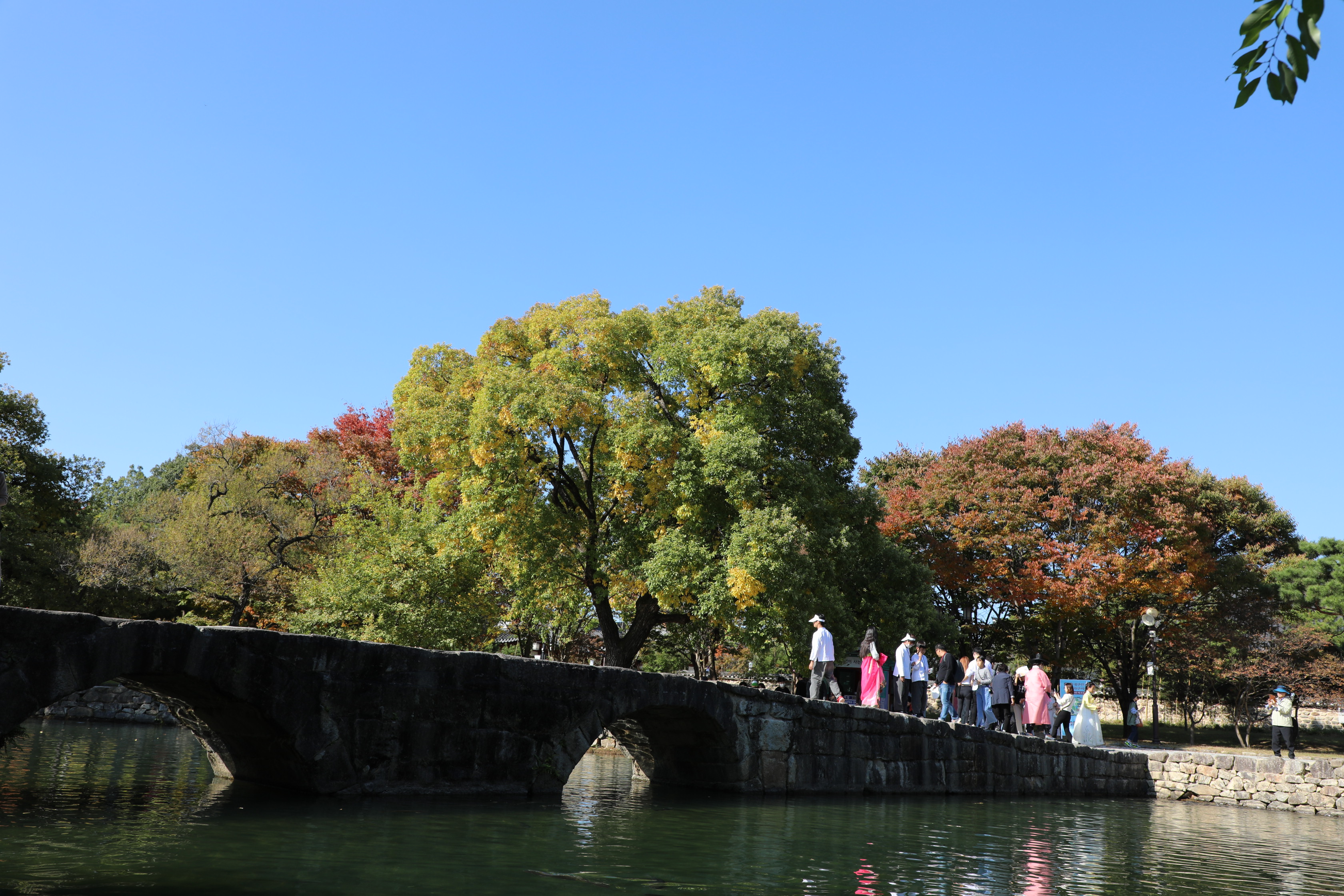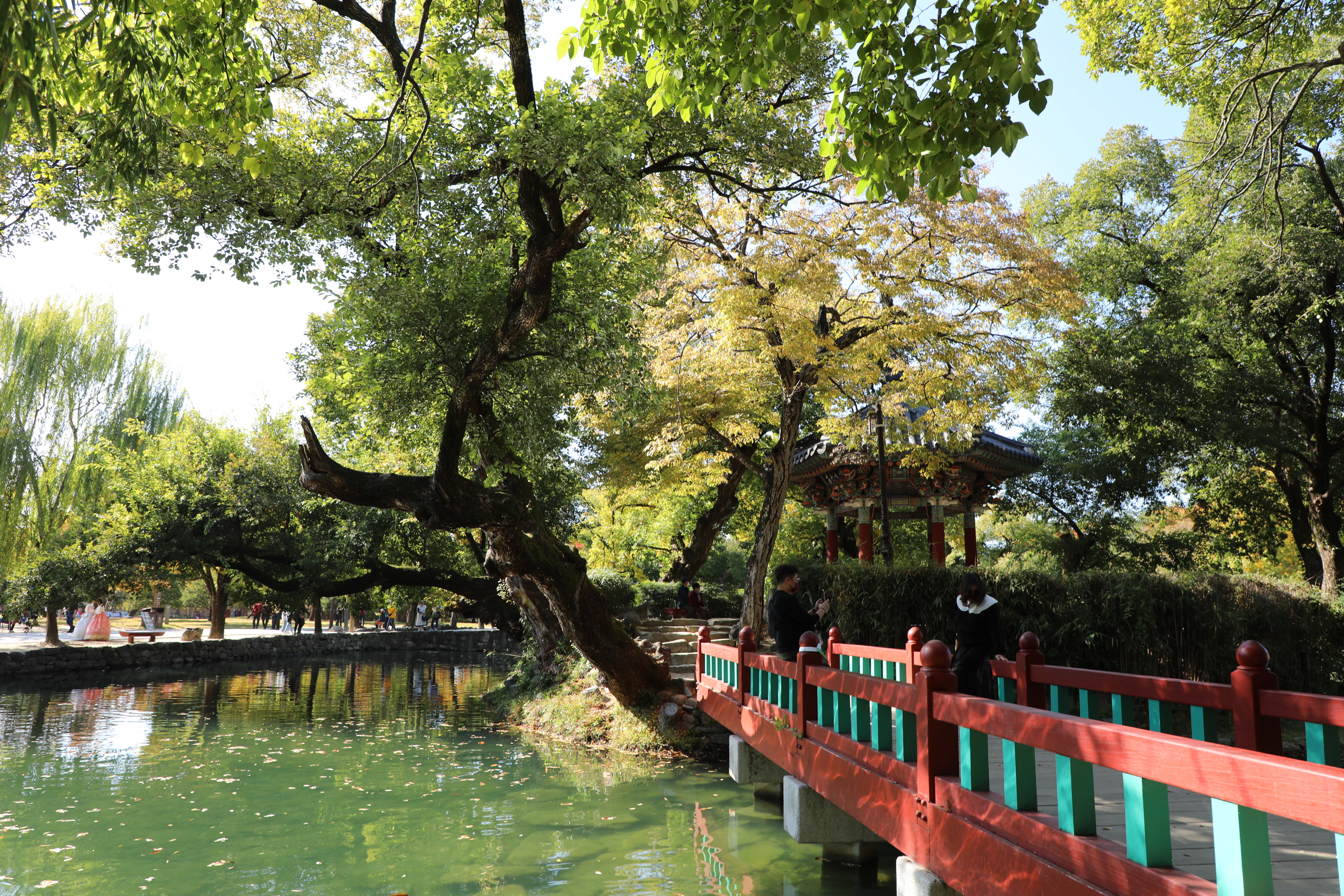 이제 막 단풍이 드는 나뭇잎 건너 오작교를 지나는 여성의 한복이 곱게 느껴진다.