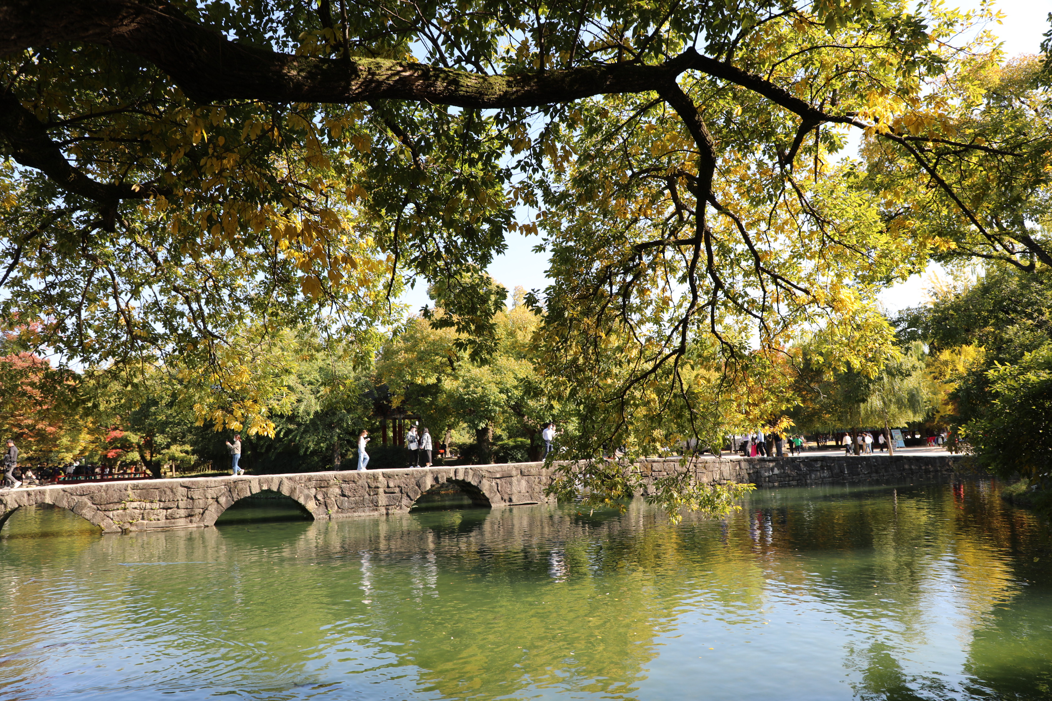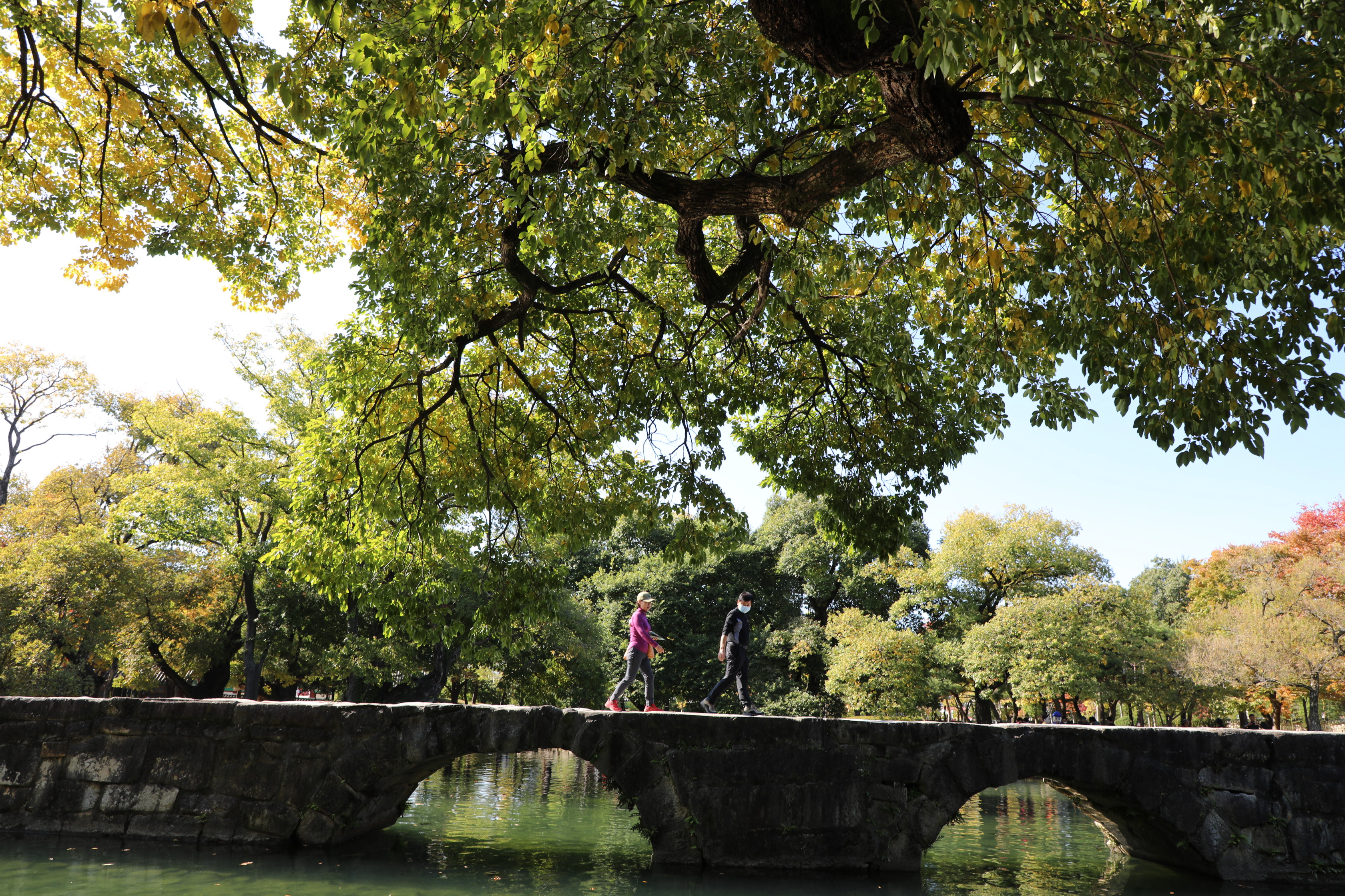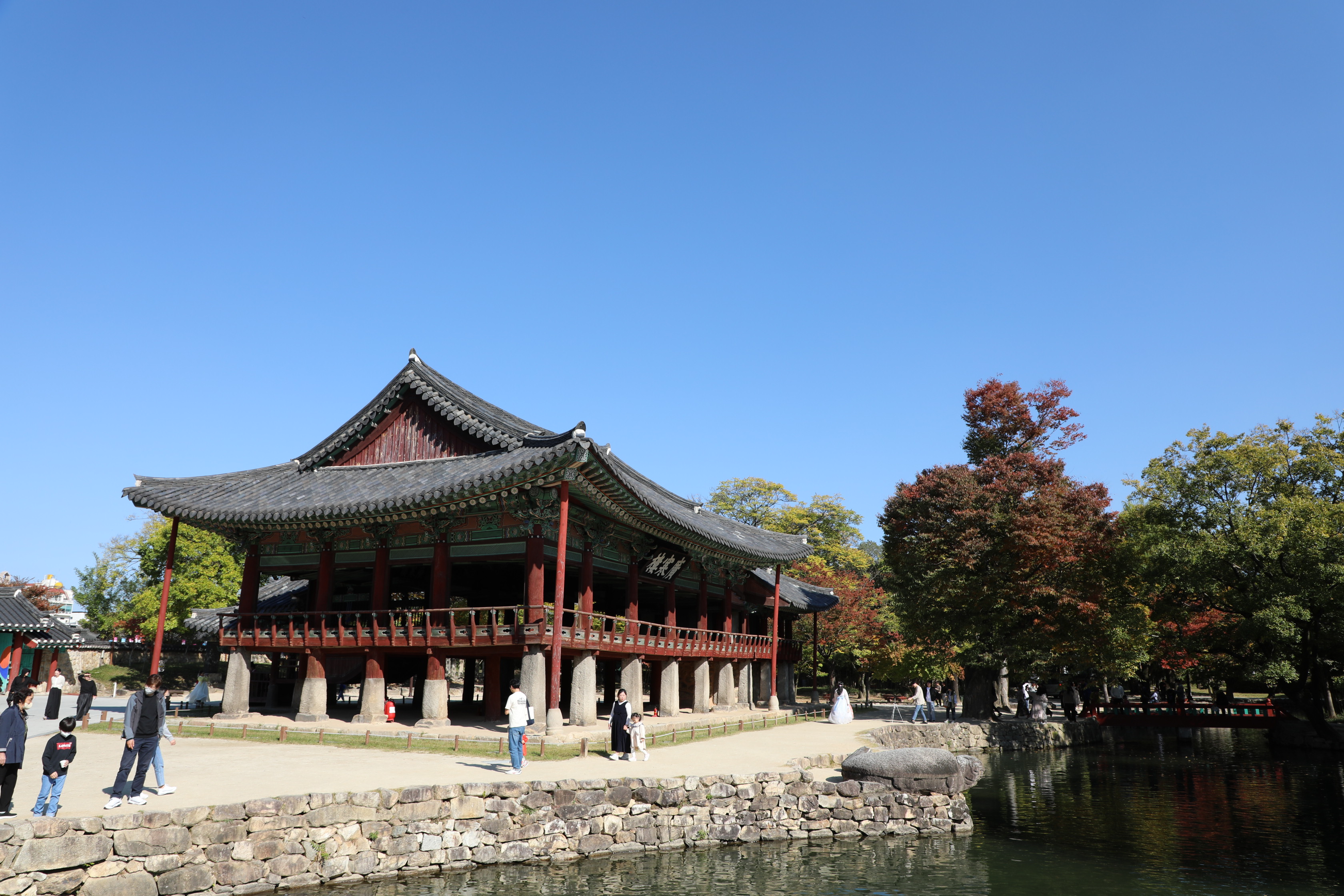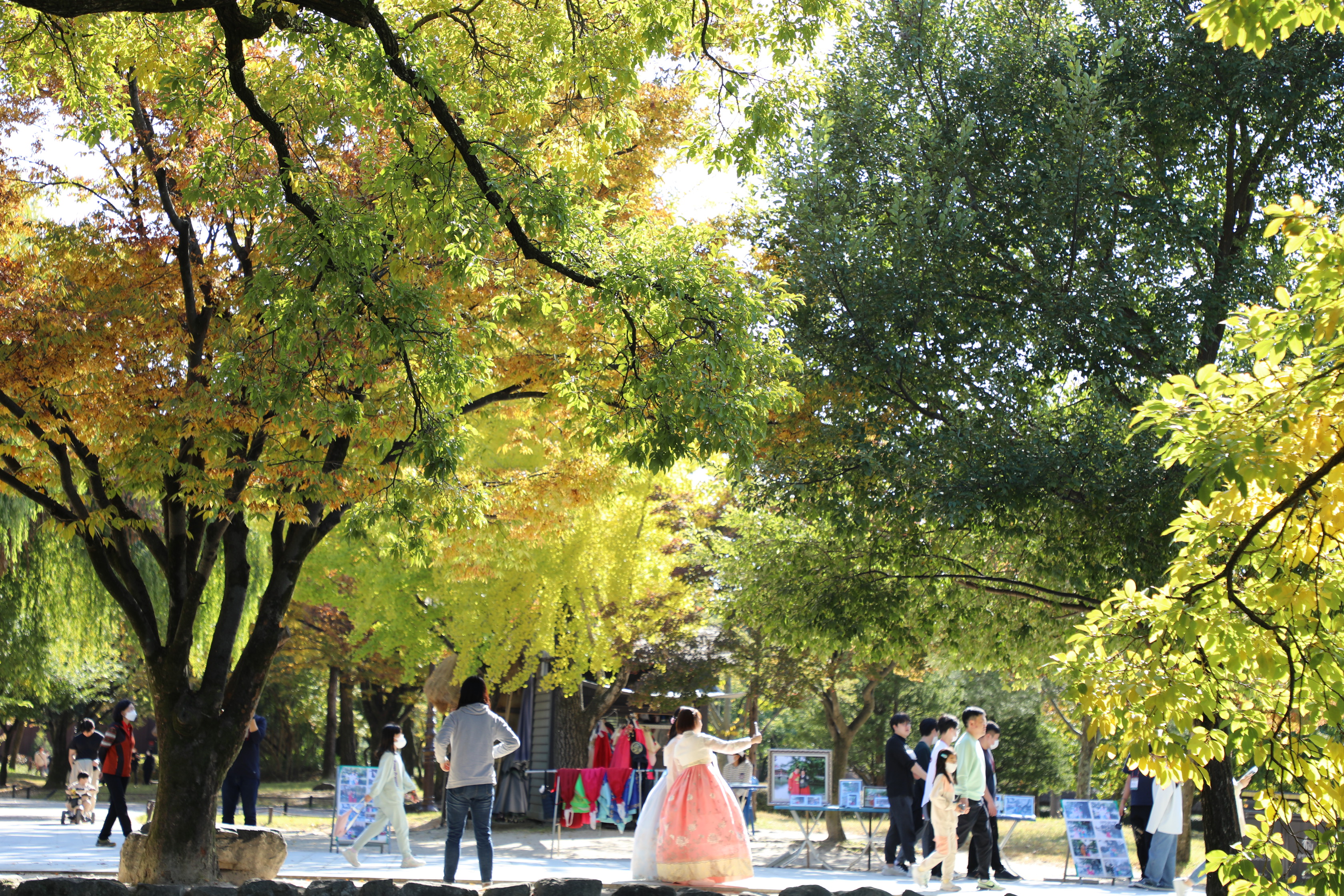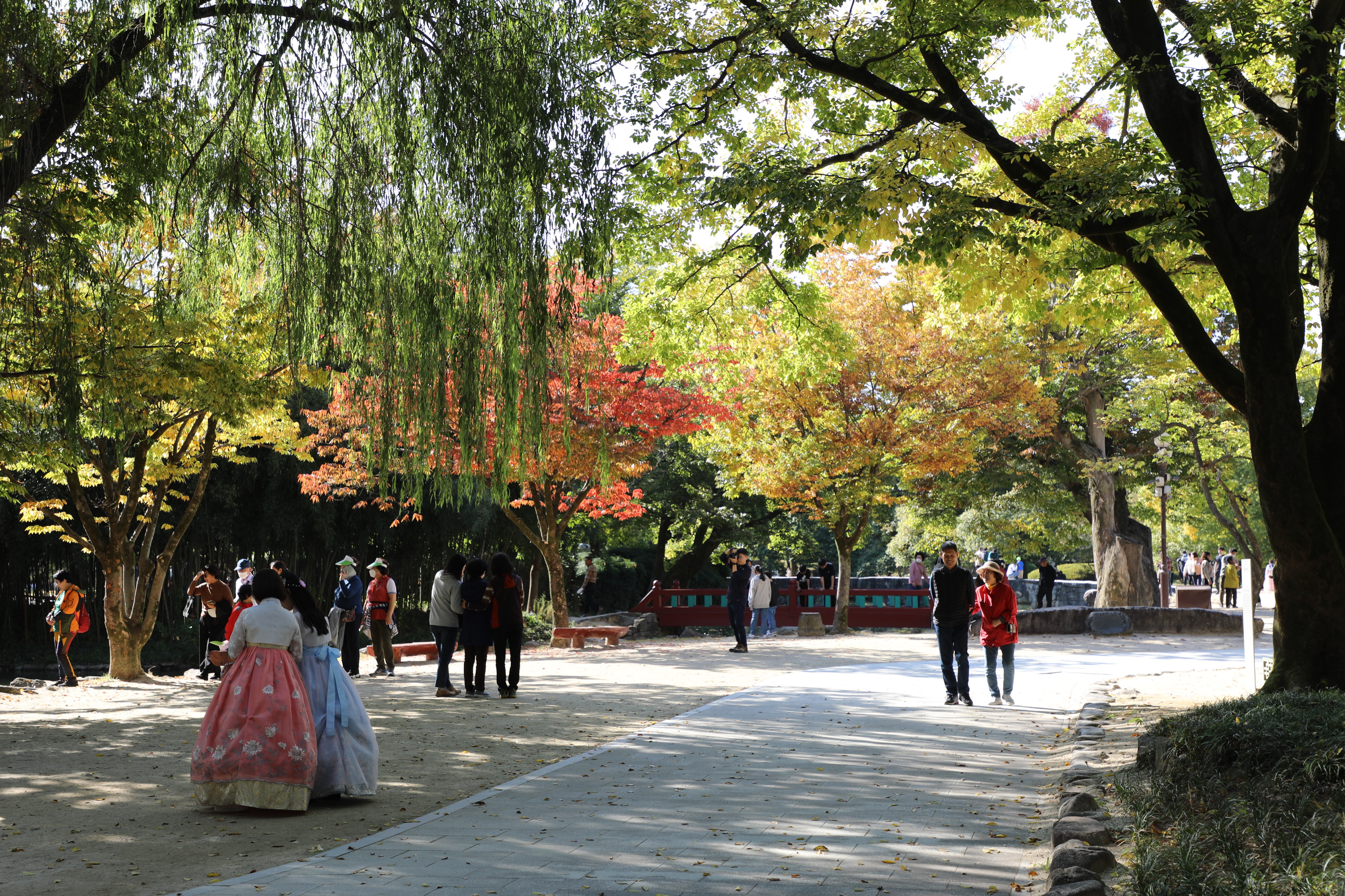 이제 막 단풍이 드는 나뭇잎 건너 오작교를 지나는 여성의 한복이 곱게 느껴진다.