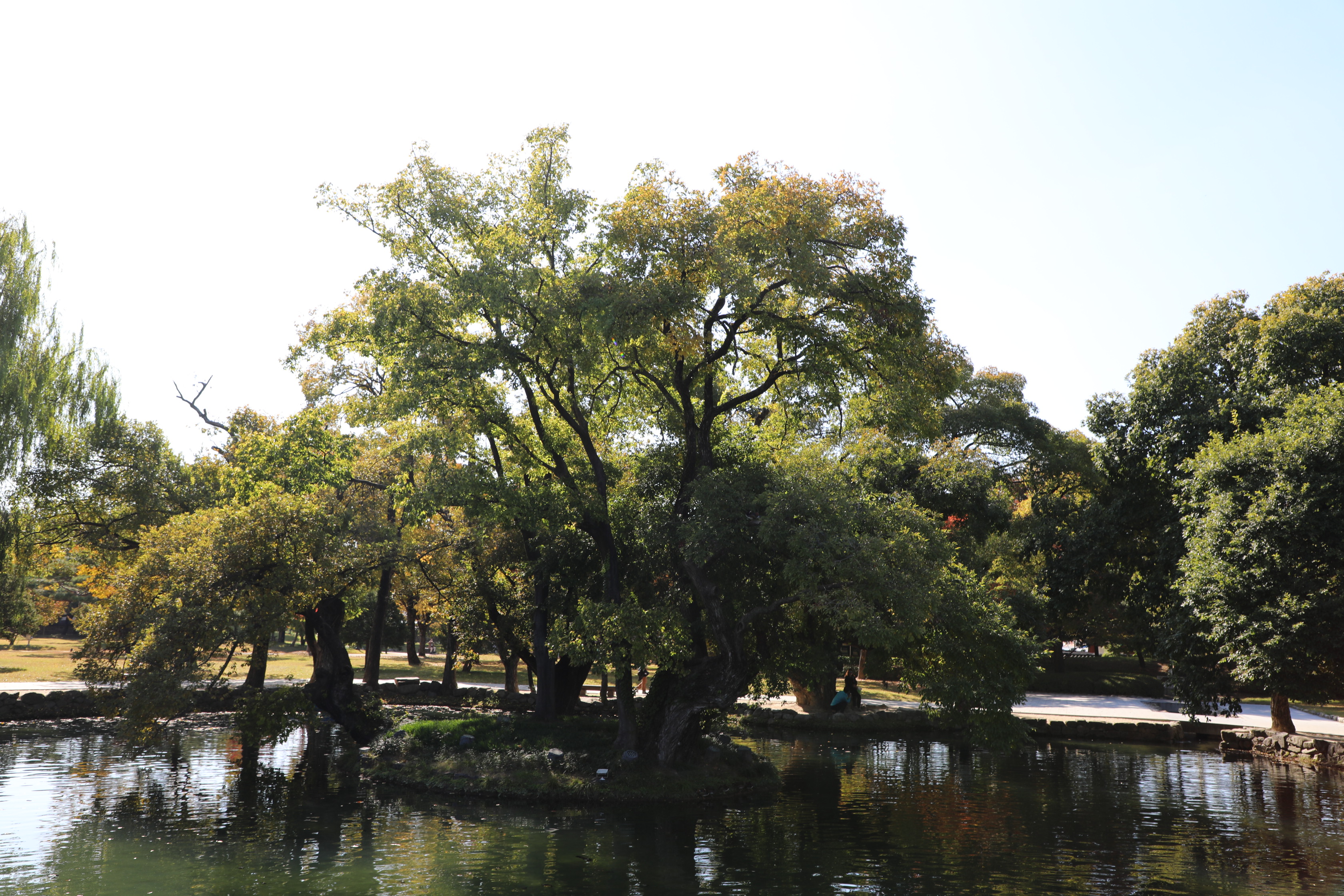 연못에 있는 세 개의 섬에서 잘 자라는 나무는 연못 밖 나무와 자연스러운 조화를 보인다.