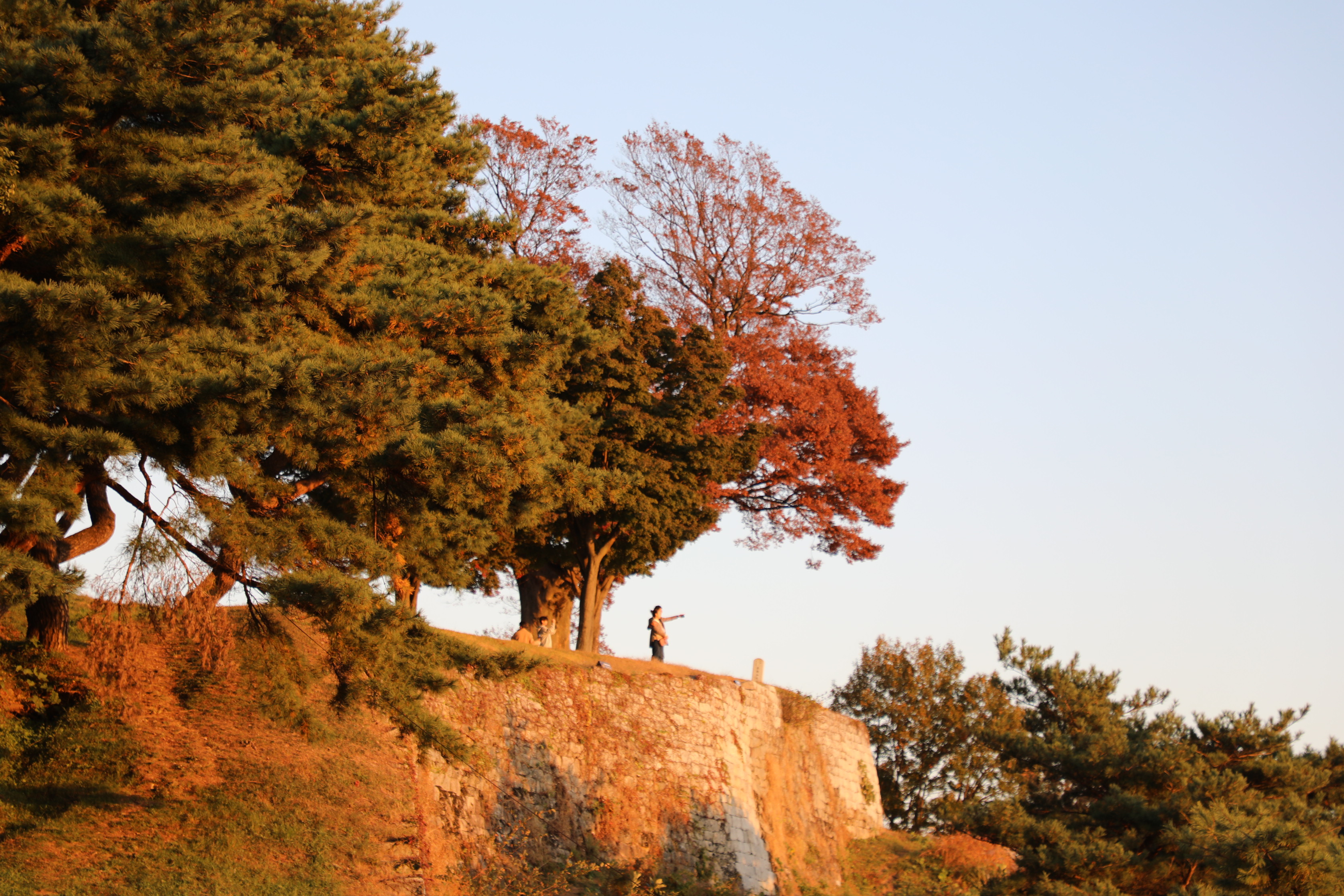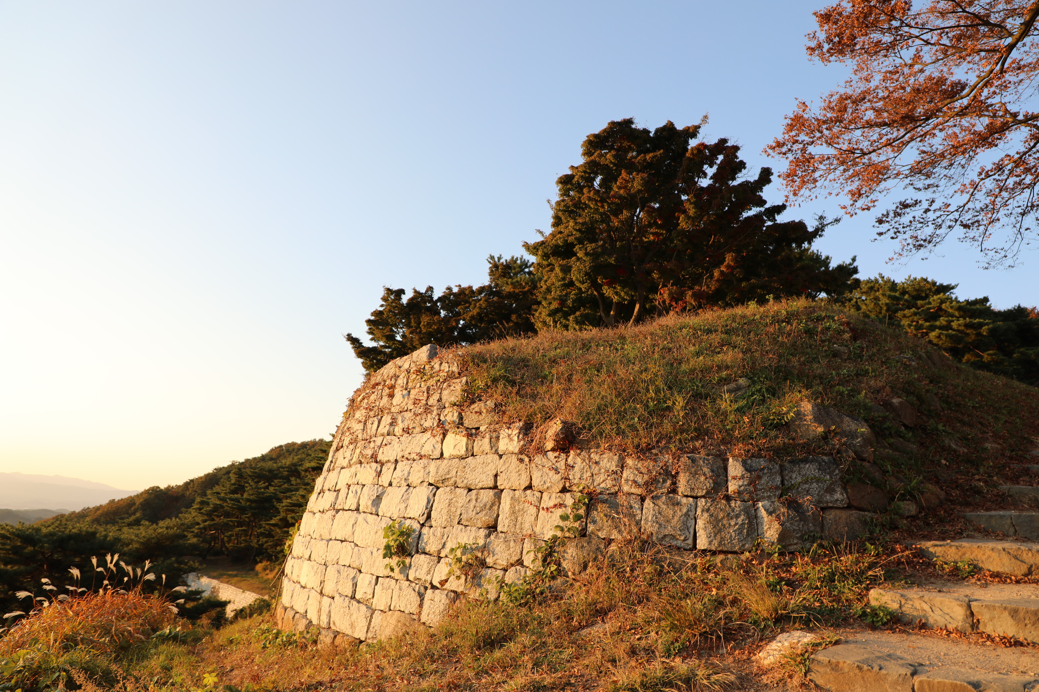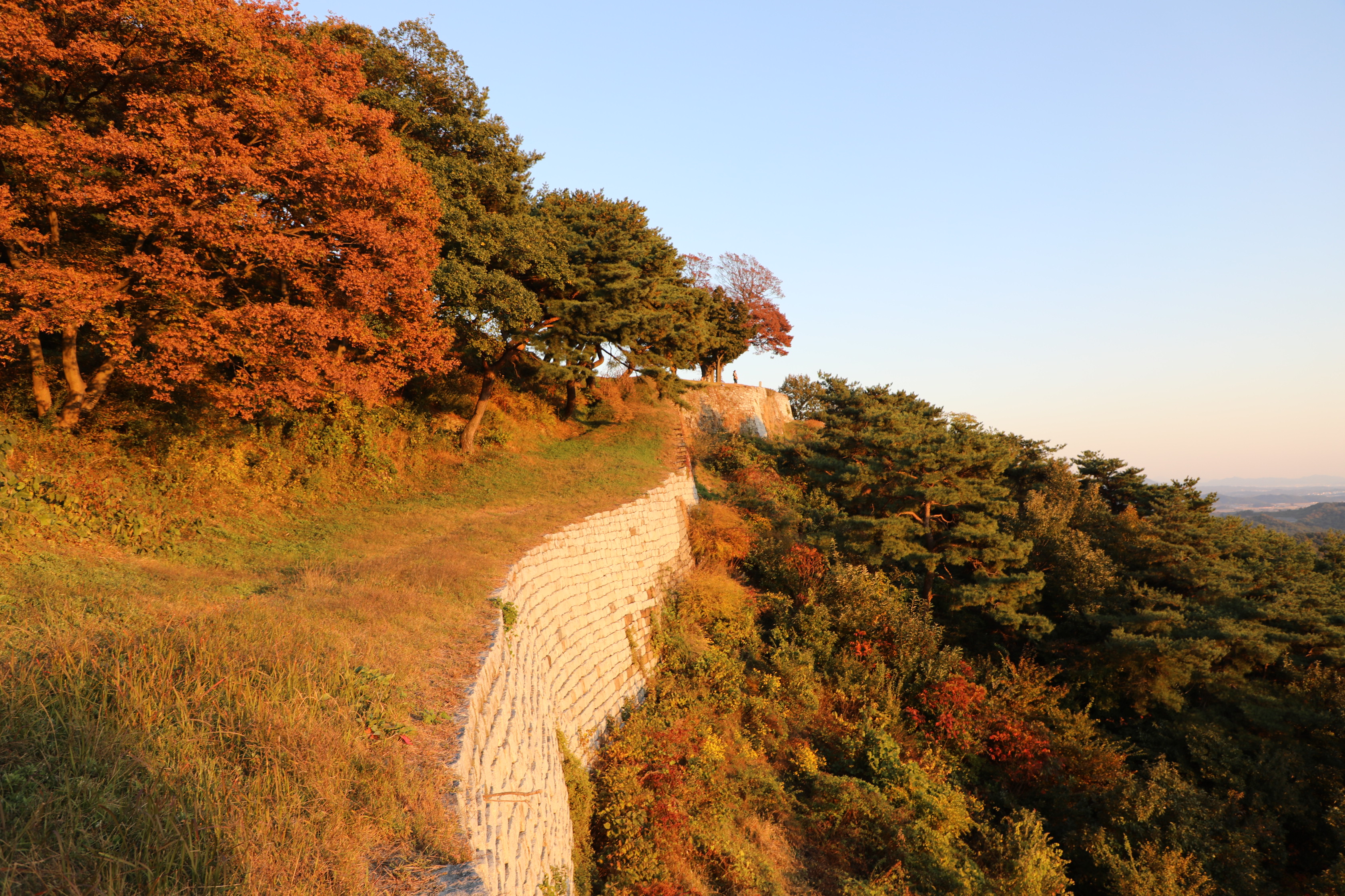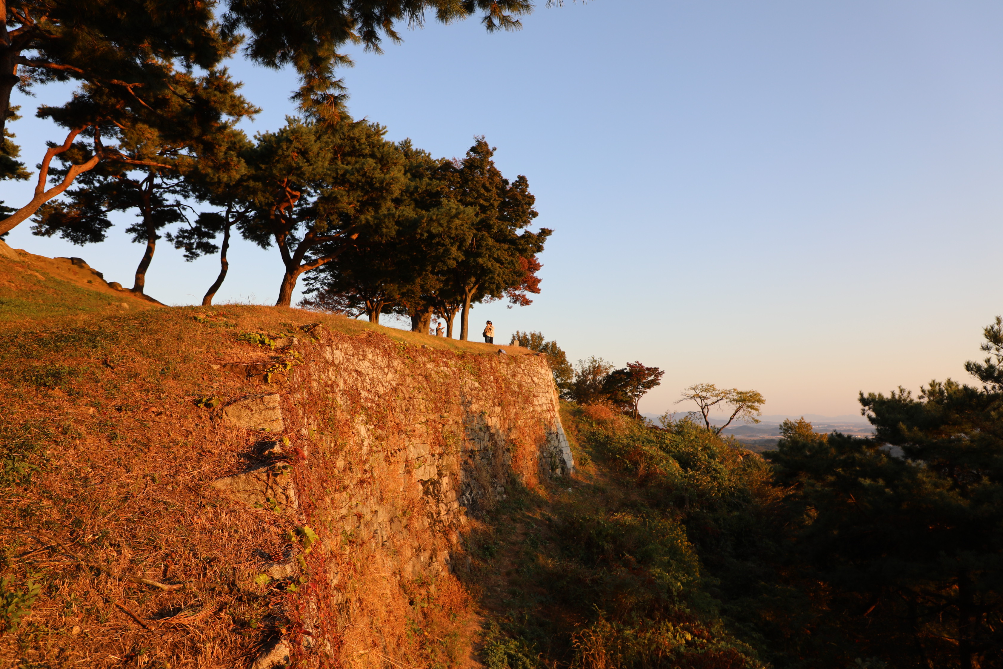 서산으로 기우는 태양의 붉은빛을 받은 성벽도 붉게 물든다.