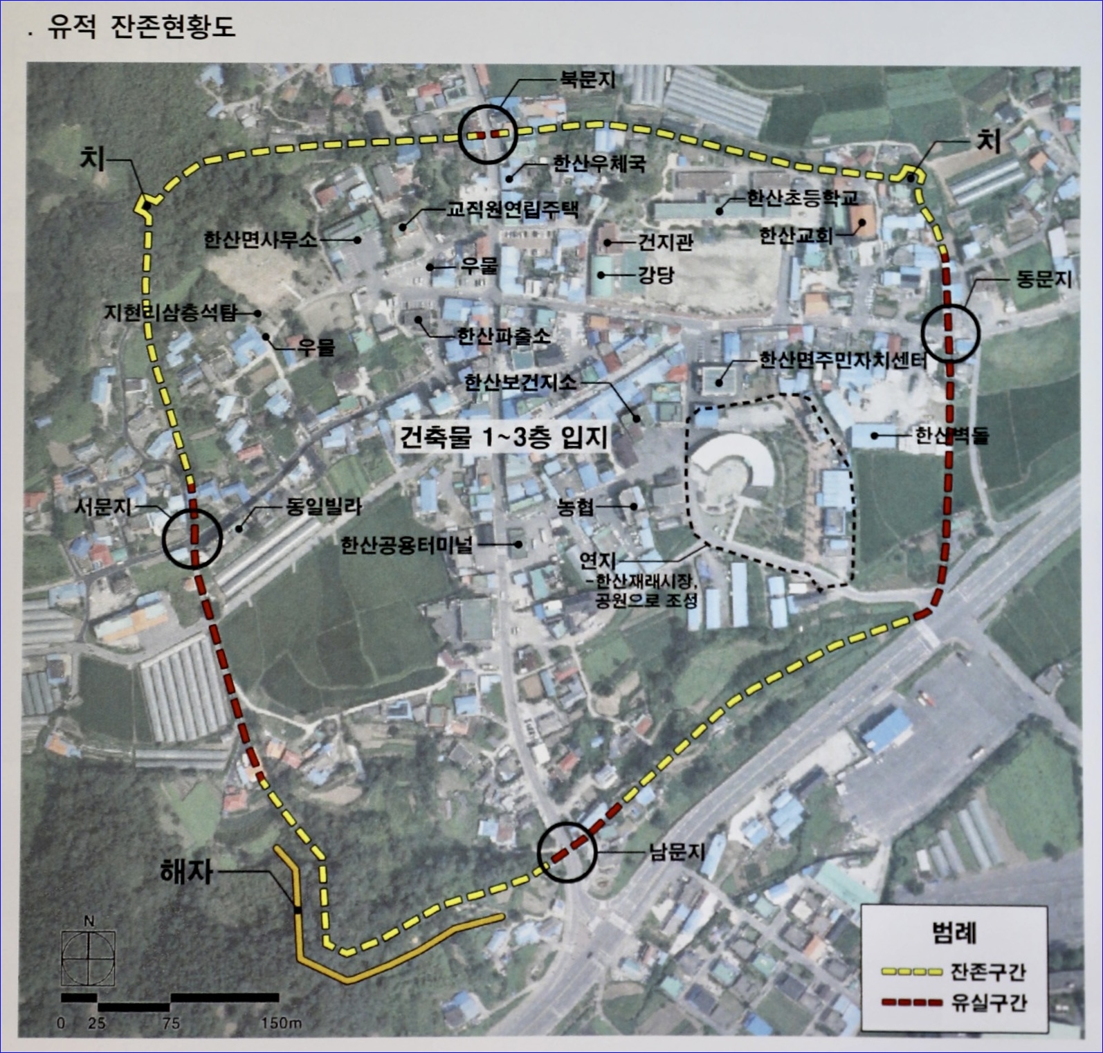 한산읍성은 남북의 산지와 중간의 평지를 이용한 평산성 형태이다.