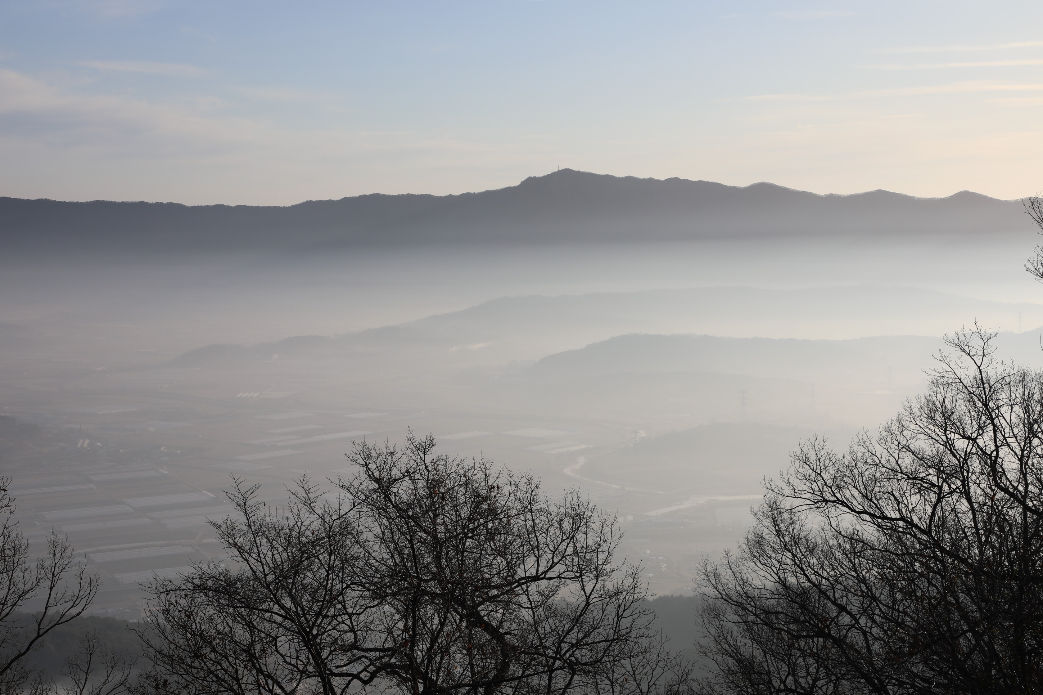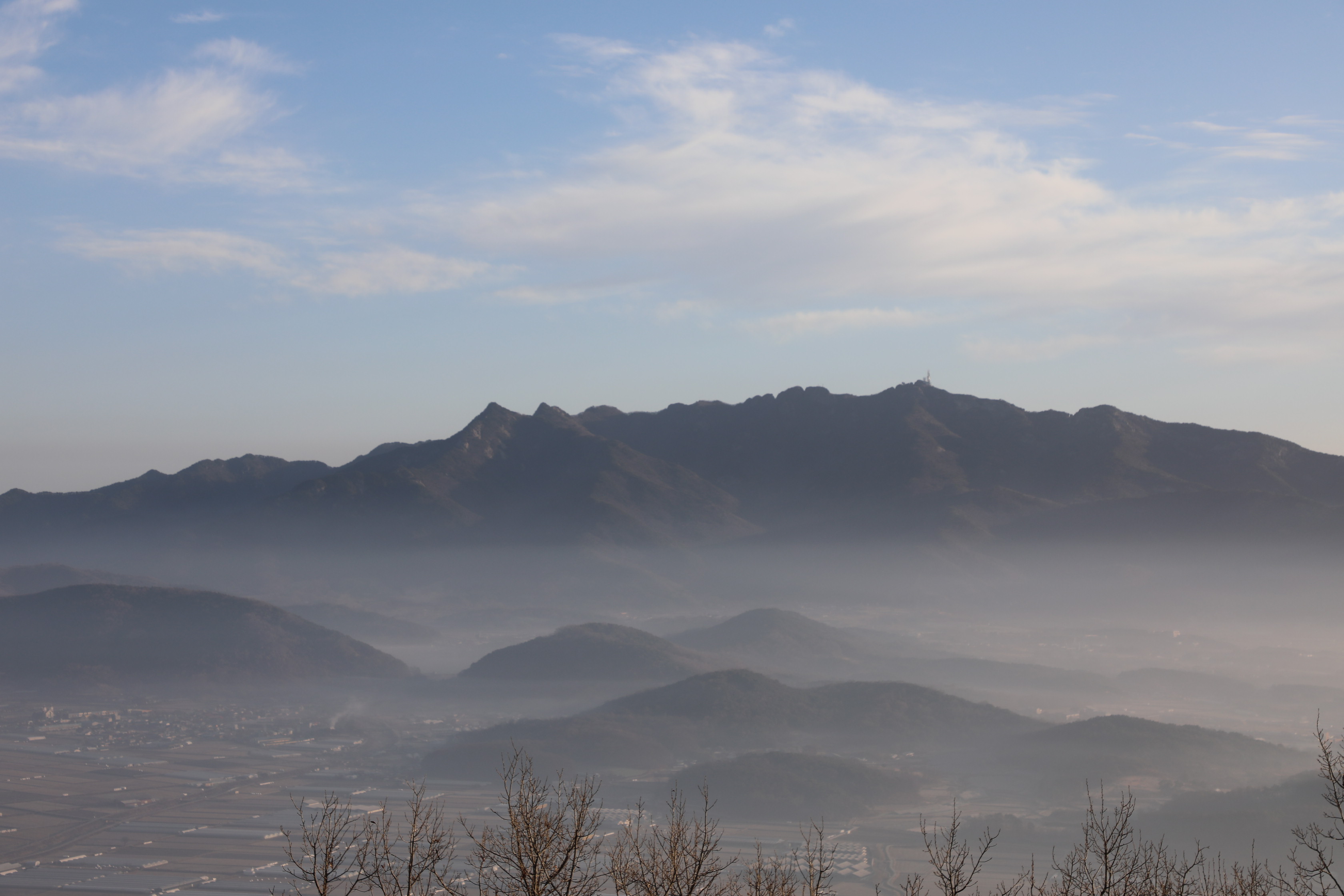 안개층이 뚜렷하게 보이며 안개에 가려진 가까운 거리가 너 멀게 보이는 특별한 풍경이다.