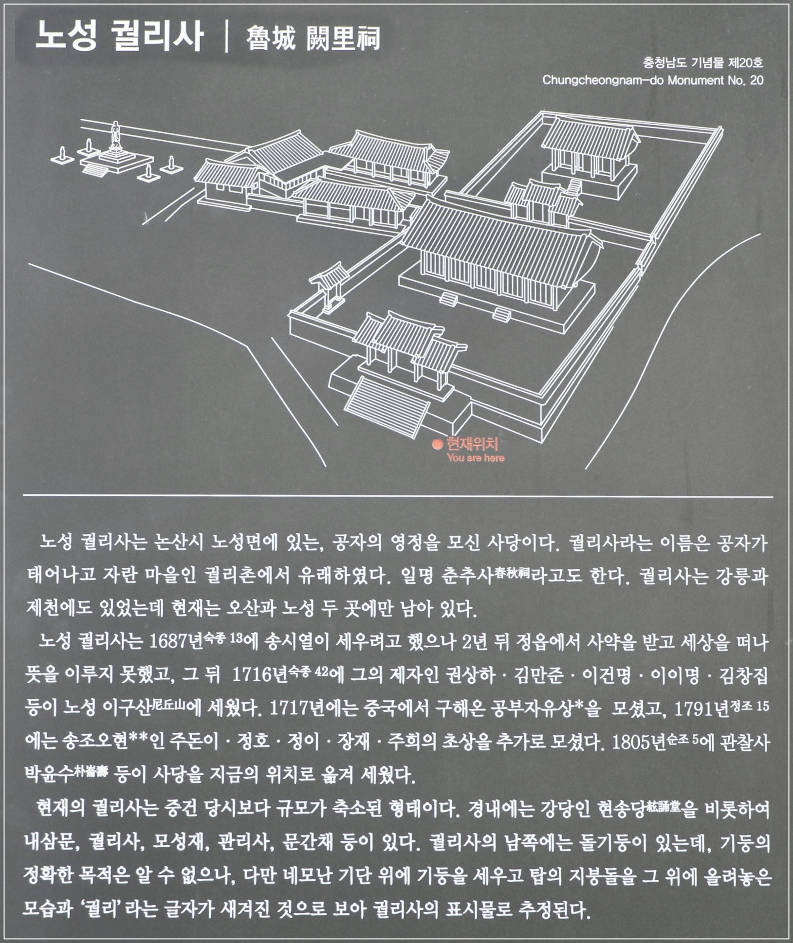 노성 궐리사는 공자가 탄생한 궐리촌에서 유래된 이름으로 1716년 숙종 42년 노성의 니구산에 건립하였다.