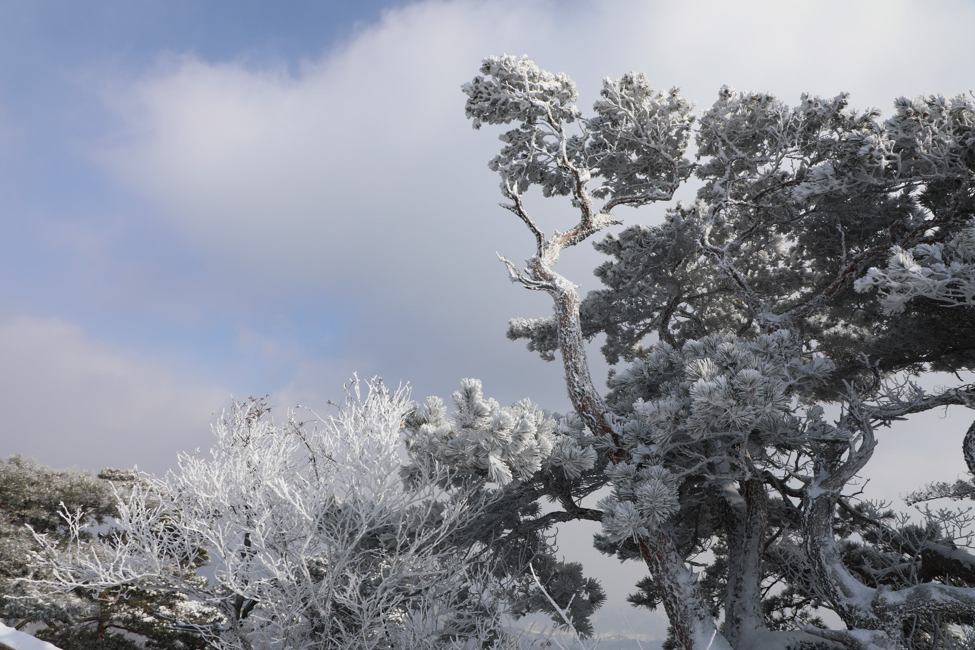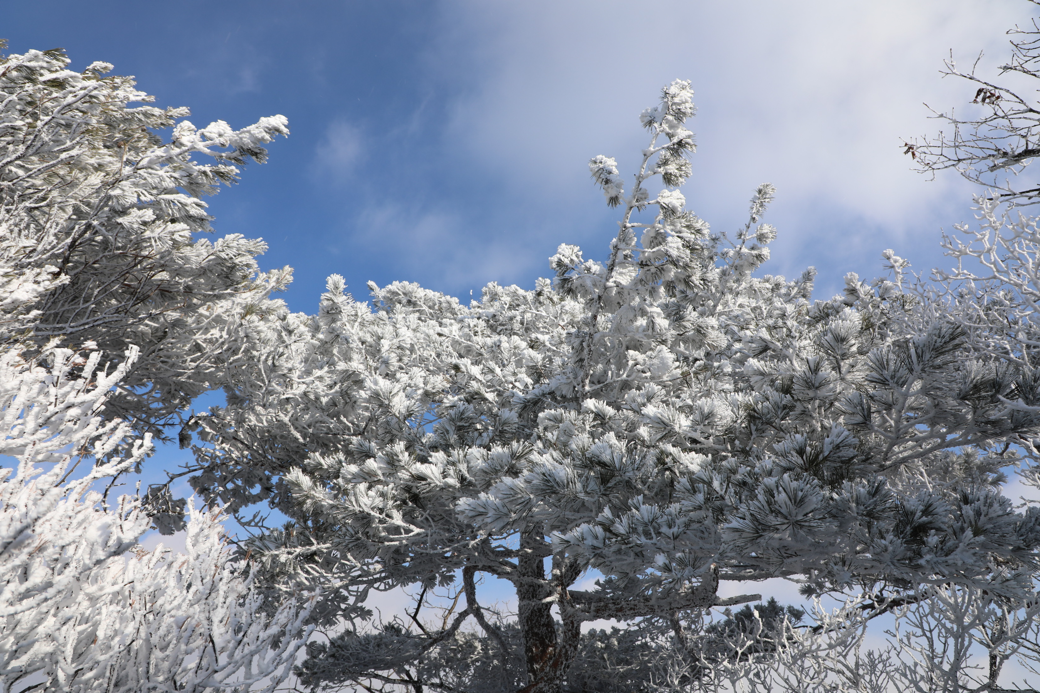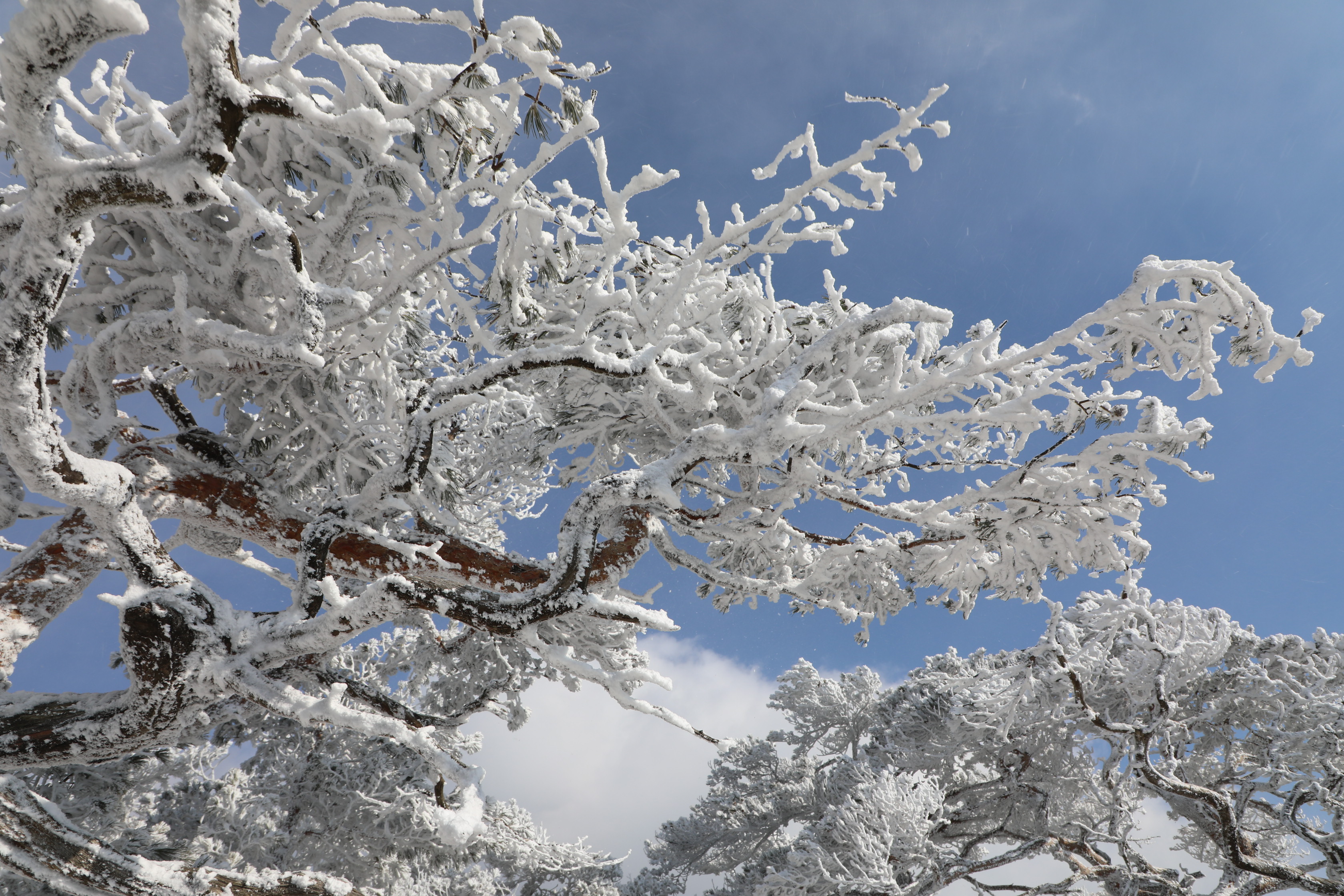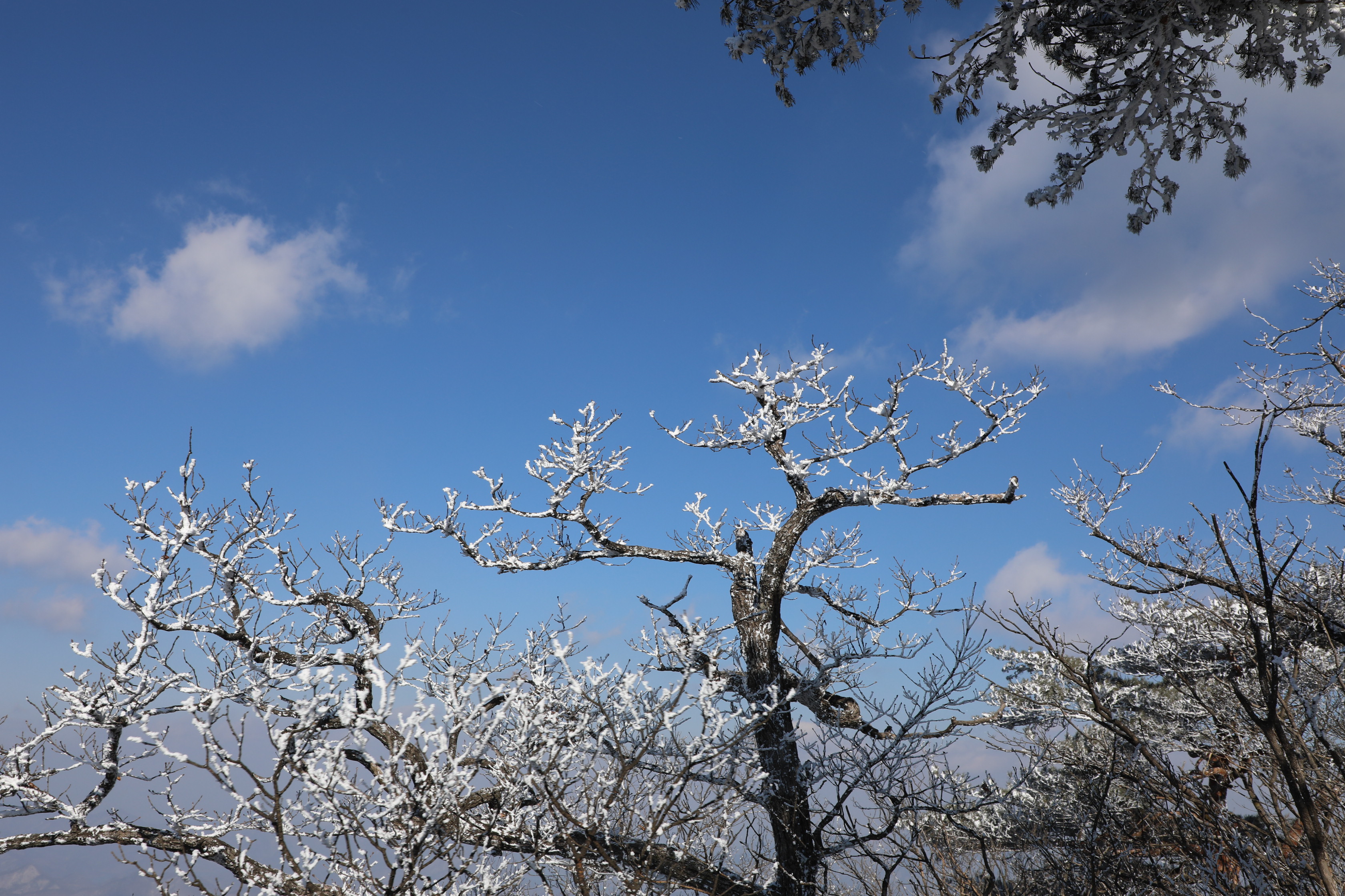 잠깐 동안 푸른 하늘 사이로 드러난 나무에 상고대가 애처롭게 달렸다.