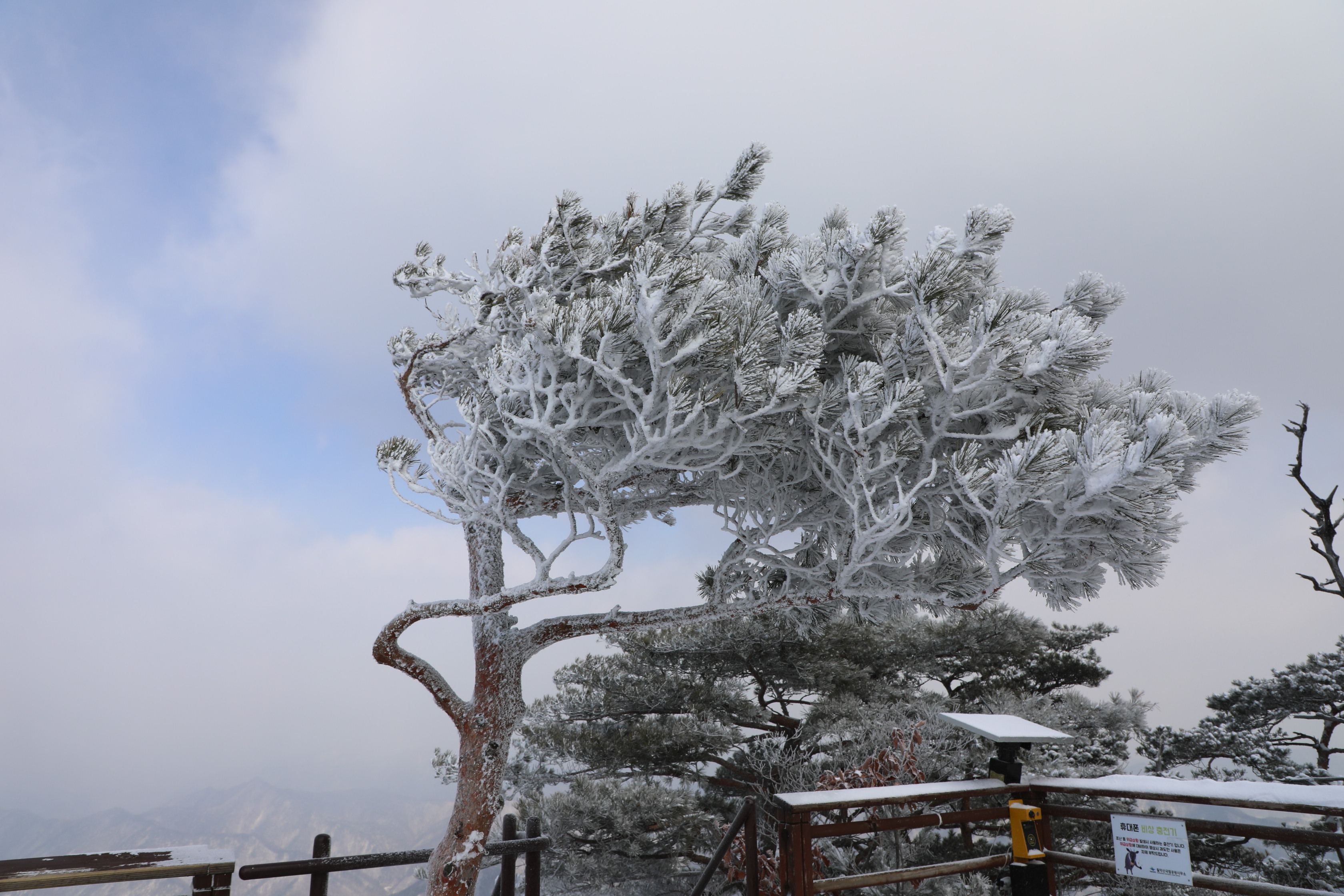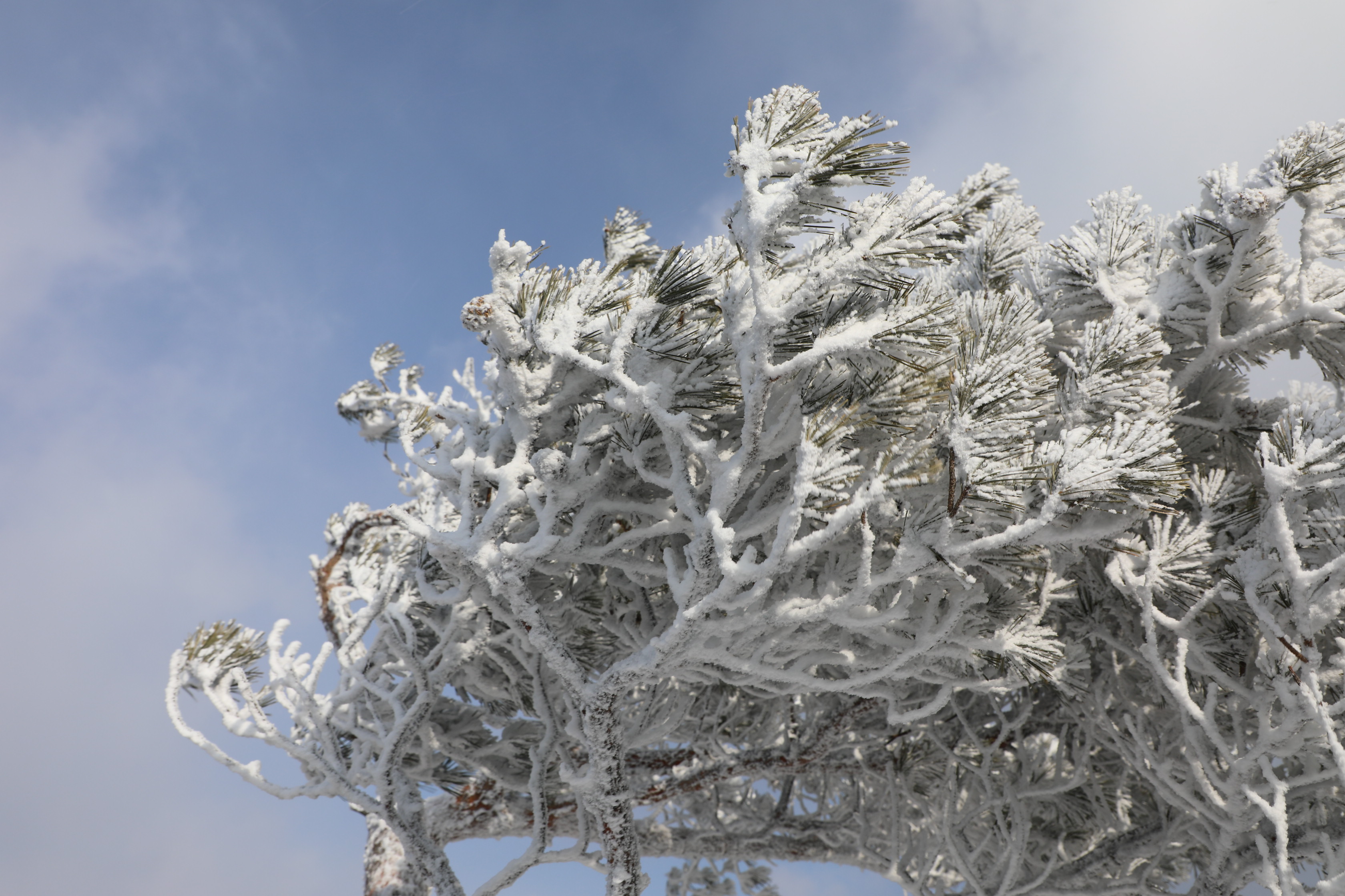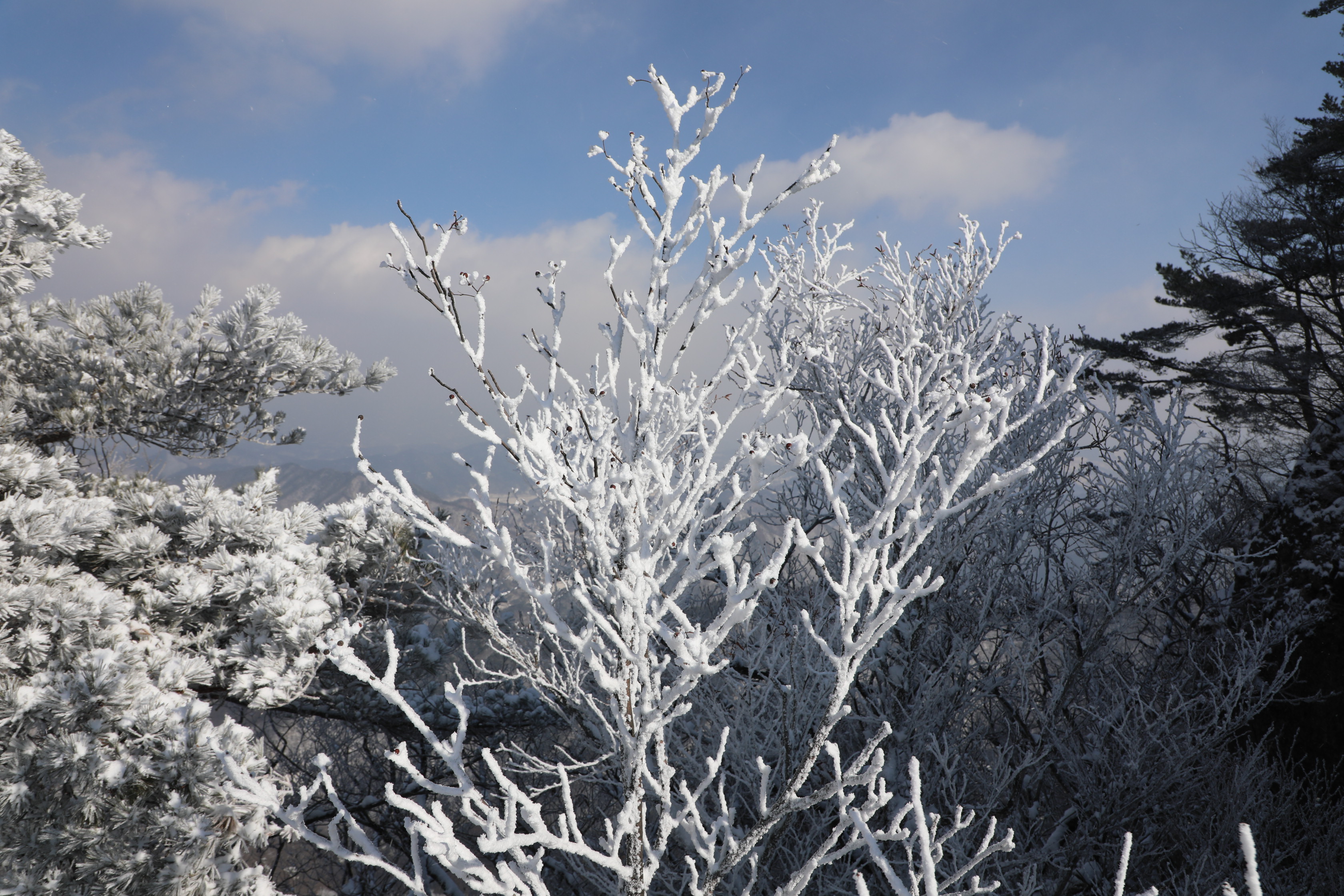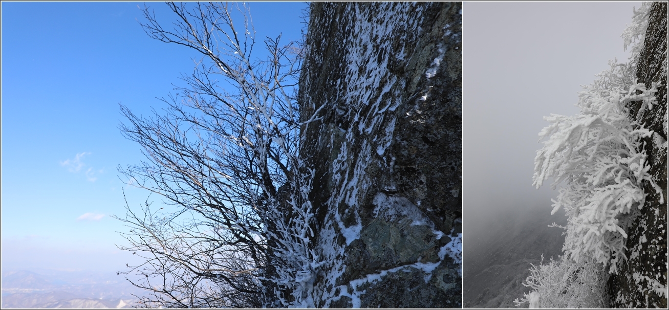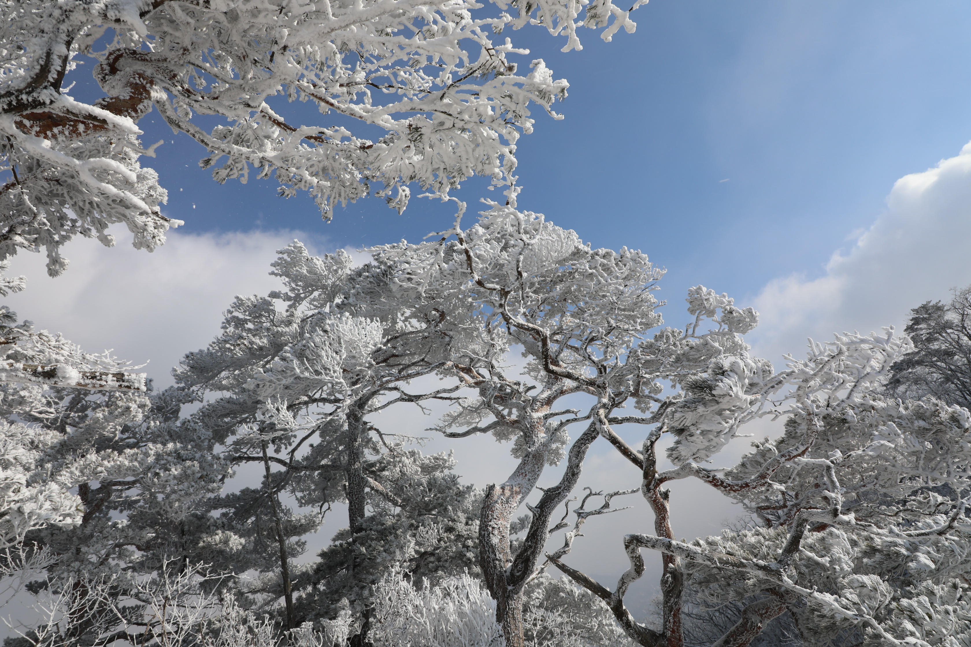 잠깐 동안 푸른 하늘 사이로 드러난 나무에 상고대가 애처롭게 달렸다.