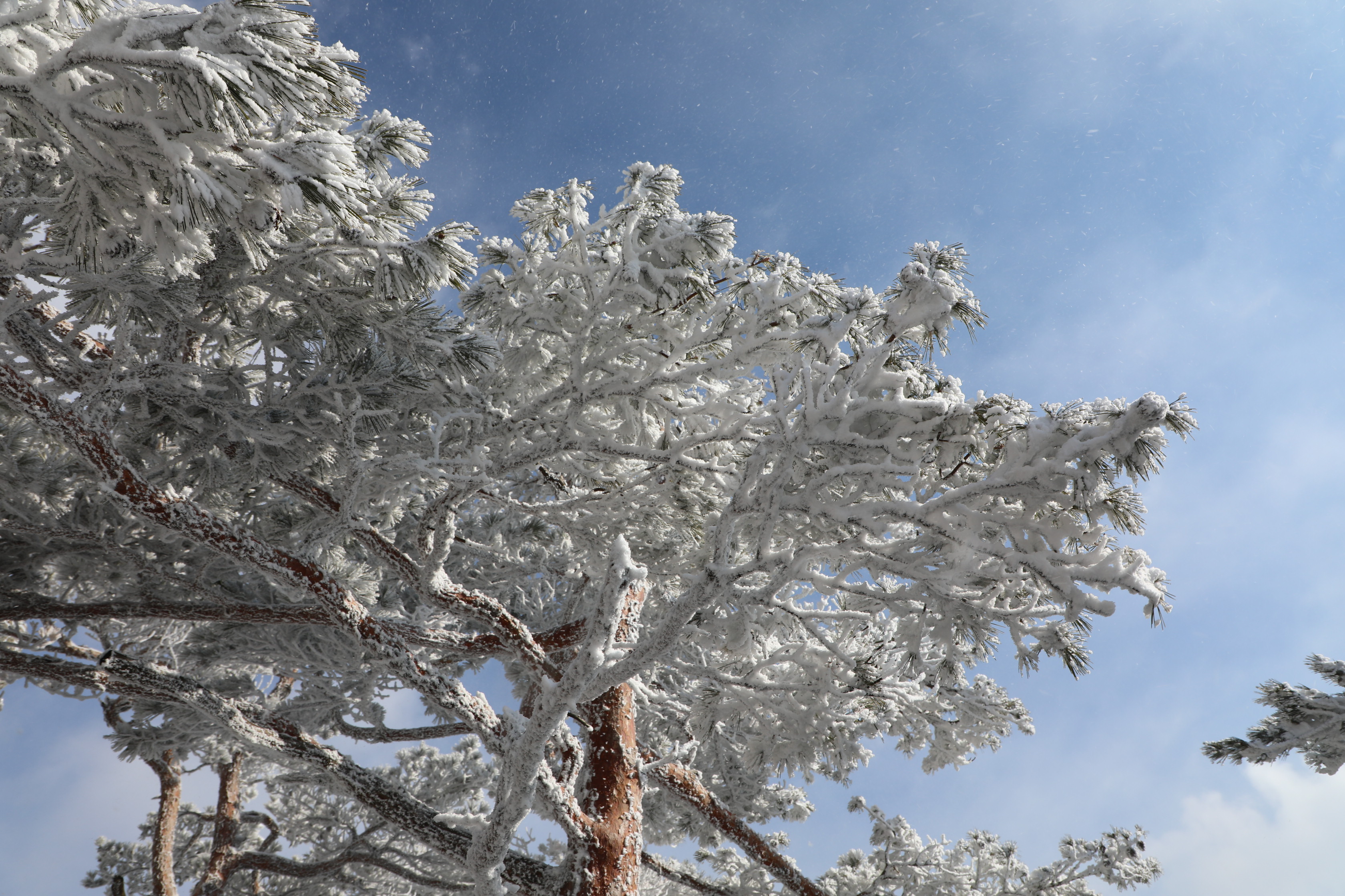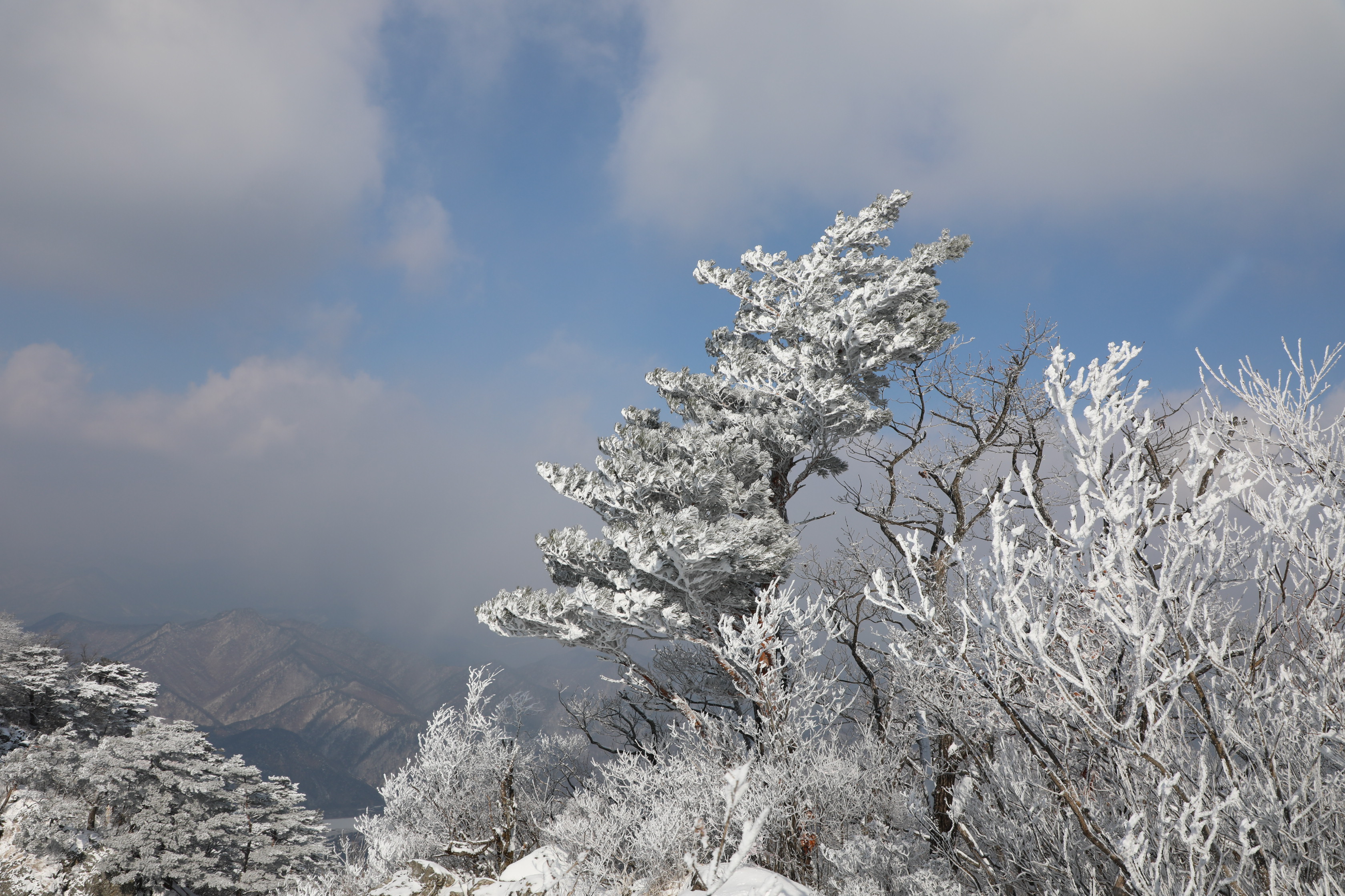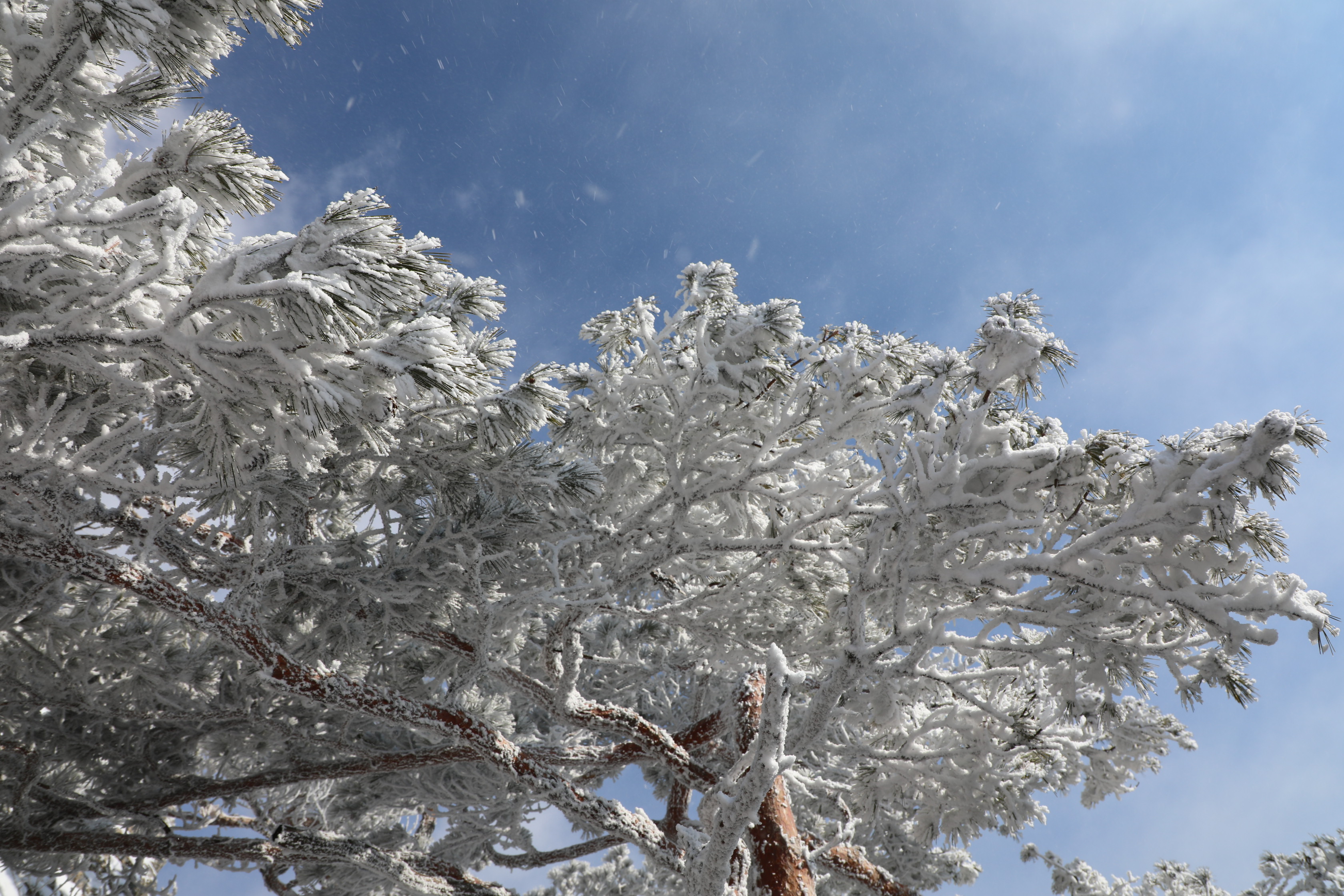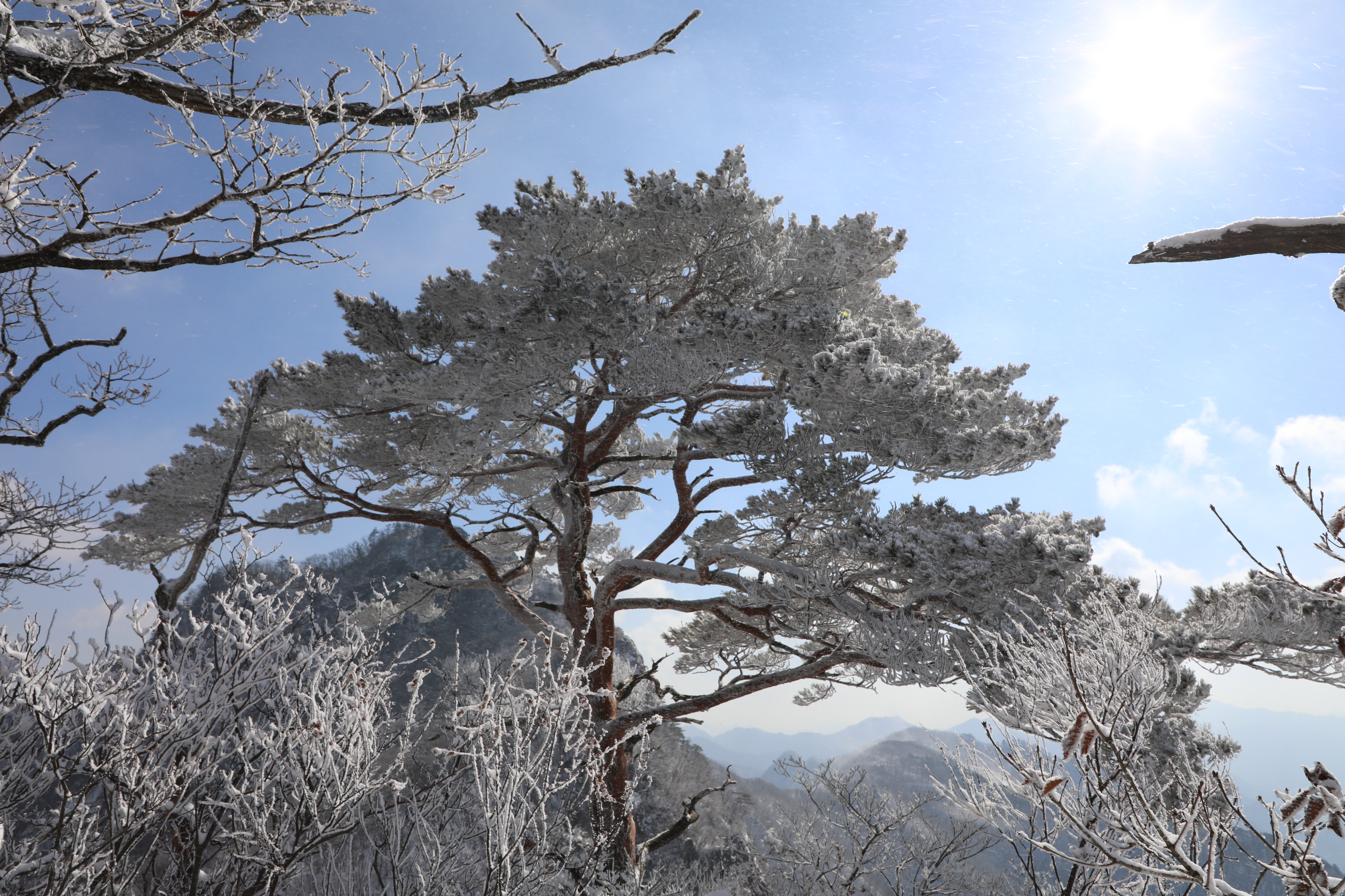 잠깐 동안 푸른 하늘 사이로 드러난 나무에 상고대가 애처롭게 달렸다.