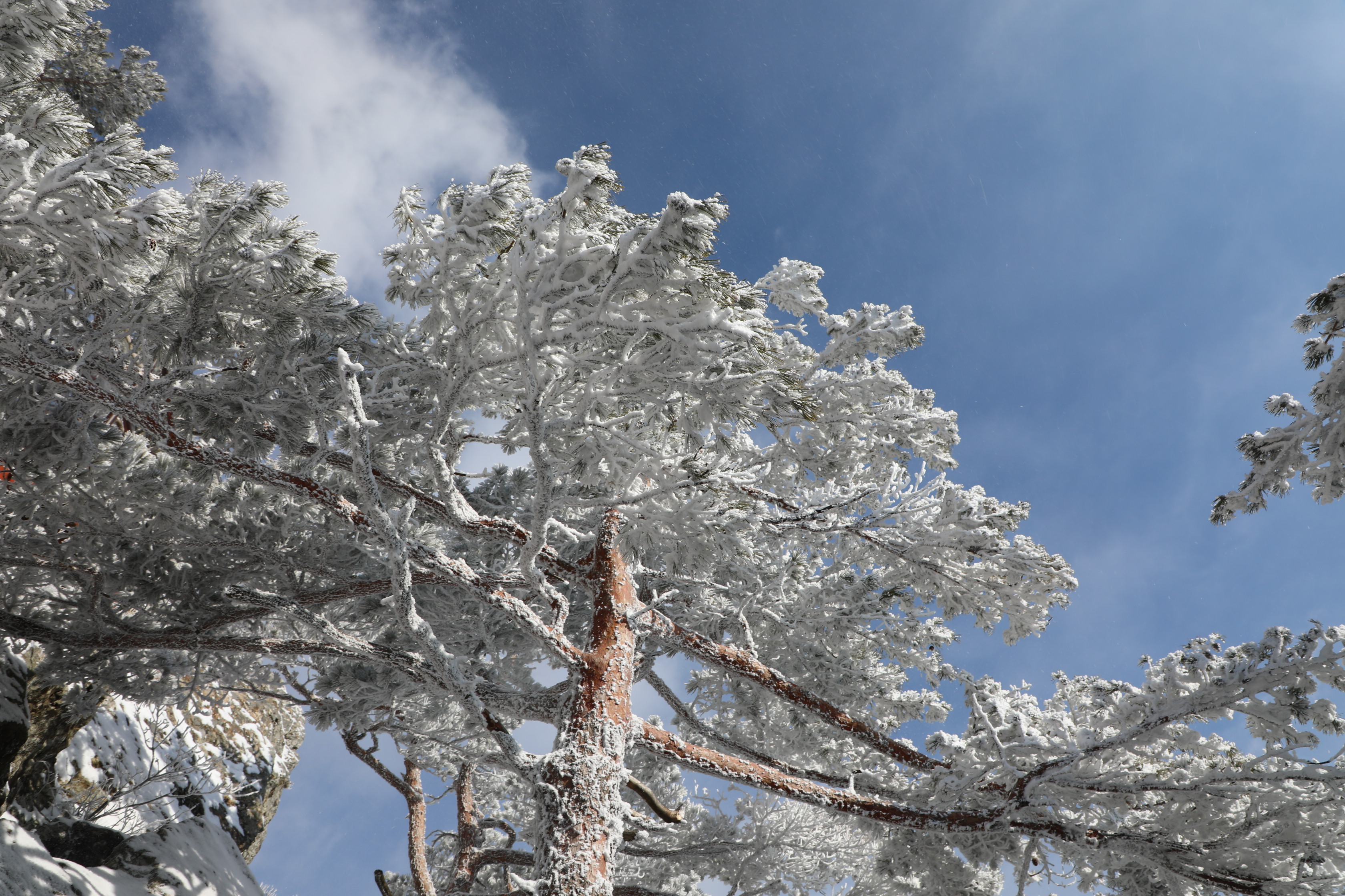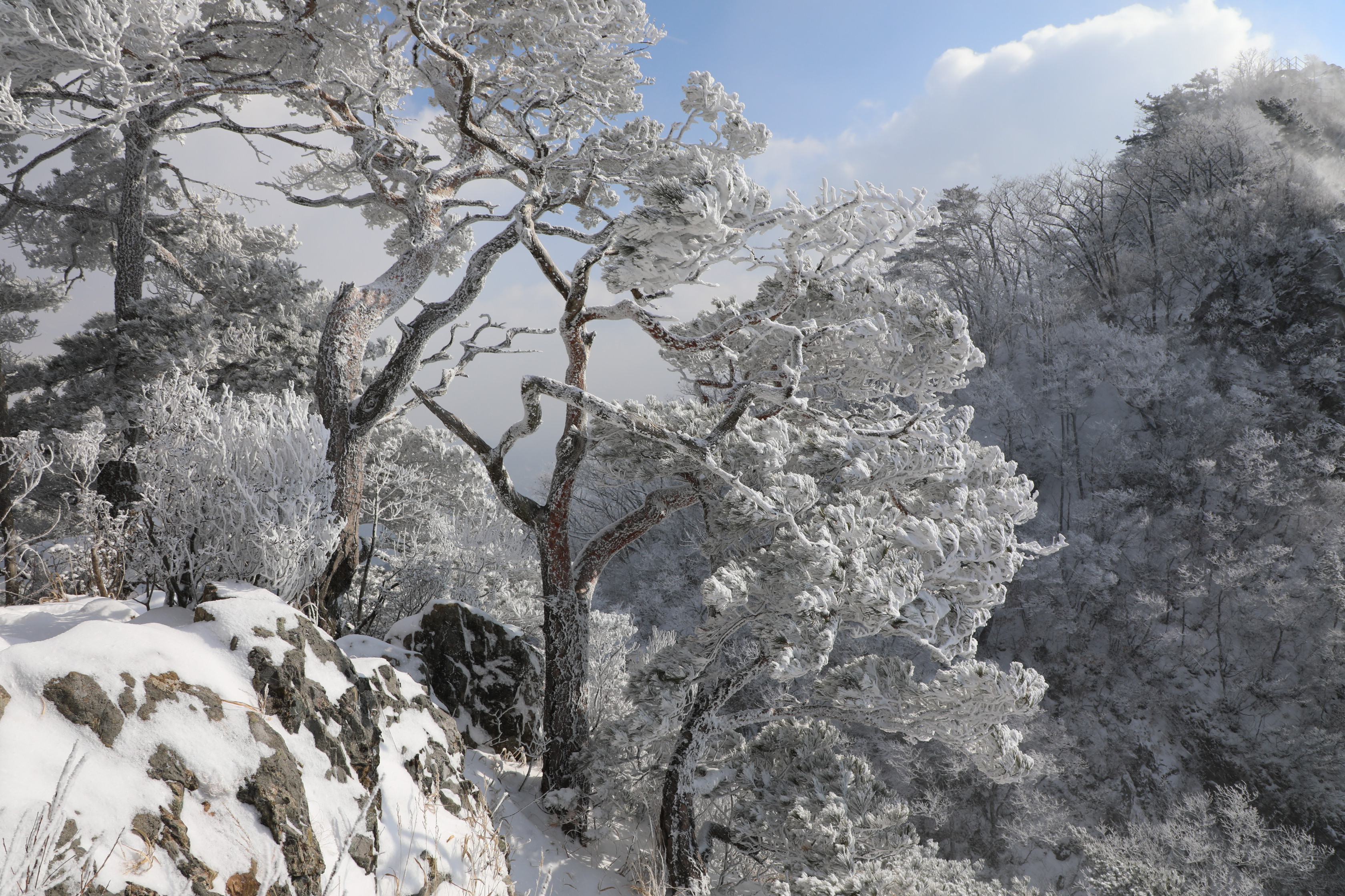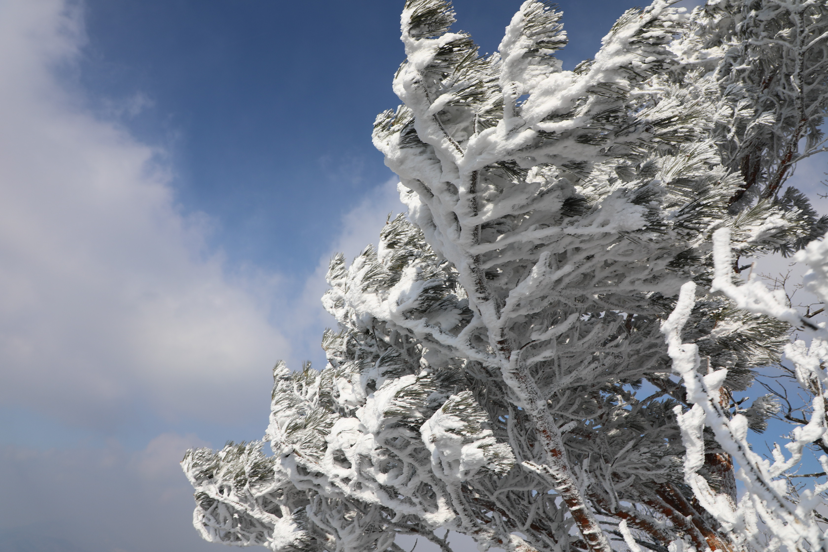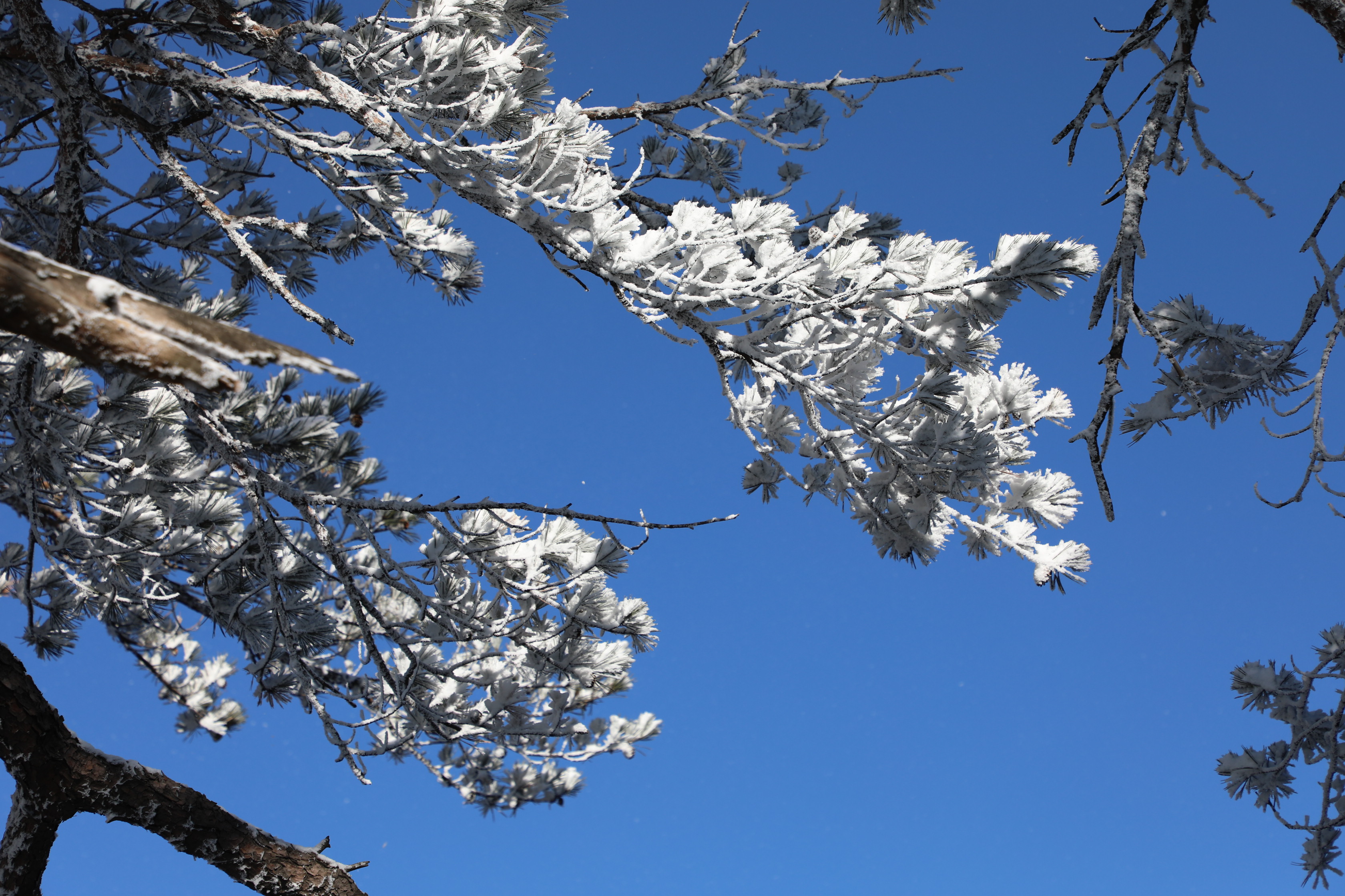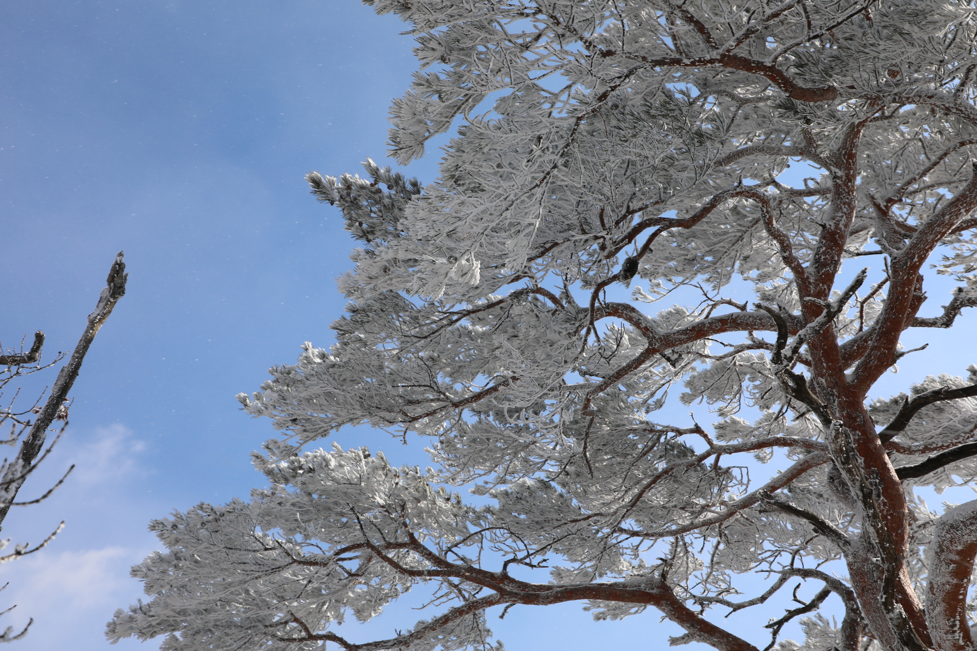 잠깐 동안 푸른 하늘 사이로 드러난 나무에 상고대가 애처롭게 달렸다.