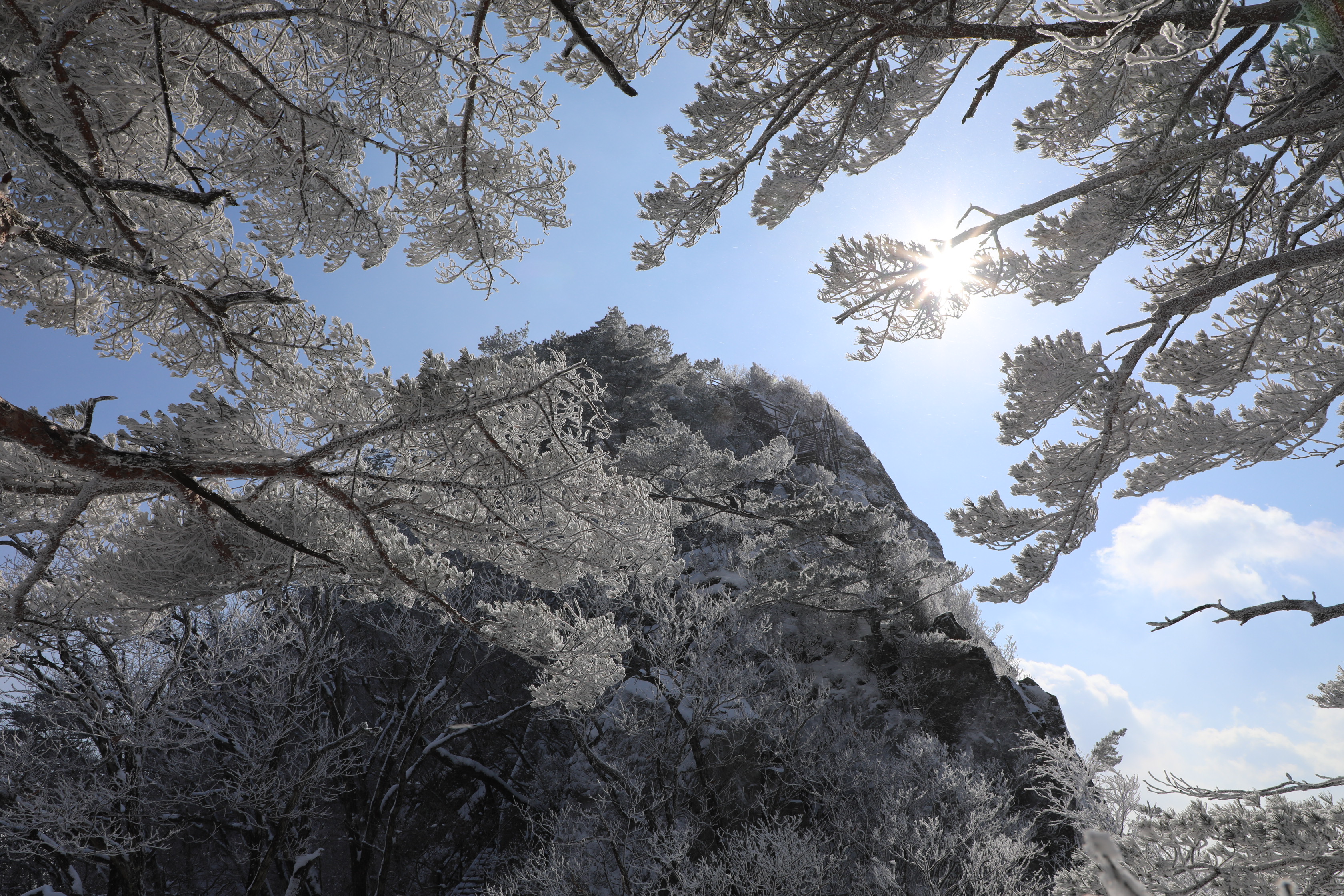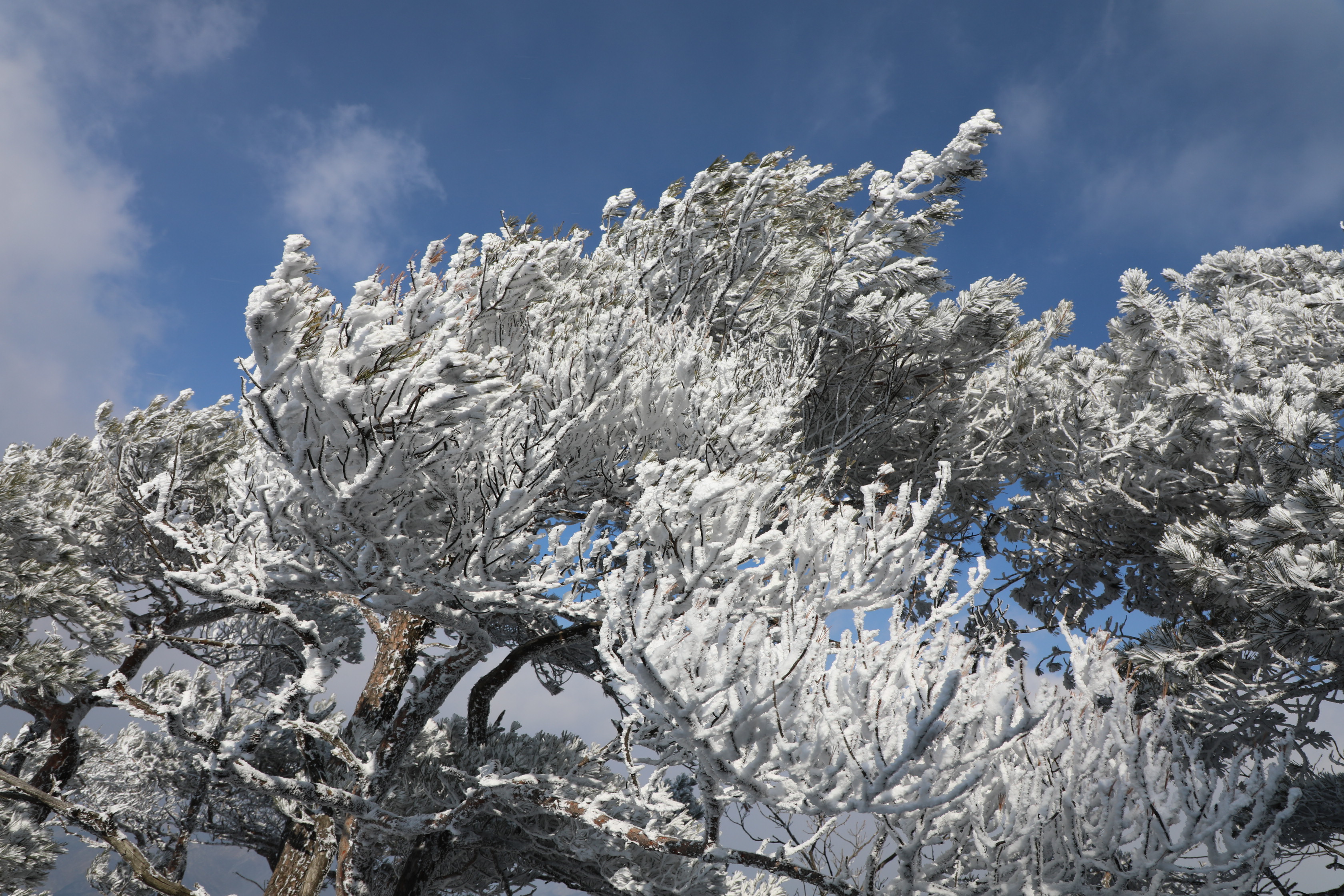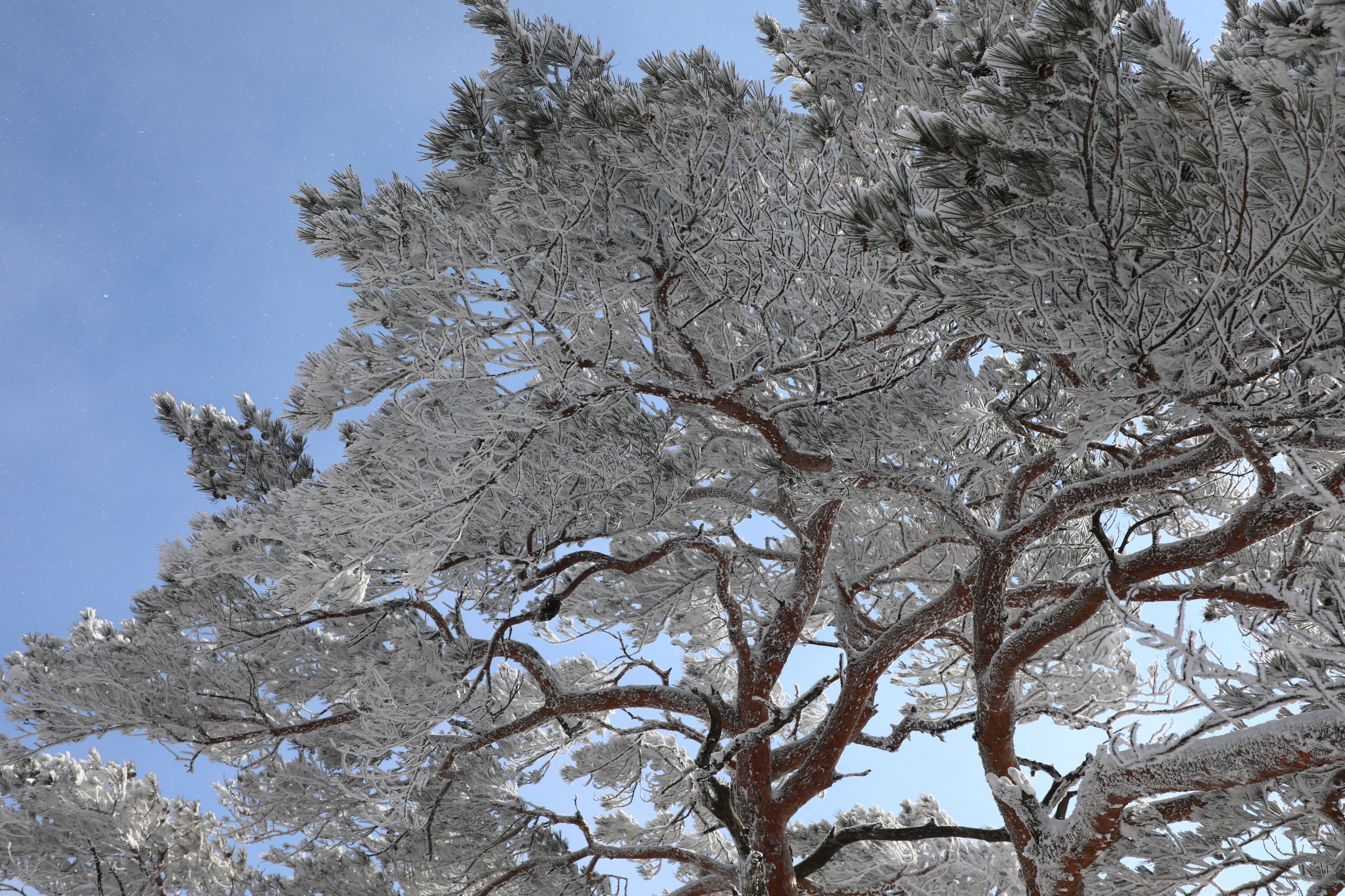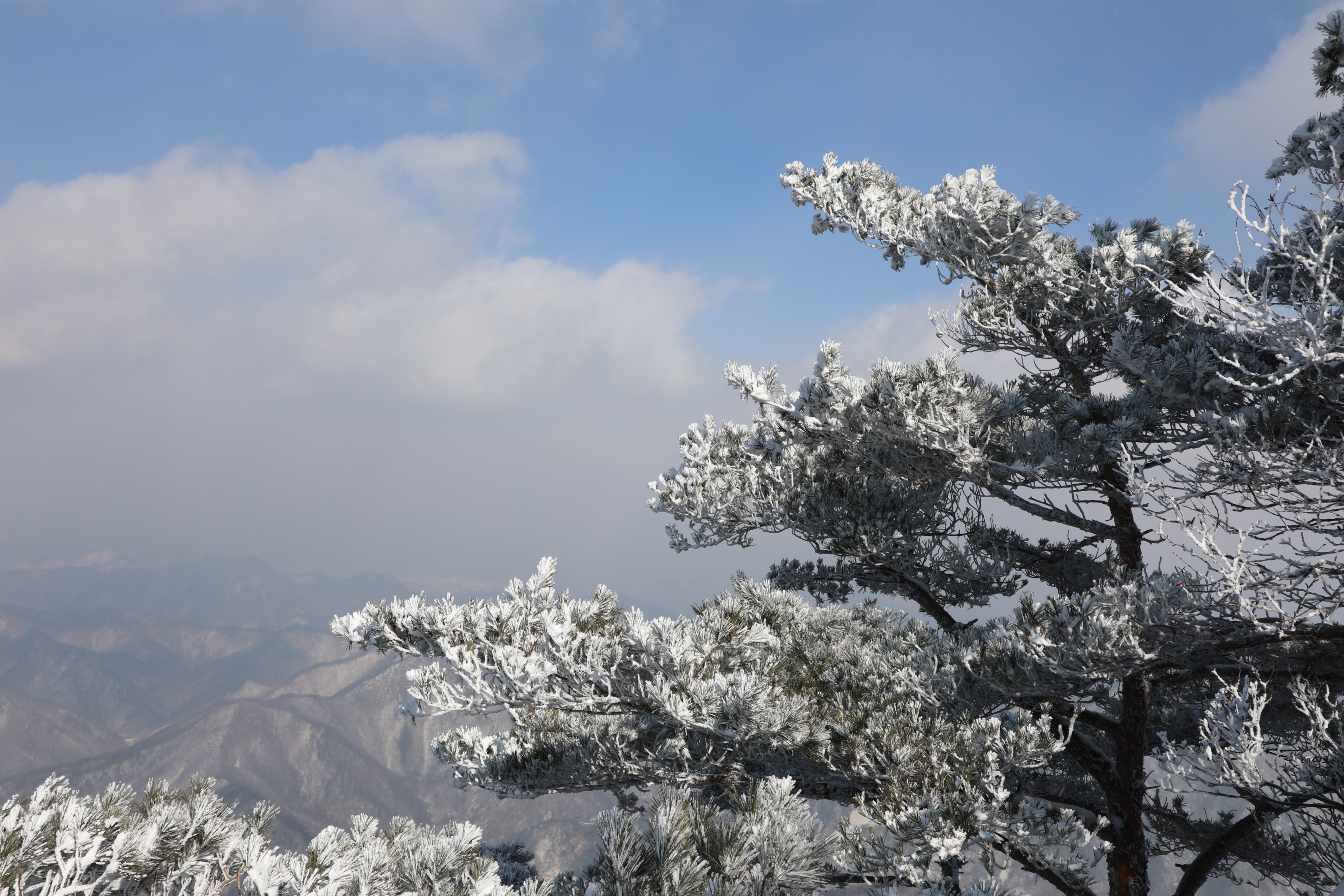 잠깐 동안 푸른 하늘 사이로 드러난 나무에 상고대가 애처롭게 달렸다.