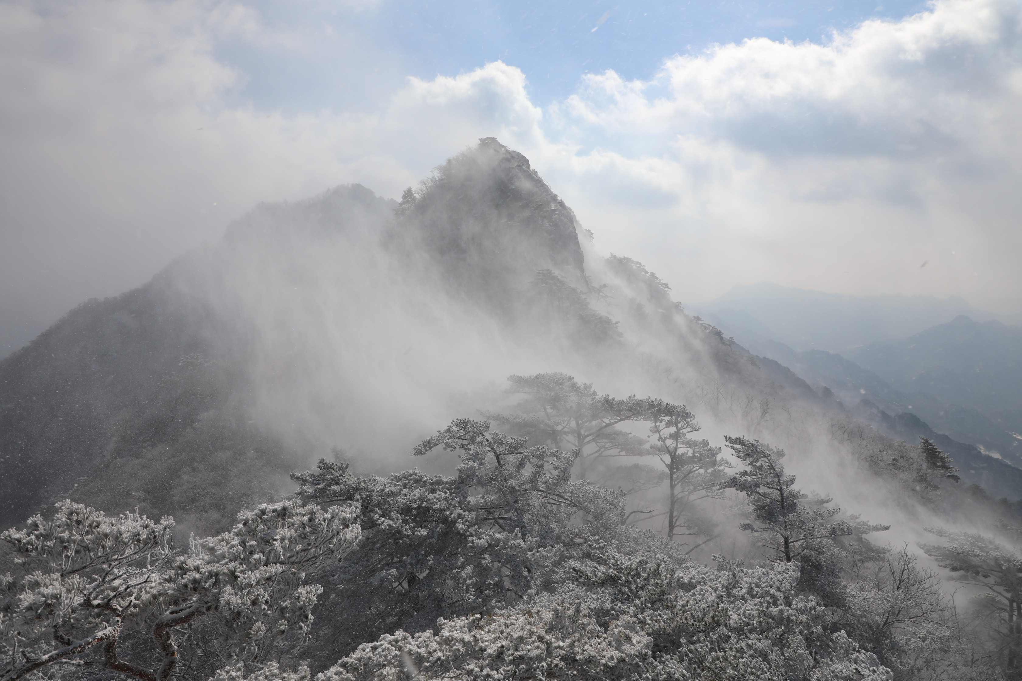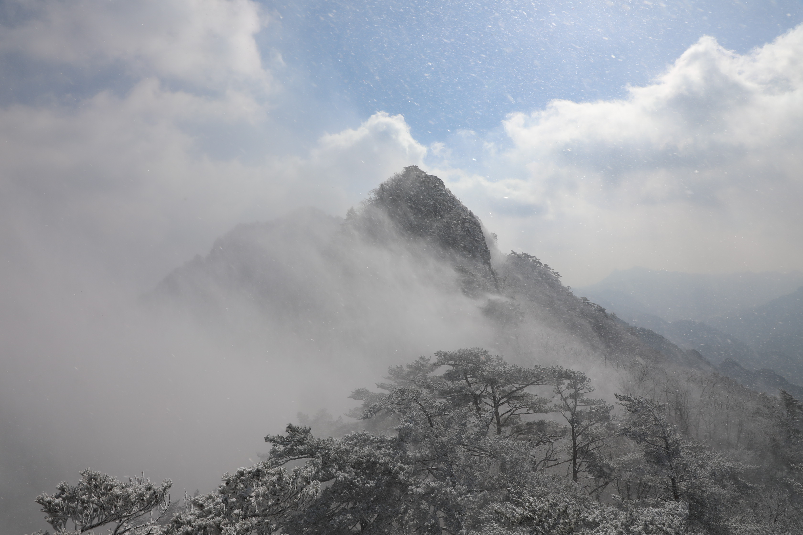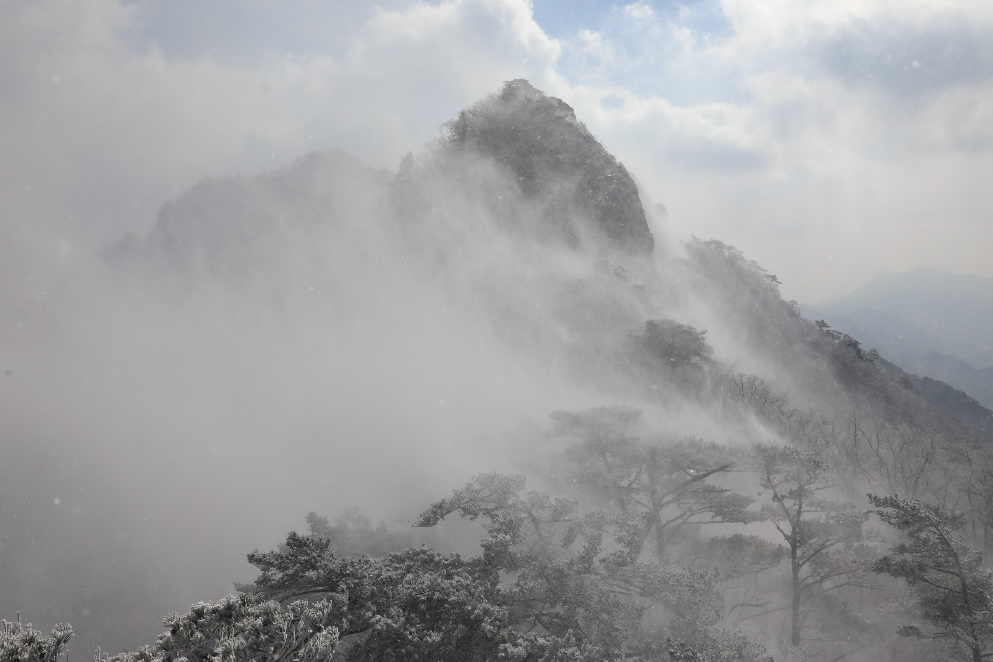 멀리 보이는 영봉은 상고대와 눈이 바람에 날리며 안갯속에 드러난 골산처럼 보인다.