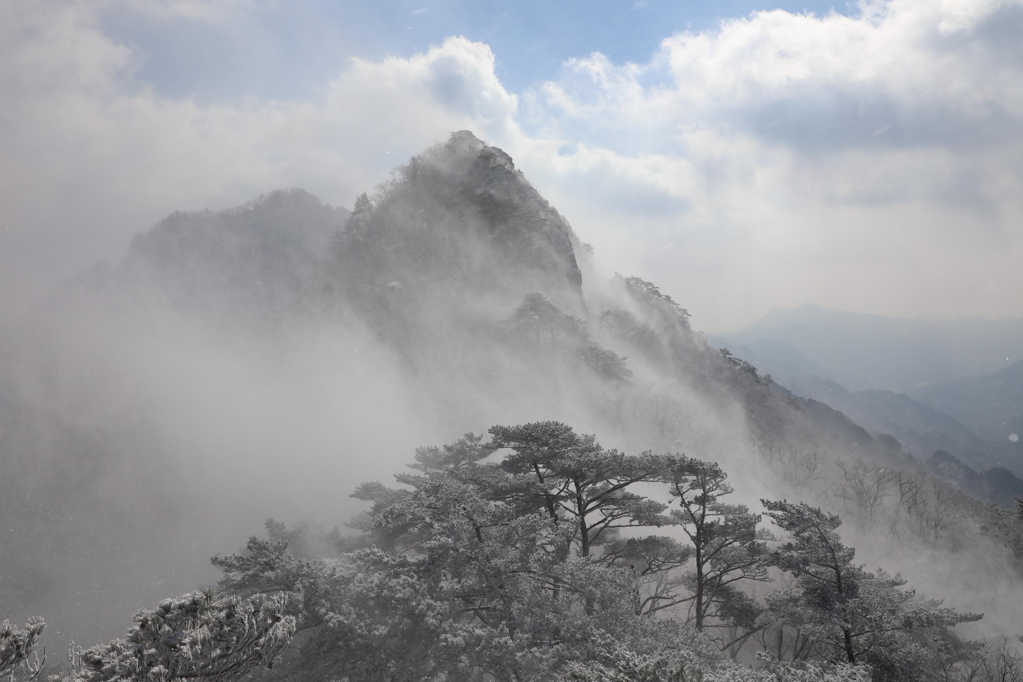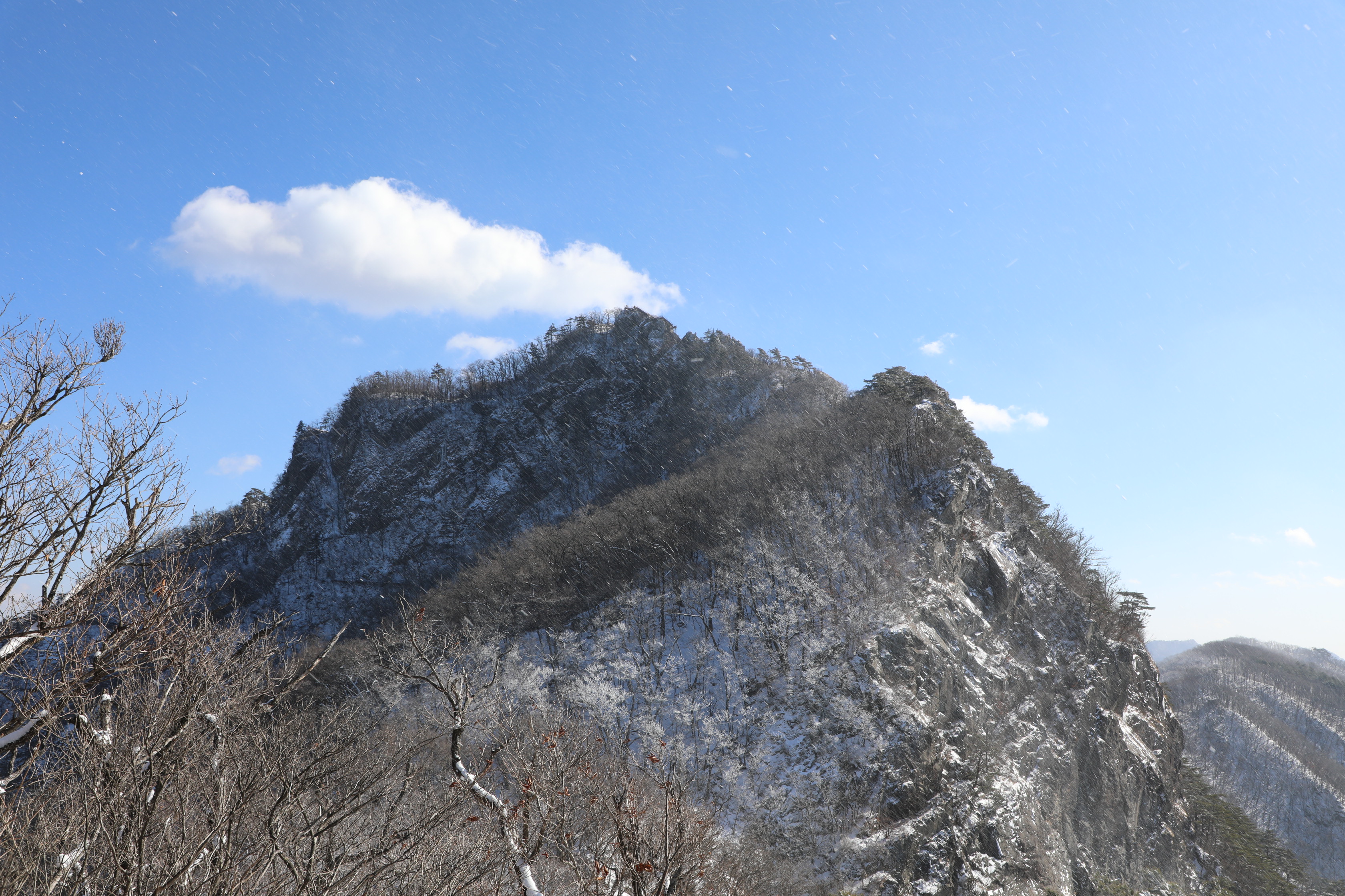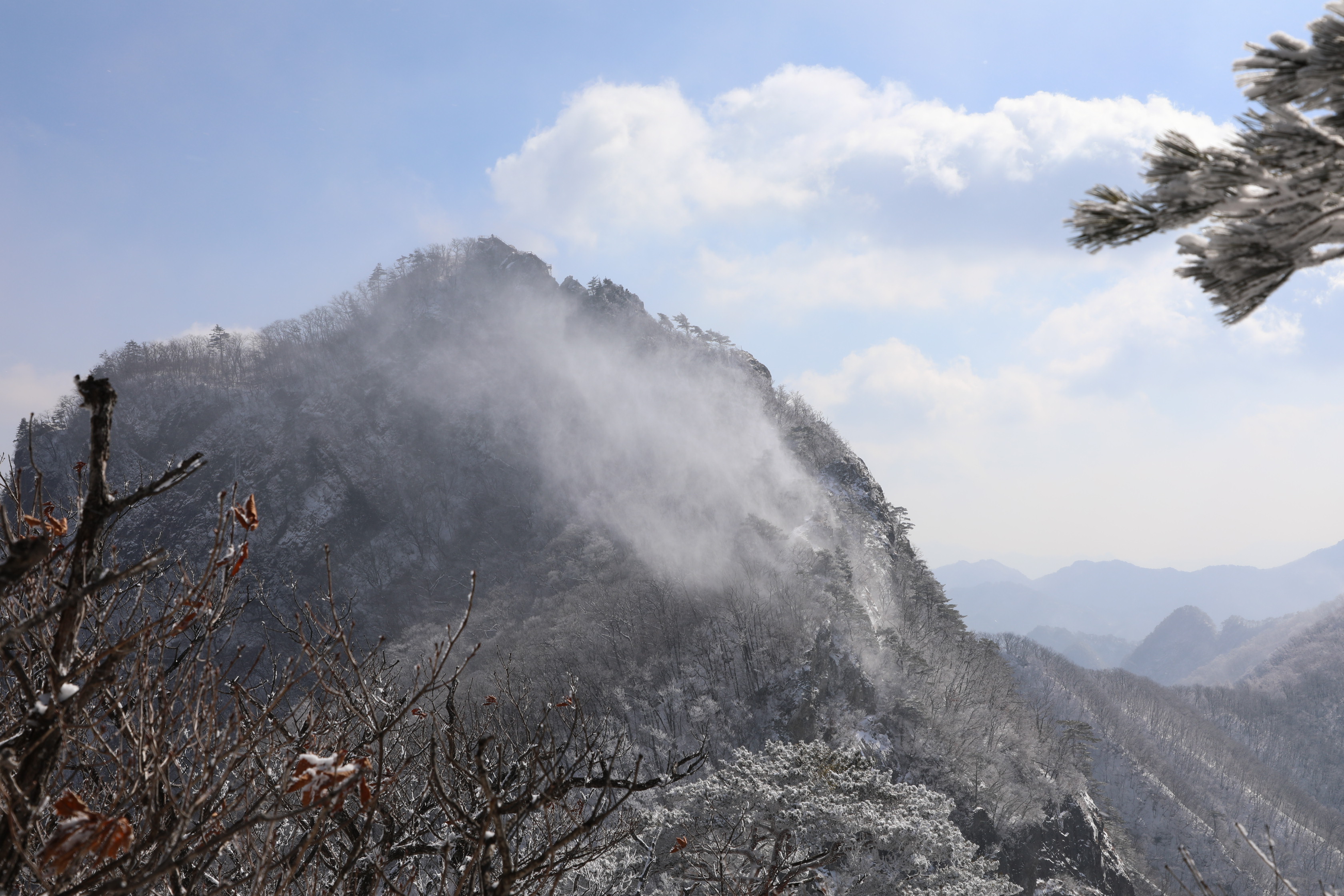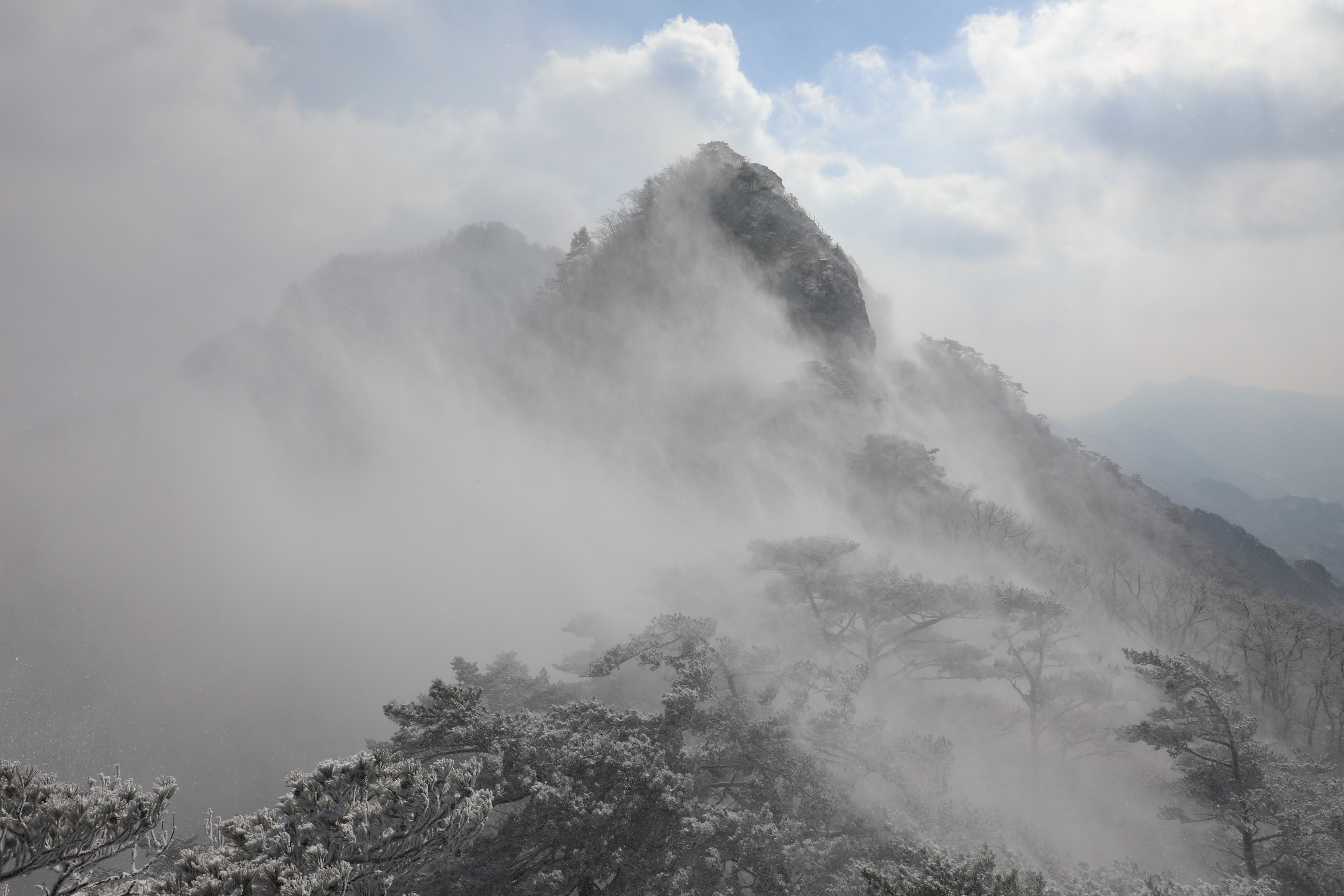 멀리 보이는 영봉은 상고대와 눈이 바람에 날리며 안갯속에 드러난 골산처럼 보인다.