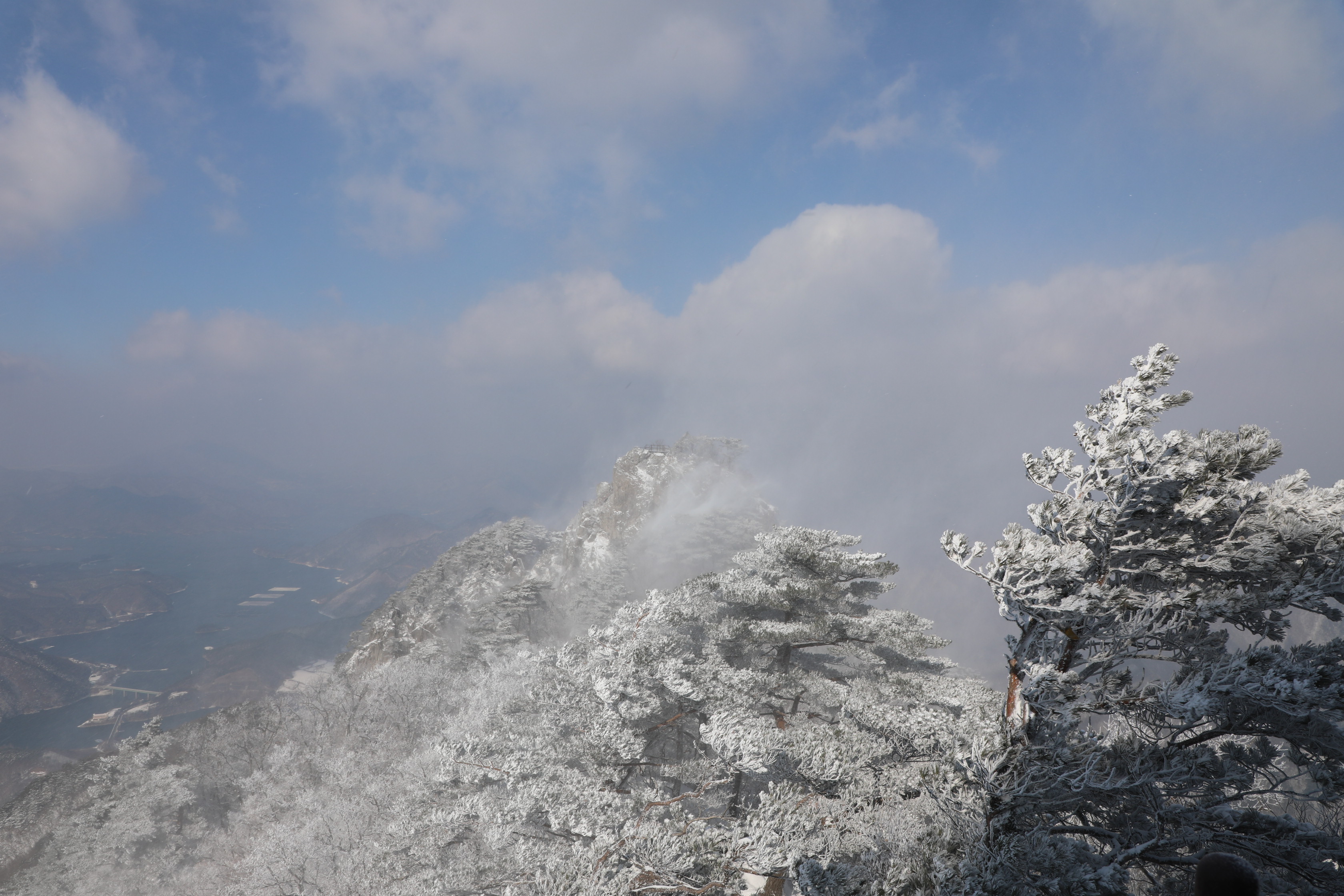 구름 사이로 드러난 파란 하늘에 상고대까지 춤을 추며 날아가는 모습을 볼 수 있다.