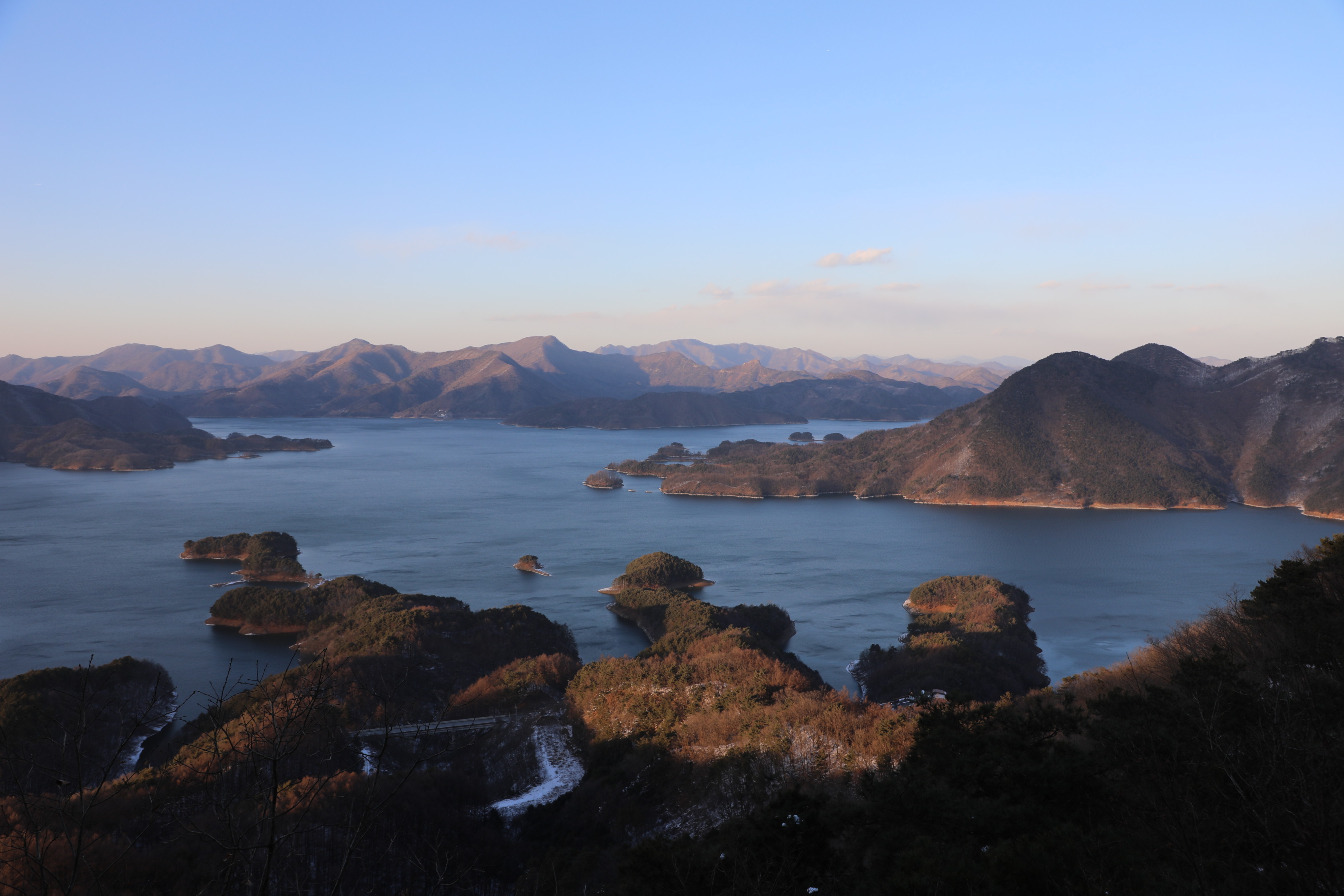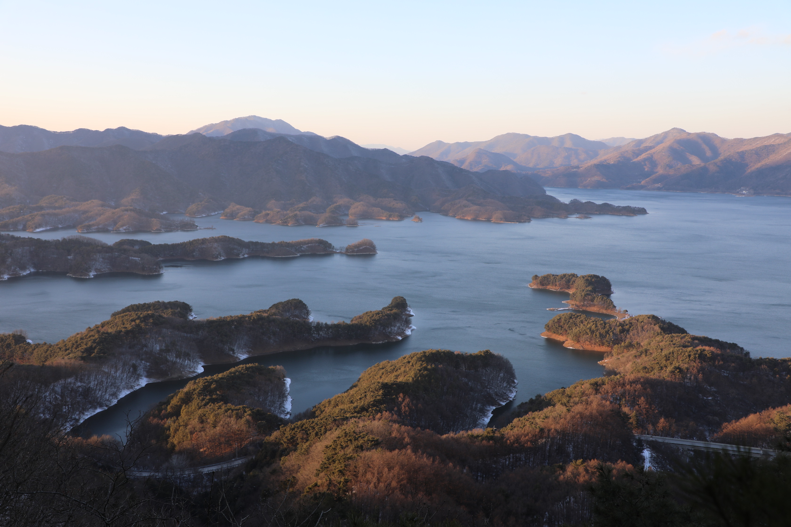 월악산 산행 끝이라 피곤한 느낌으로 악어봉 전망대까지 오르지 않고 8부 능선에 있는 조망터에서 악어섬을 바라보았다.