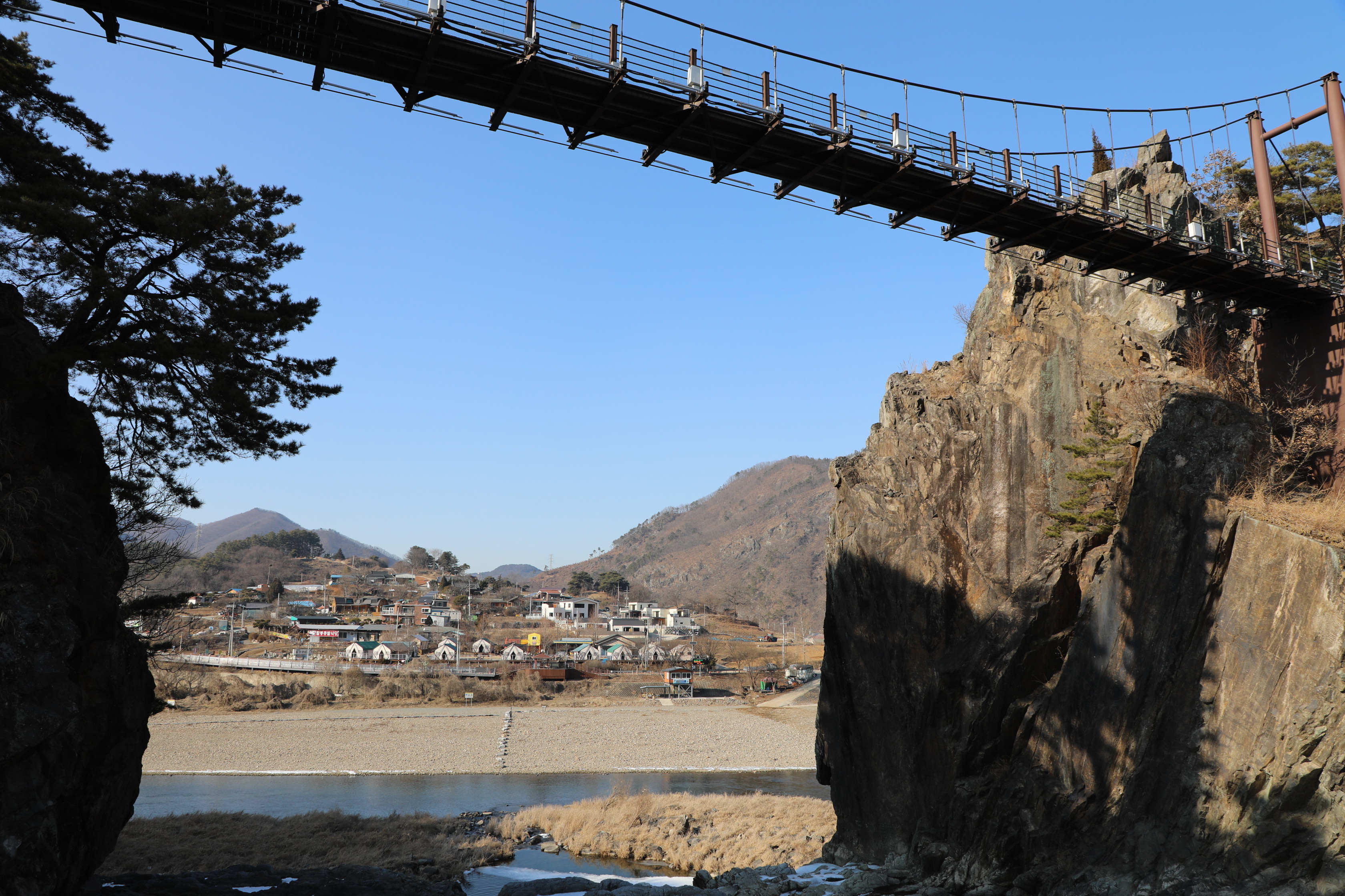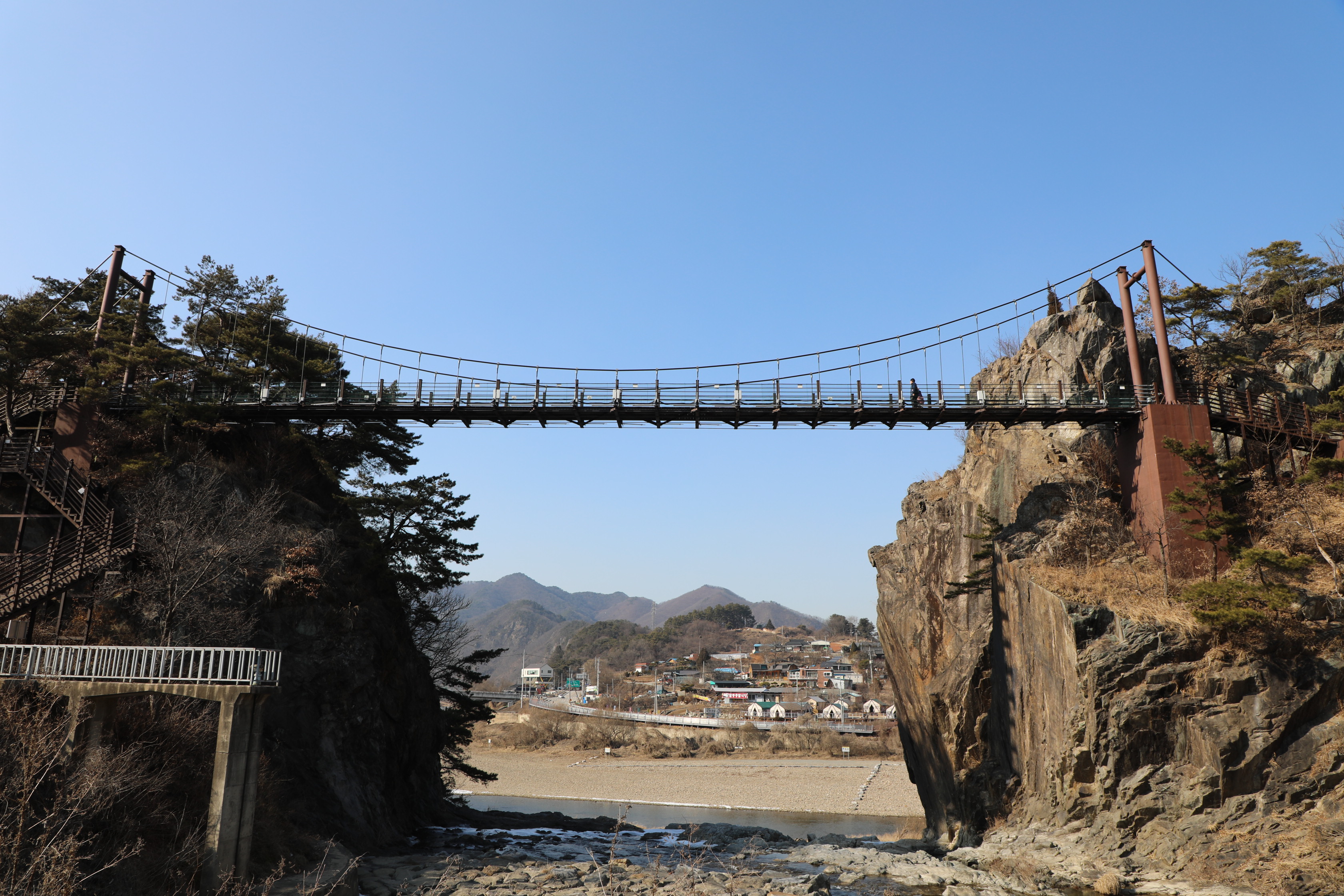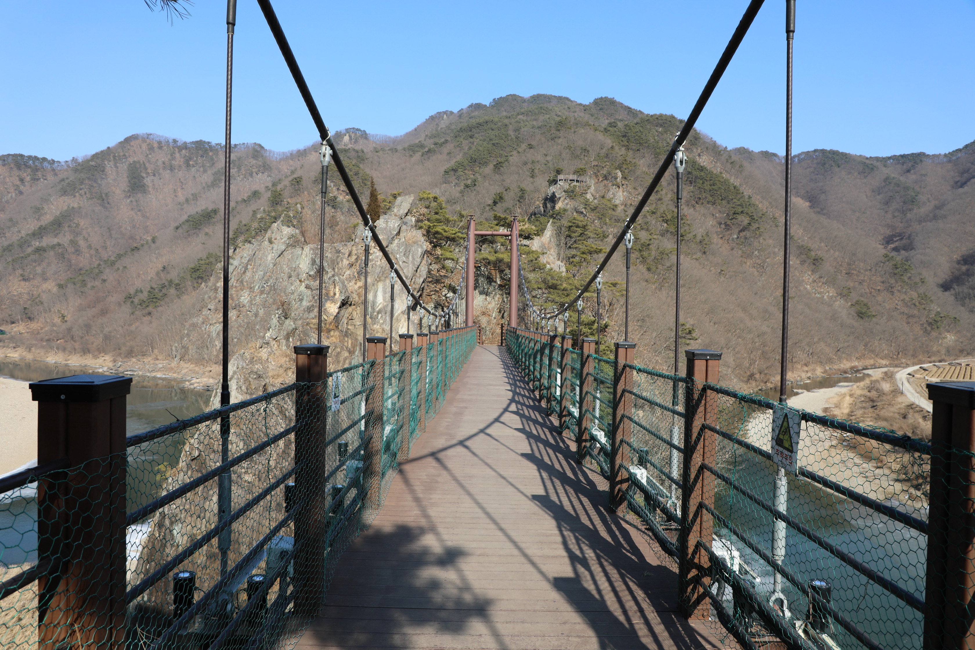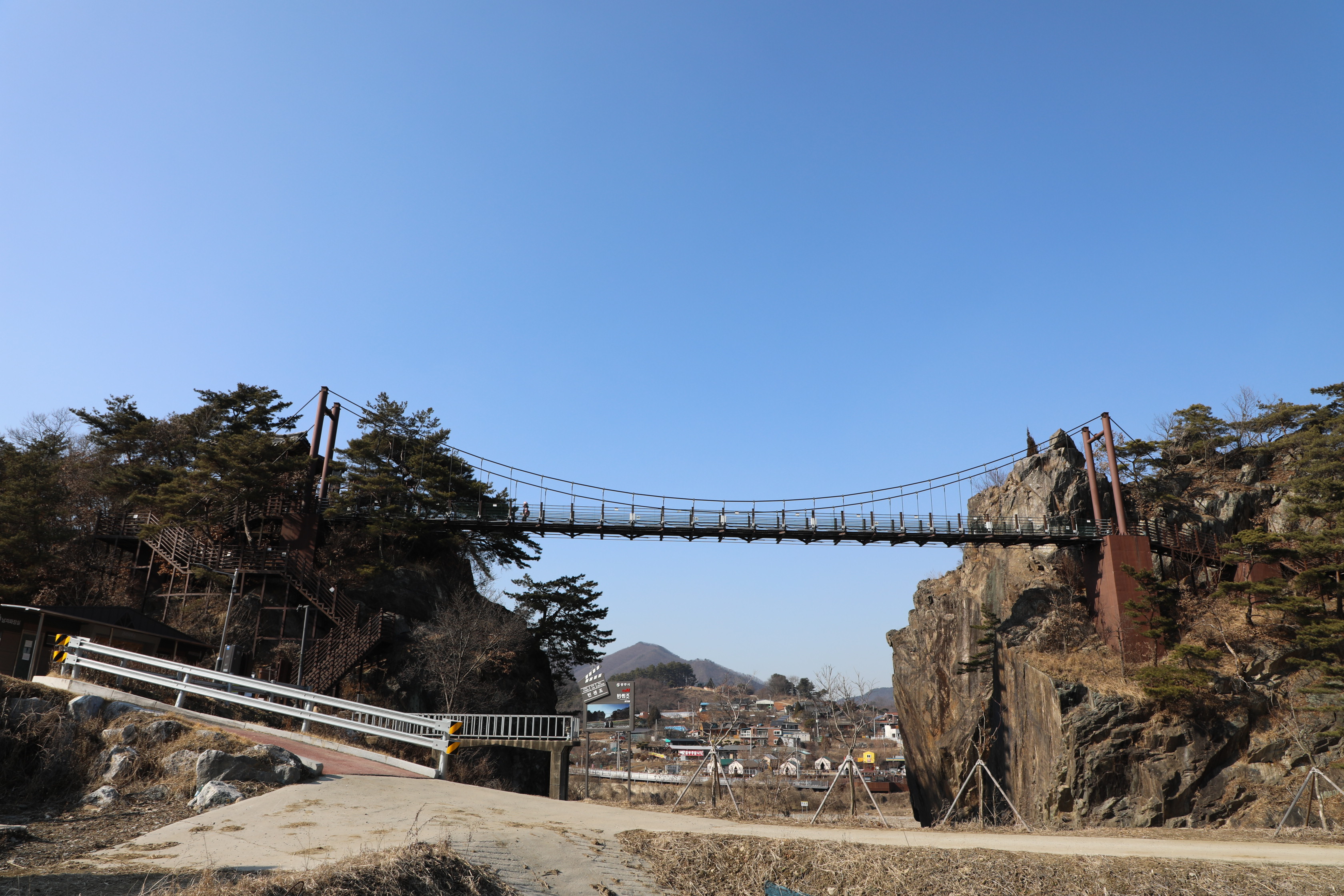 전망대에서 눈을 돌리면 석문동천을 빠져나가는 물길 위로 난 출렁다리가 보인다.