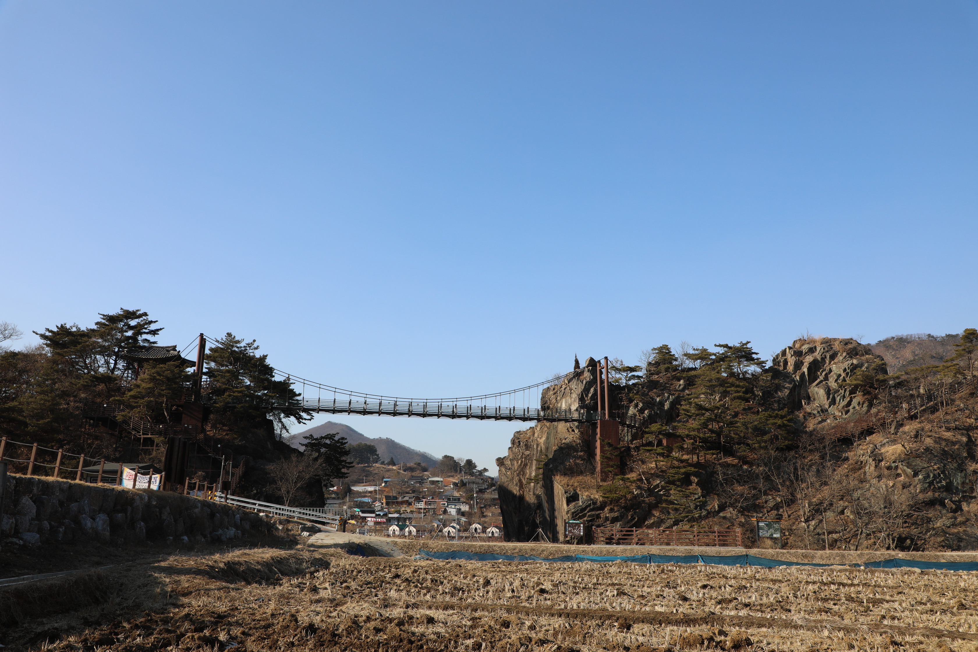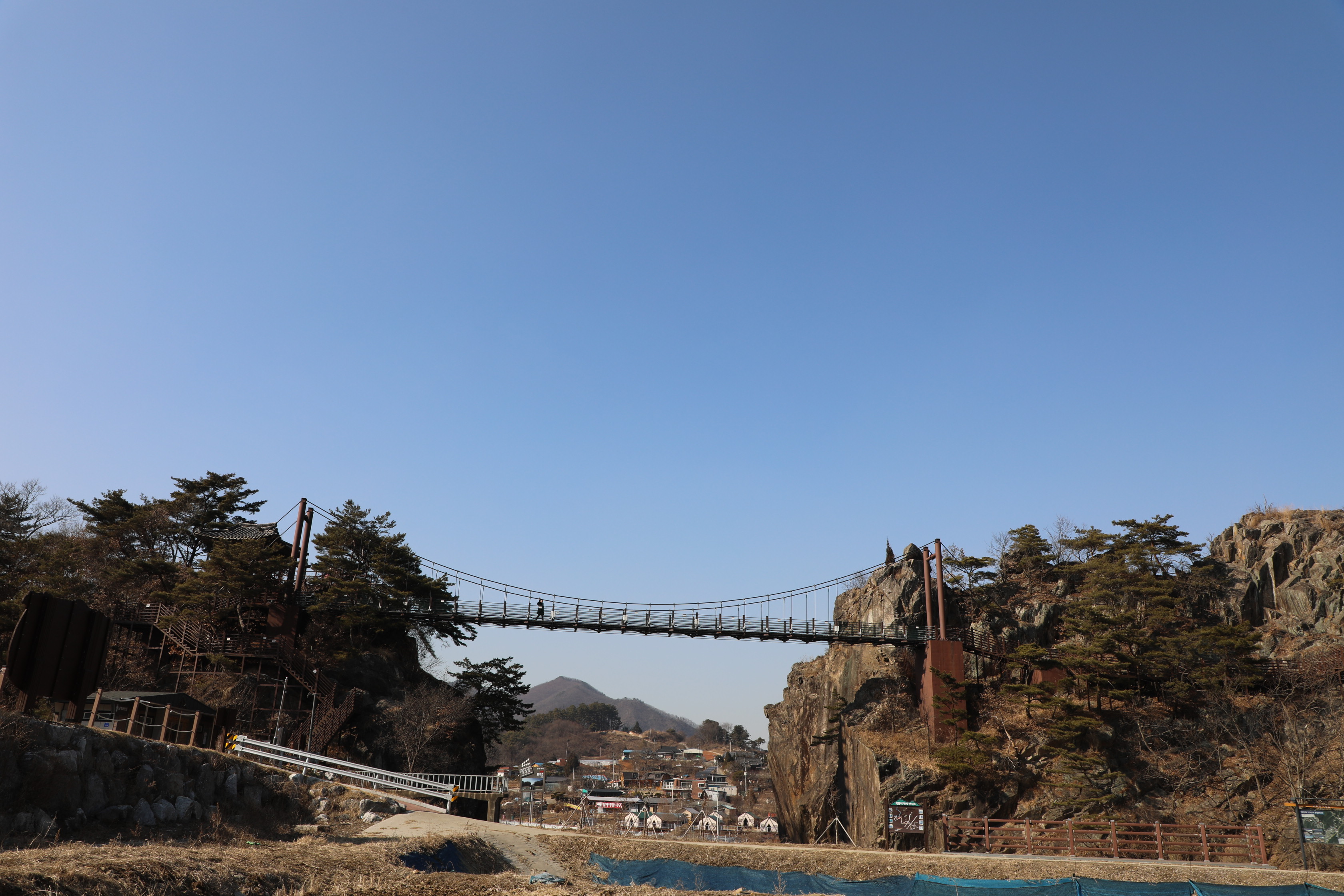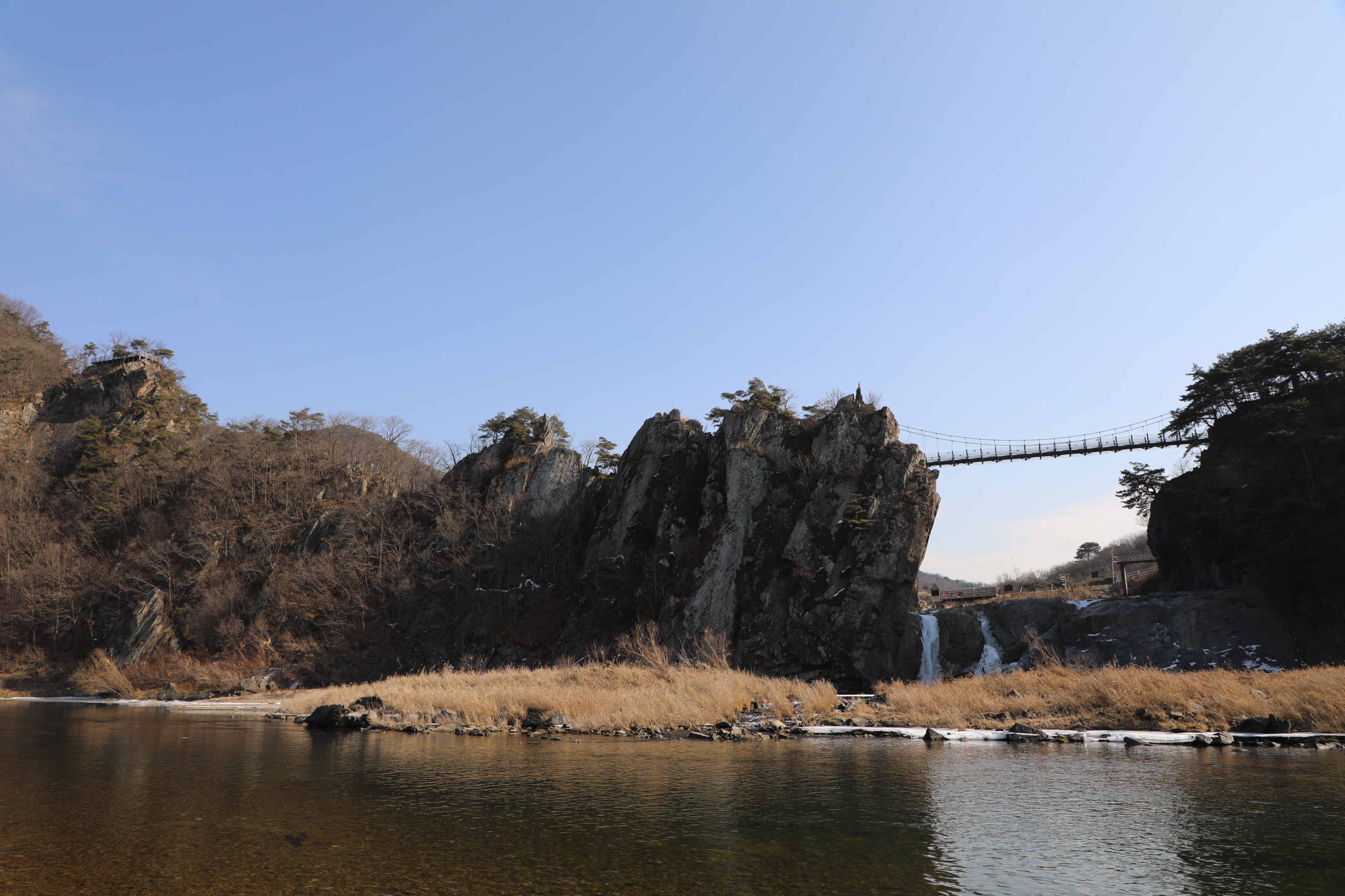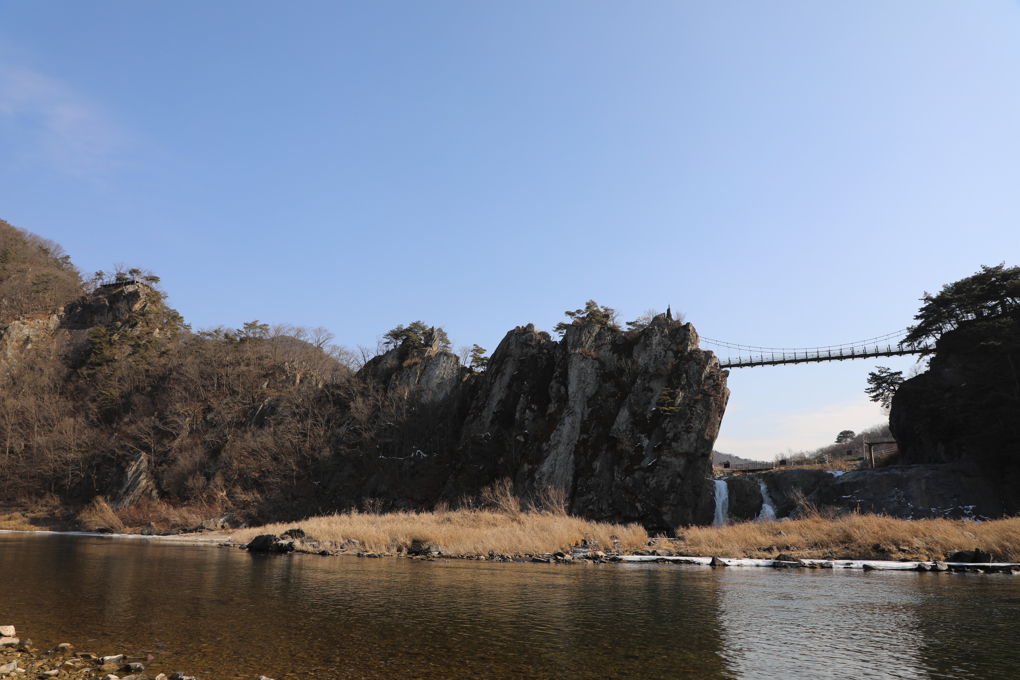 전망대에서 눈을 돌리면 석문동천을 빠져나가는 물길 위로 난 출렁다리가 보인다.