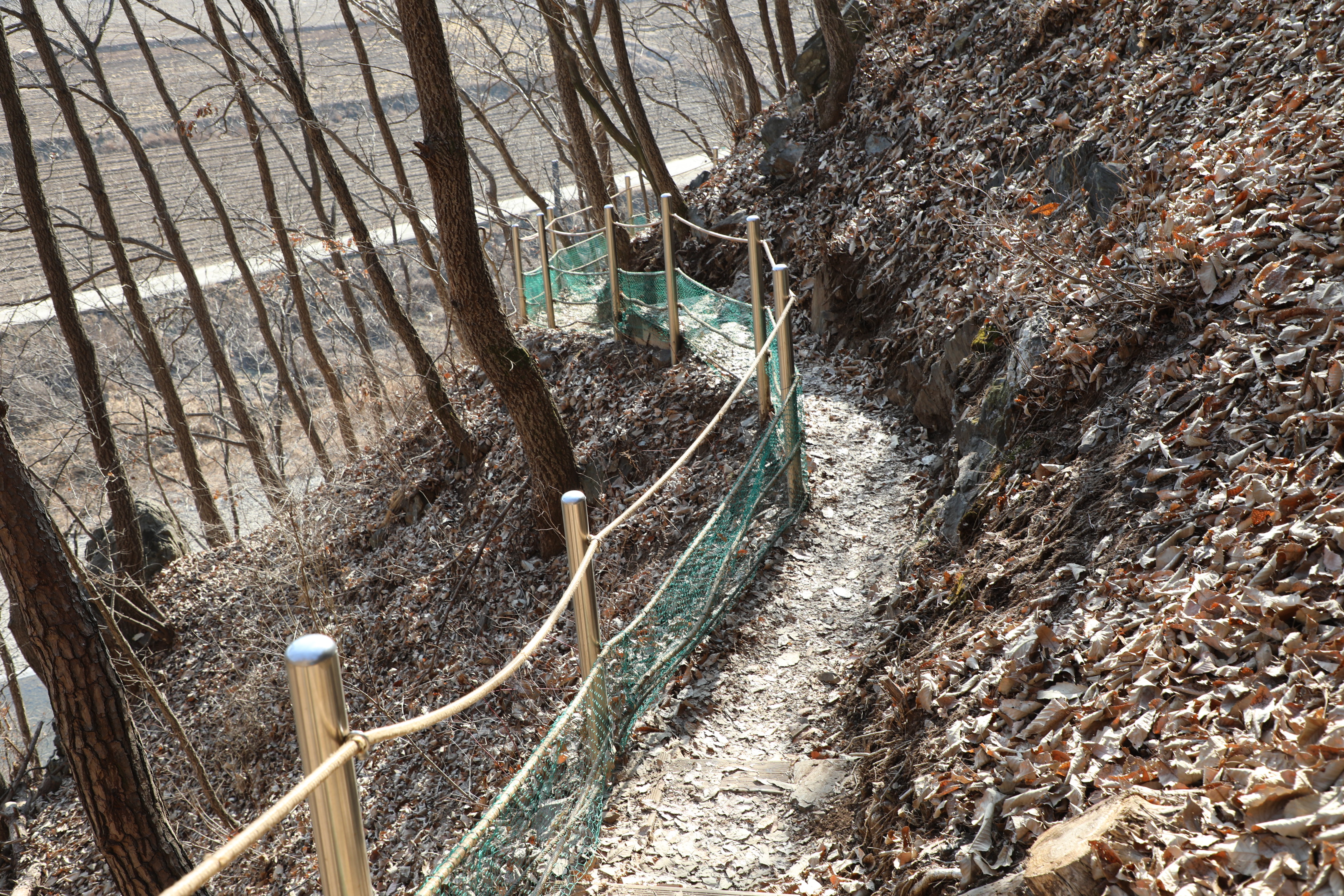 겨우내 쌓인 낙엽은 그물망에 잡혀 등산화에 치이고 밟혀 폭신폭신 부드러운 비단길을 만들었다.