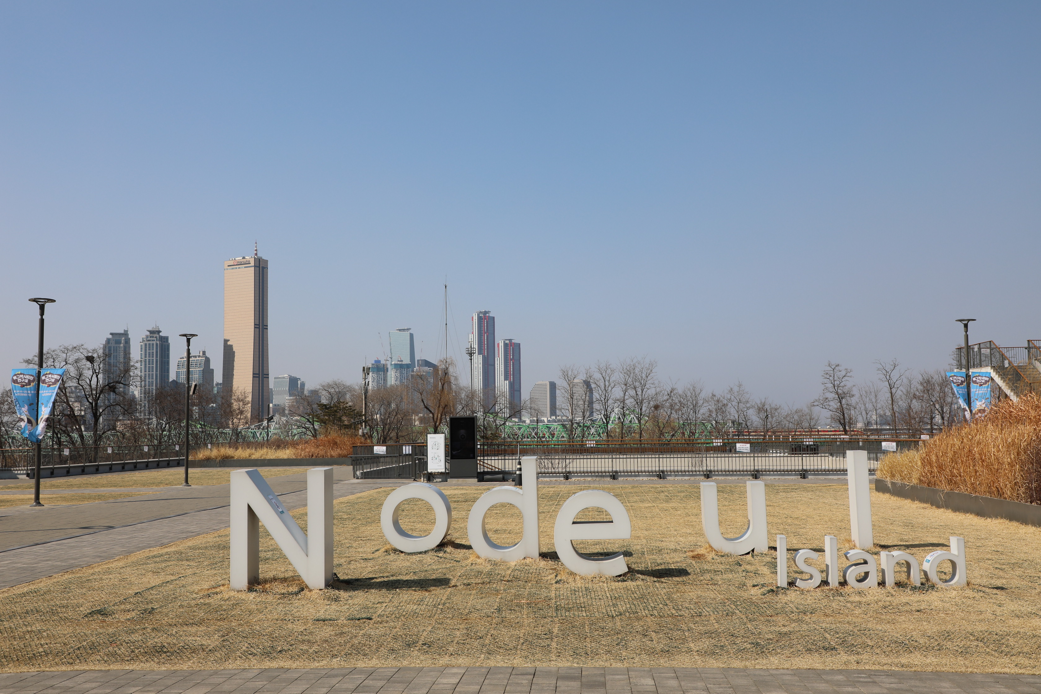 노들섬은 한강에 있는 작은 섬이라 마천루처럼 솟아오른 빌딩이 사진을 커버한다.