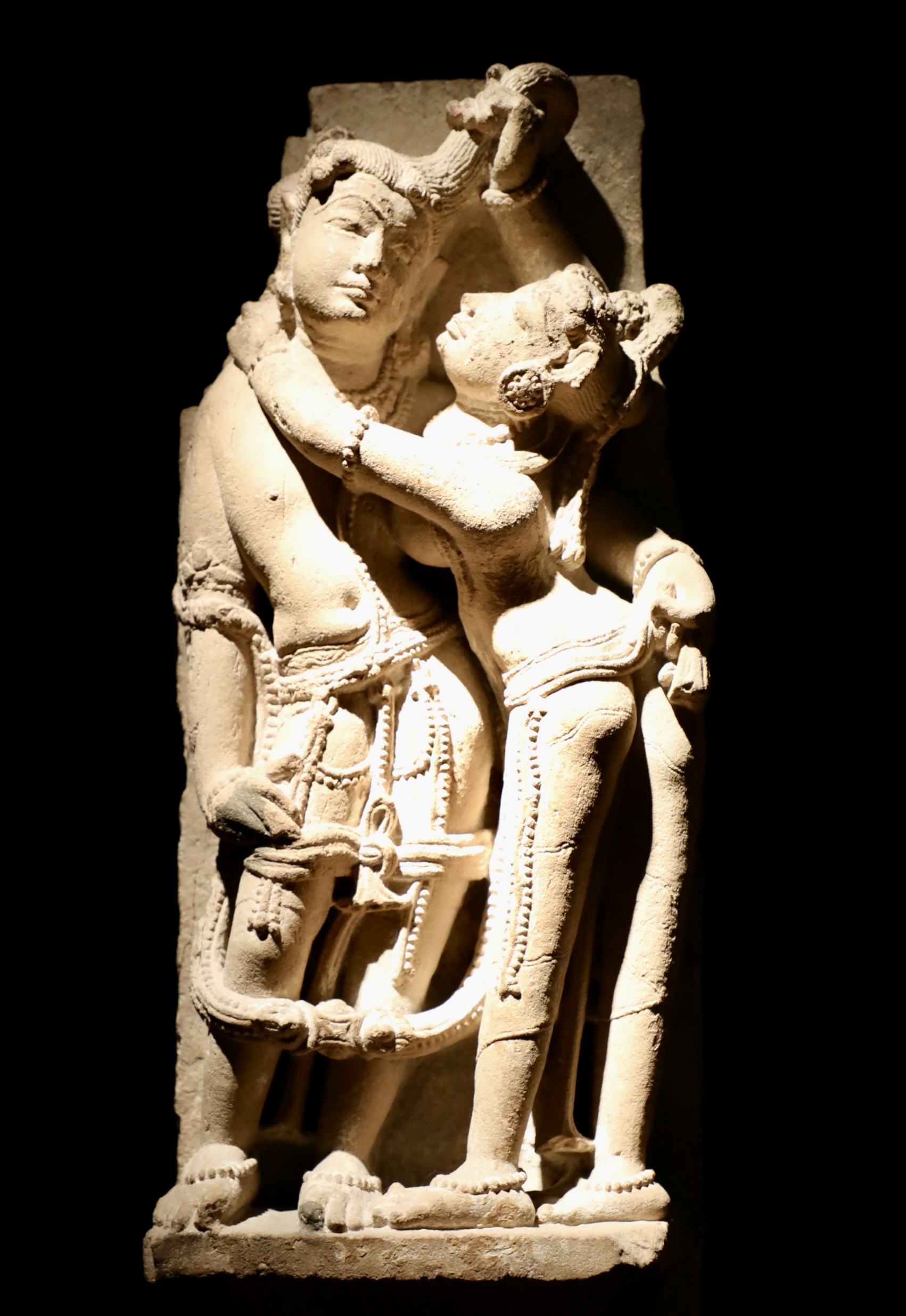 원래 사원의 벽을 장식했던 이 조각에서 남성은 여성의 허리끈을 풀고 있고,