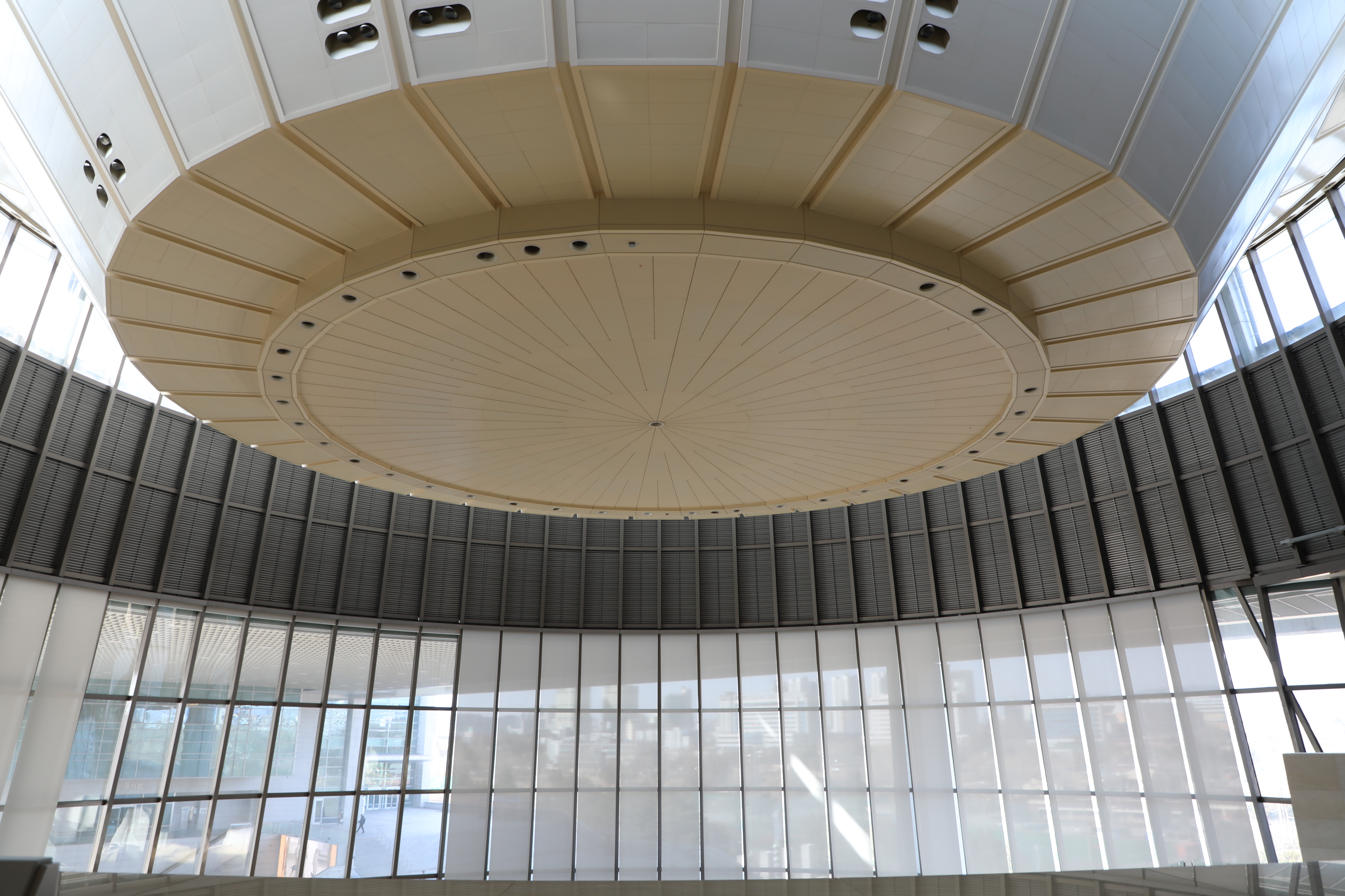 박물관에 들어서면 천장에 이렇게 거대한 달항아리 모양으로 만든 원형 돔 사이로 햇빛이 들어오게 만들었다.