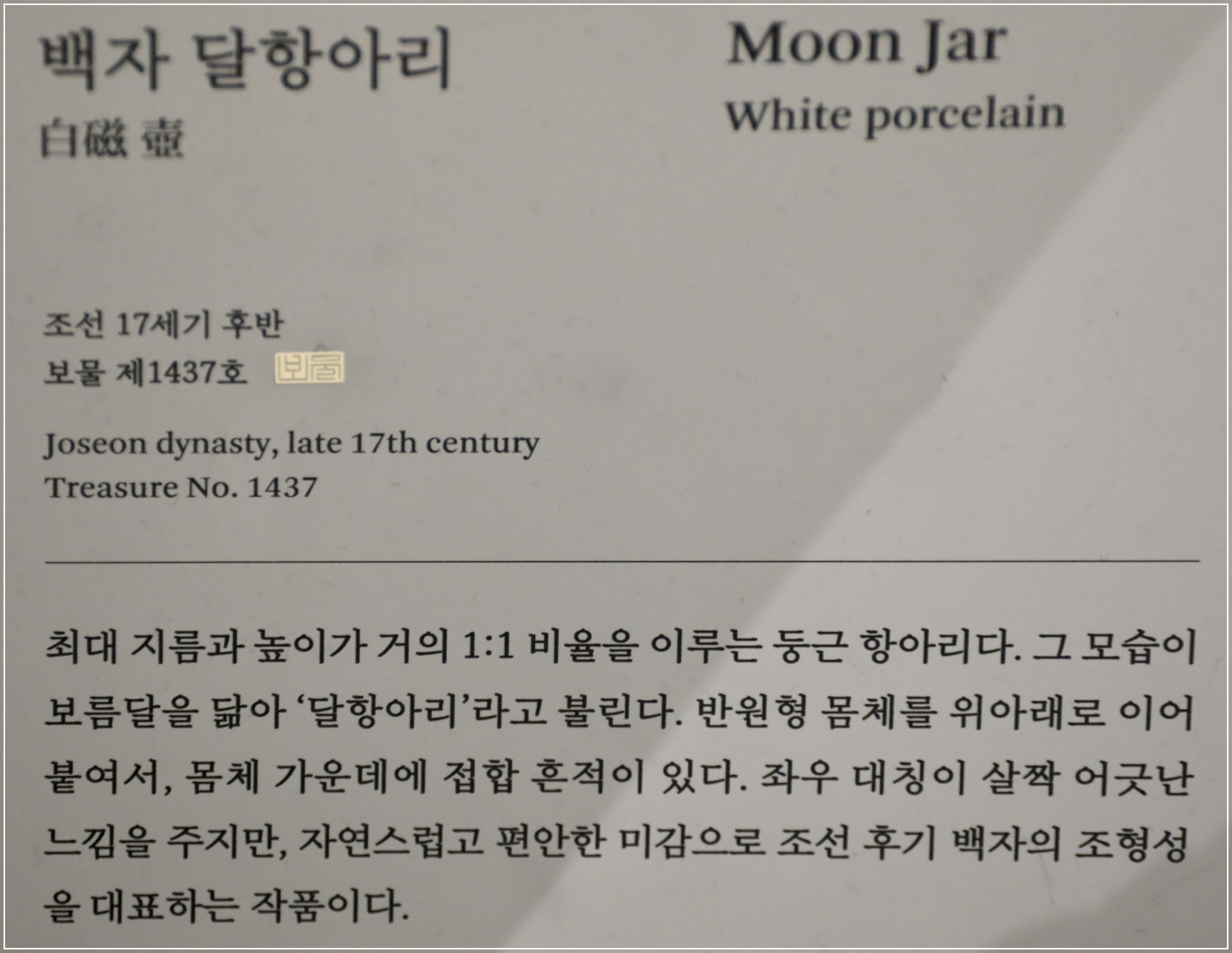 국보 백자 달항아리는 높이 43.8cm, 몸통지름 44cm 크기로 유약과 태토의 용융상태가 우수하며
