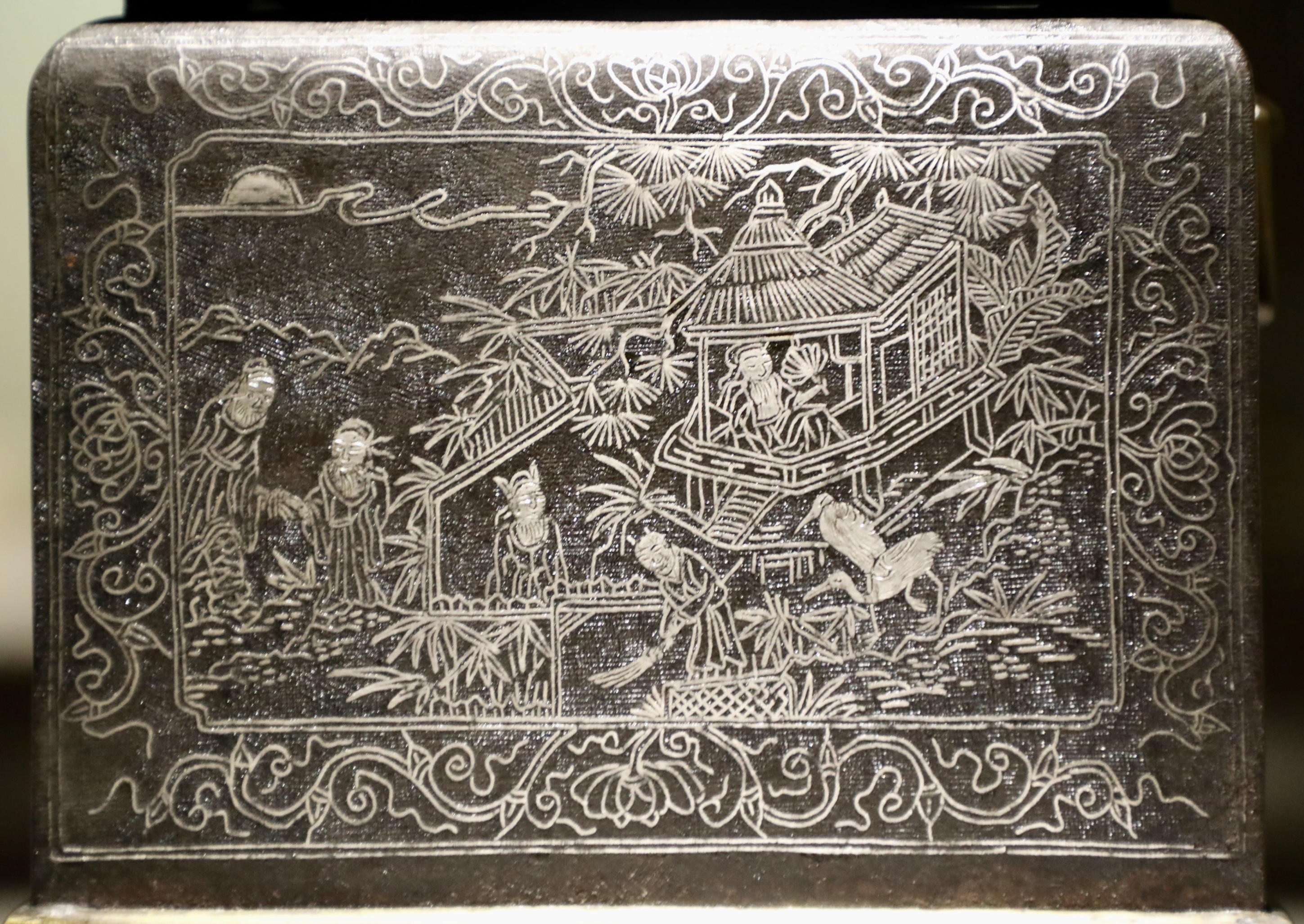 버드나무, 갈대, 오리, 기러기, 배에 탄 사람 등 각 무늬대로 홈을 판 다음 얇은 은선을 끼워 넣어 표현하였다.