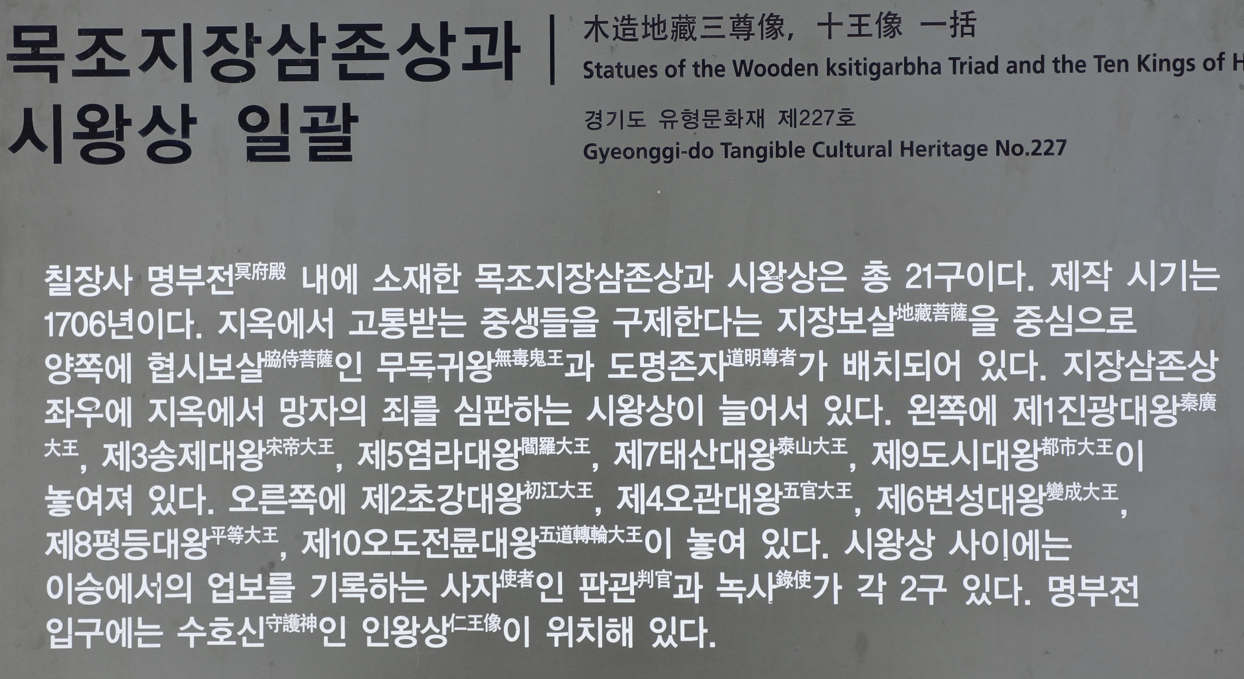 제작 연대가 분명하고 만든 스님의 이름까지 알 수 있는, 조선 시대 후기의 대표적인 중형 나무 불상 가운데 하나이다.