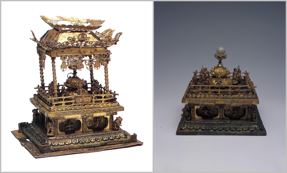 1959년에 발견된 감은사지 서 삼층석탑 내 유물(보물)인 청동제사리기와 구조가 비슷하며,