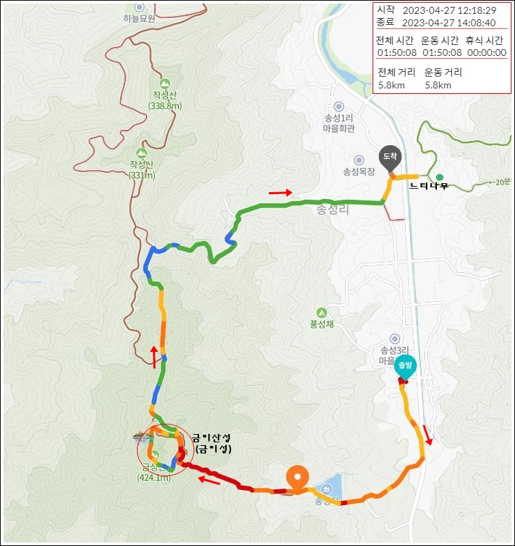 2023.4.27. (목) 12:18~14:08, 1시간 50분 산행, 5.8km 이동, 구름 조금 낌