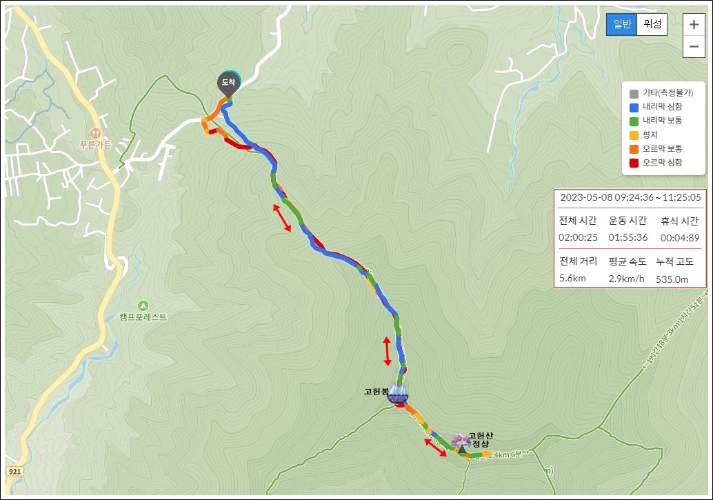 2023.5.8. (월) 09:24~11:25, 2시간 산행, 5.6km 이동, 평속 2.9km/h, 5분 휴식,