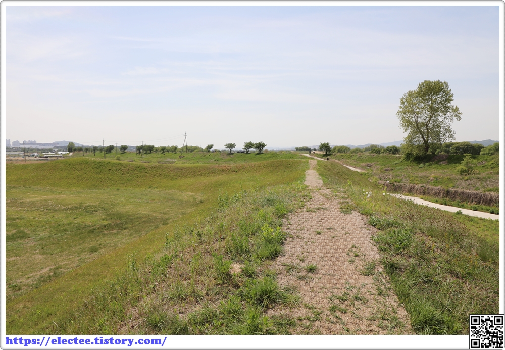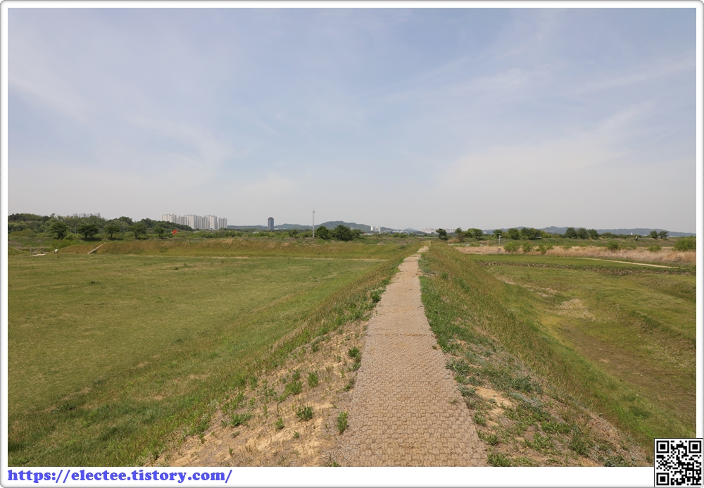 성벽 우측엔 작은 농수로가 흐르고, 제방둑 너머는 미호천이 흐른다.