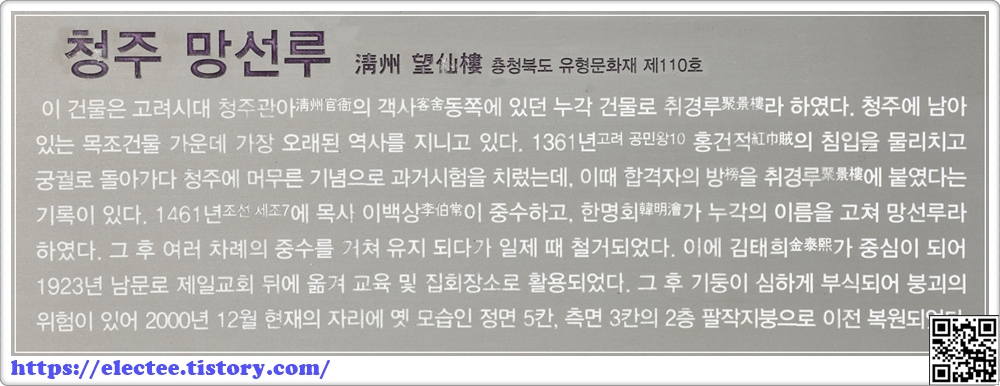 이전된 망선루는 청주지역 최초의 근대적 교육기관인 청남학교, 상당 유치원 등 민족교육 운동과 한글 강습,
