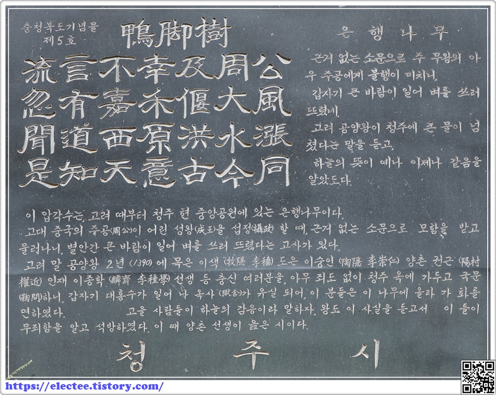 청주옥에 갇혔는데, 마침 큰 홍수를 만나 이색 등은 이 압각수(鴨脚樹)에 올라 화를 면하였다.