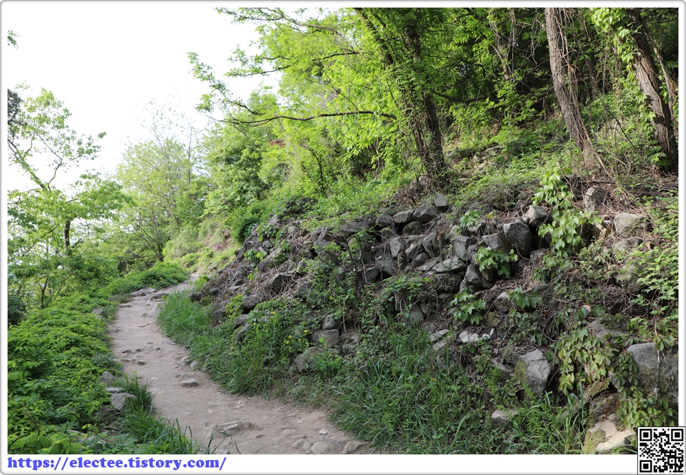 길 위쪽이나 아래에 성벽으로 쓰였던 활석이 보인다.