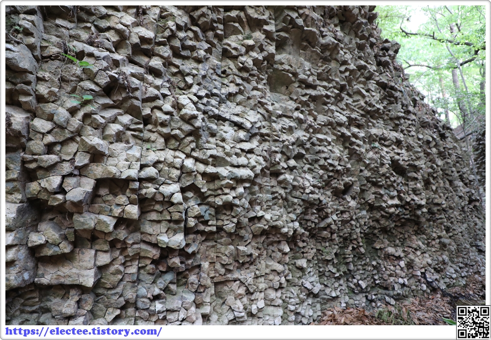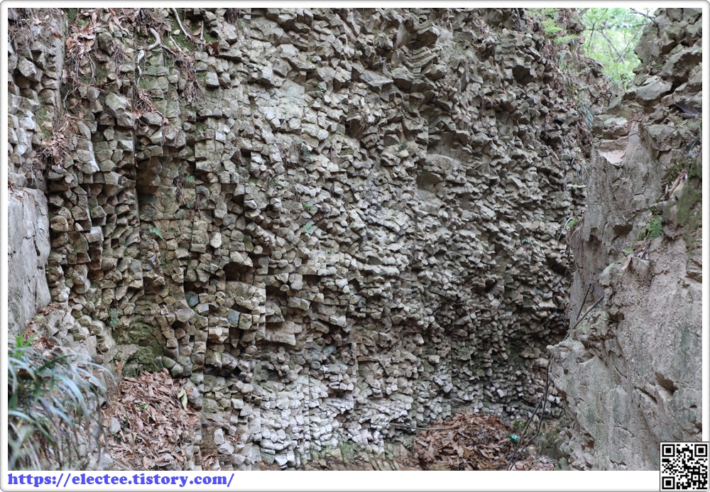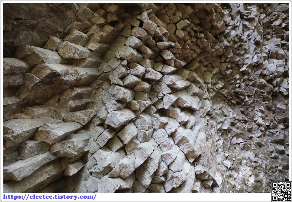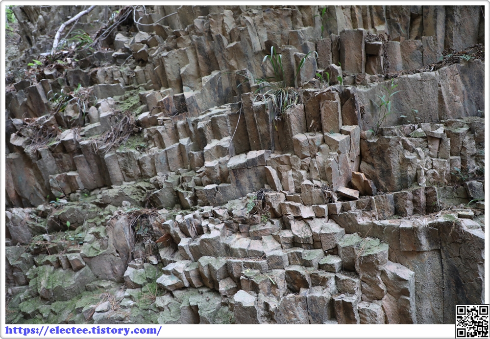 우측 상단을 보면 사각형의 상상절리가 균열을 보이고 있다.