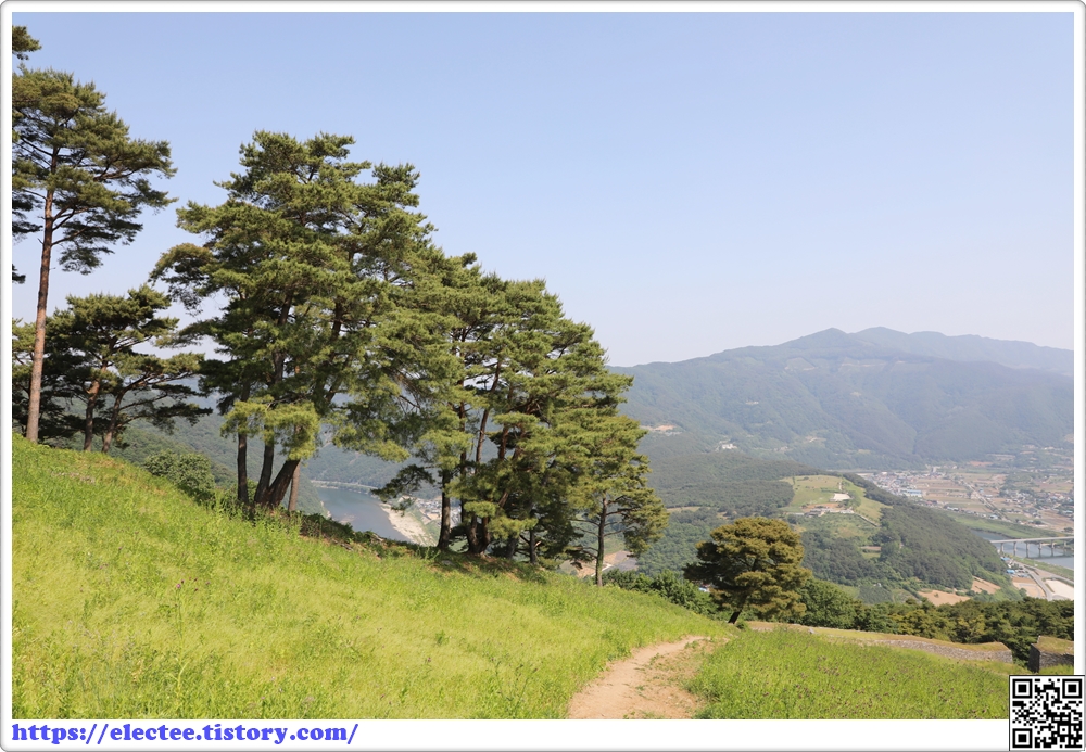 소나무와 유려한 곡선을 그리며 흐르는 온달산성은 그림처럼 아름답다.