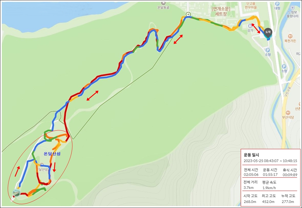 2023.5.25. (목) 08:43~10:48, 2시간 5분 탐방, 3.7km 이동, 시작 고도 268m, 최고 고도 452m