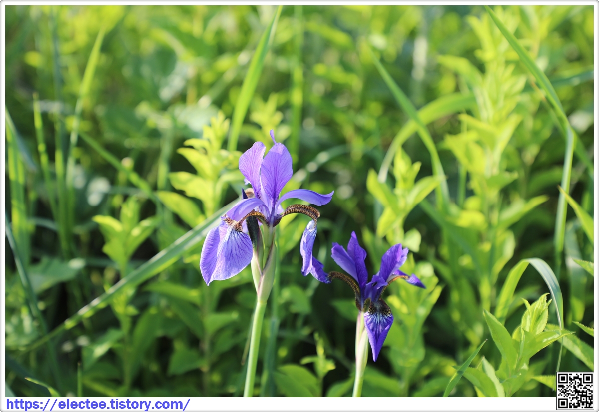 아침 햇살을 받은 보라색 붓꽃이 청초하게 느껴진다.