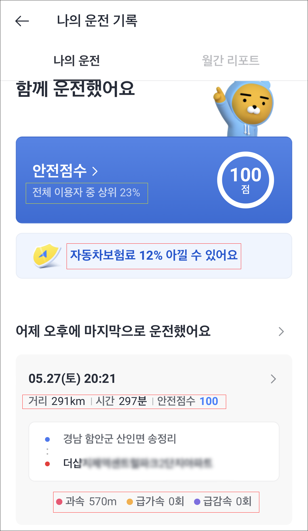 이번에 함안을 다녀오며 안전운전 한 덕분에 드디어 만점인 100점을 받았다.