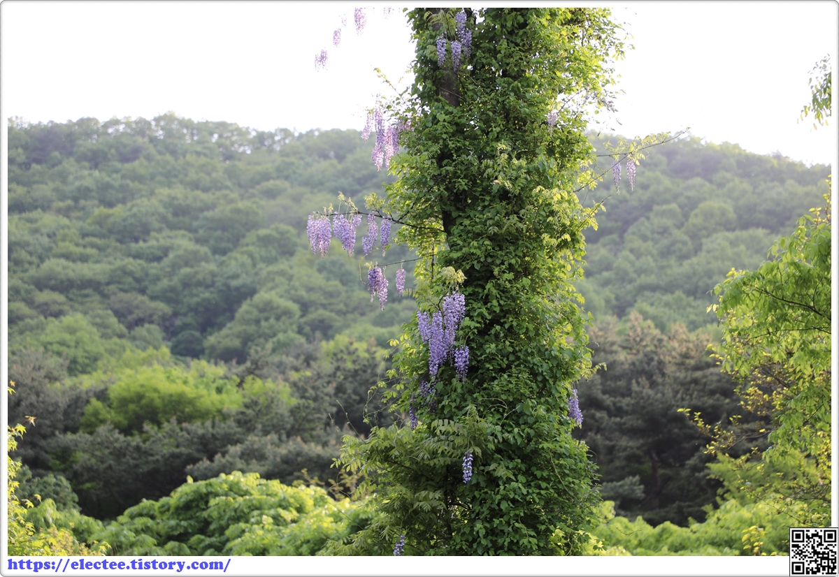 어느 고목을 타고 오르는 등나무 꽃이 인상적이다.