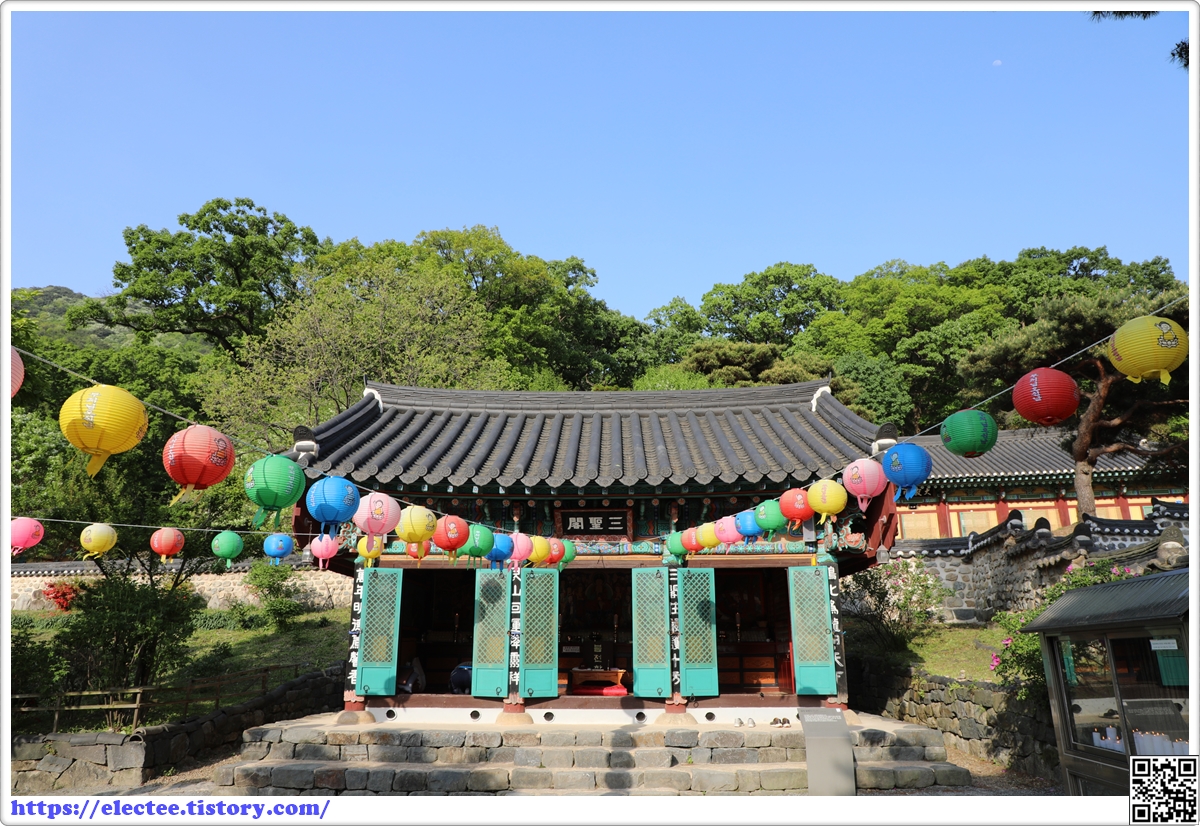 삼성각은 대웅전 우측 자연석 기단 위에 자리하고 있으며 정면 3칸 측면 2칸의 겹처마 맞배지붕이다.